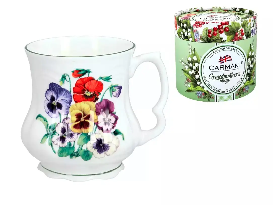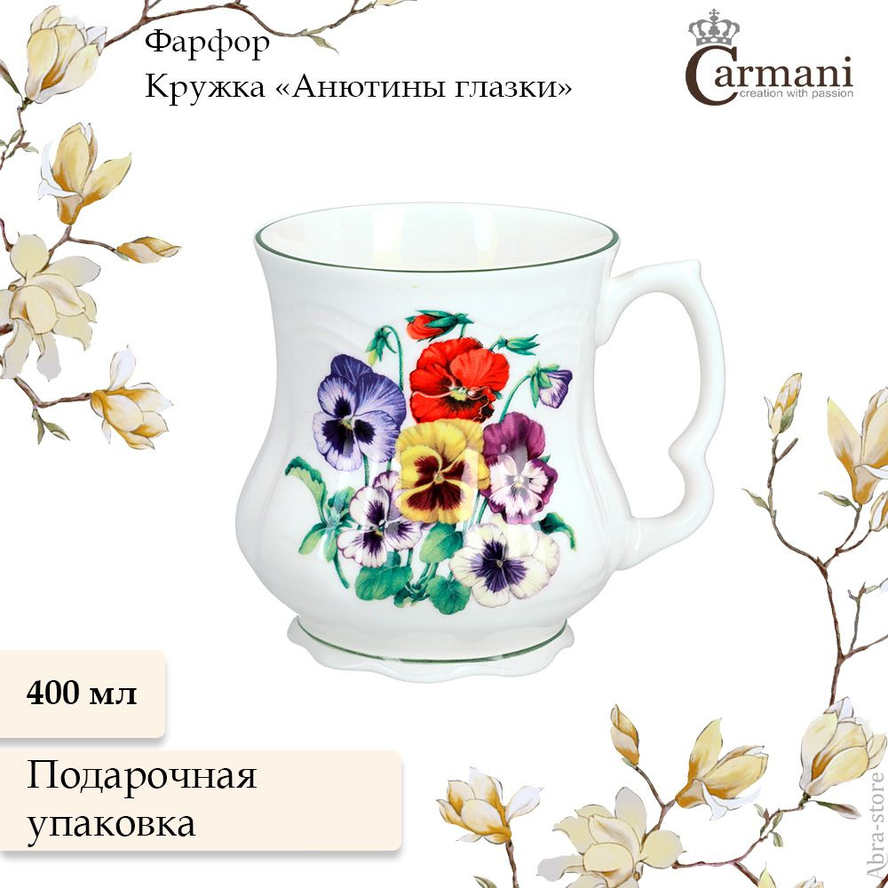 Кружка фарфоровая белого цвета с рисунком и окантовкой Carmani Анютины Глазки 400 мл