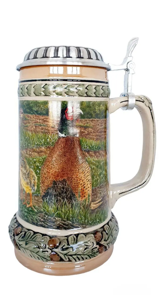 Изготовленная из прочной керамики с декоративными элементами из олова, кружка оформлена объёмным изображением глухаря — символа северных лесов, гордости и силы. Натуральная фактура, охотничья тематика и глубокая цветовая гамма делают её выразительным дополнением к интерьеру домашнего бара или кабинета.