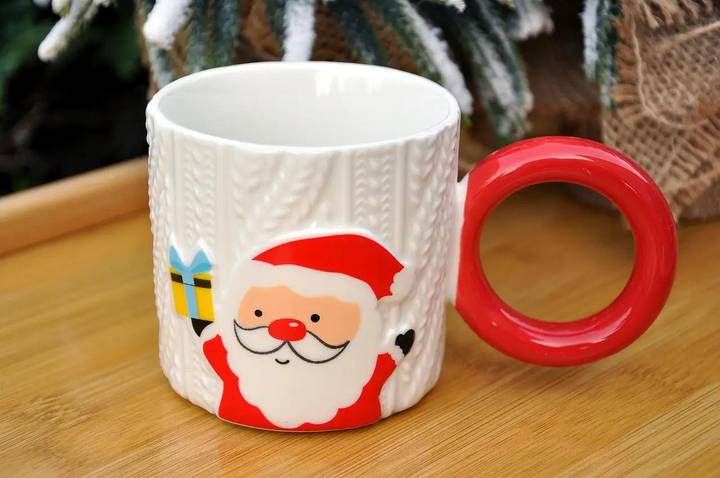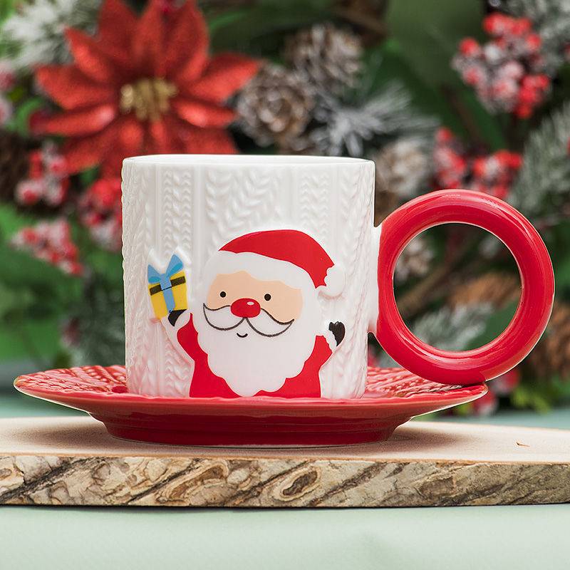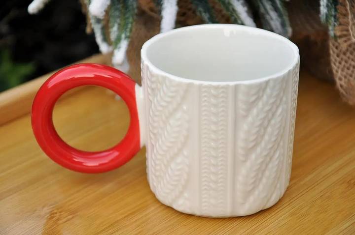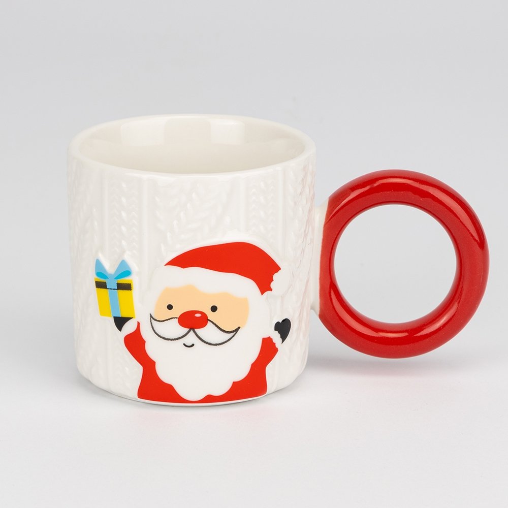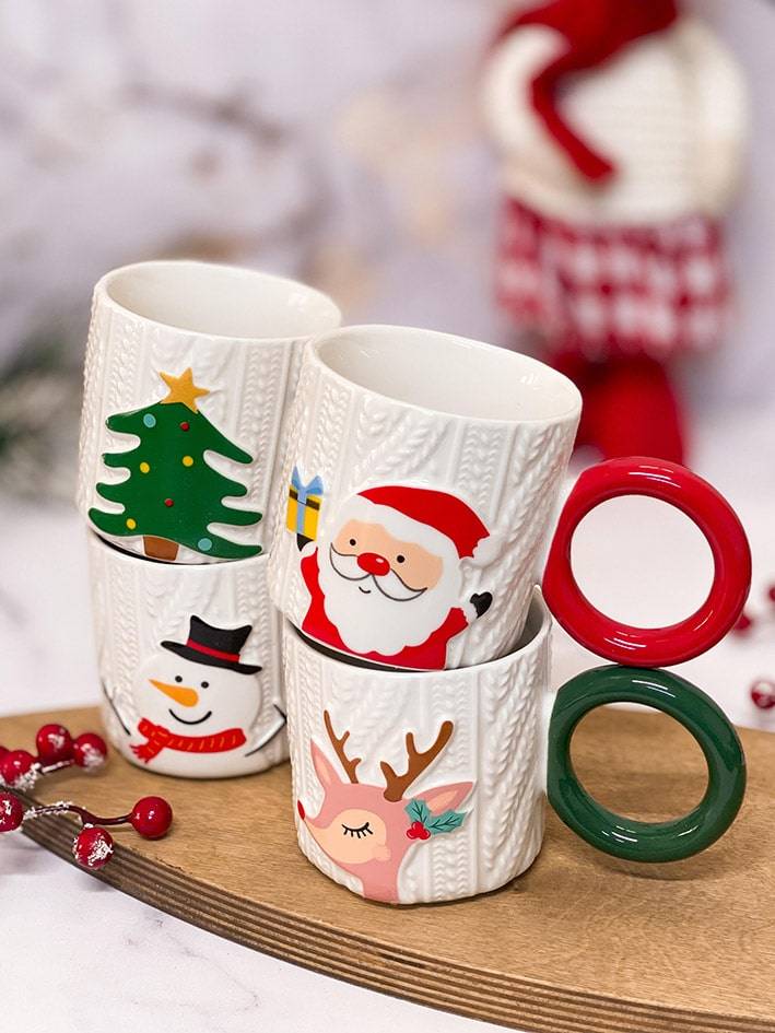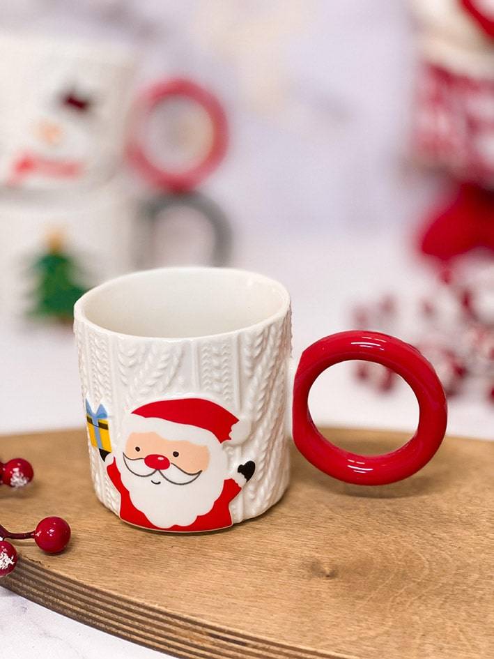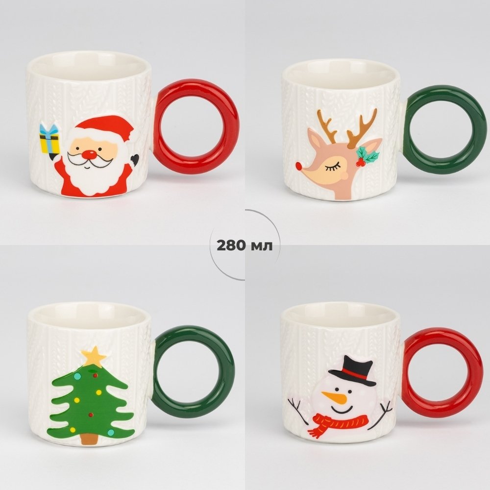 Белые керамические кружки из коллекции Knit Joy Mugs соединяют объёмный «вязаный» рельеф корпуса и яркую кольцевую ручку глянцевого красного или зелёного цвета. На лицевой стороне — крупные праздничные персонажи: Санта, оленёнок, ёлка, снеговик. Объём 280 мл дарит идеальную порцию для утреннего кофе, ароматного чая или густого какао — каждый день с ноткой зимнего праздника.