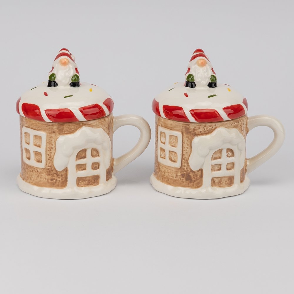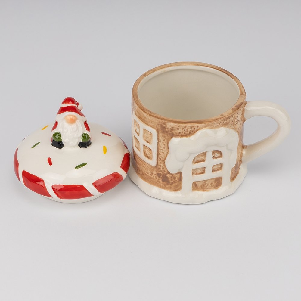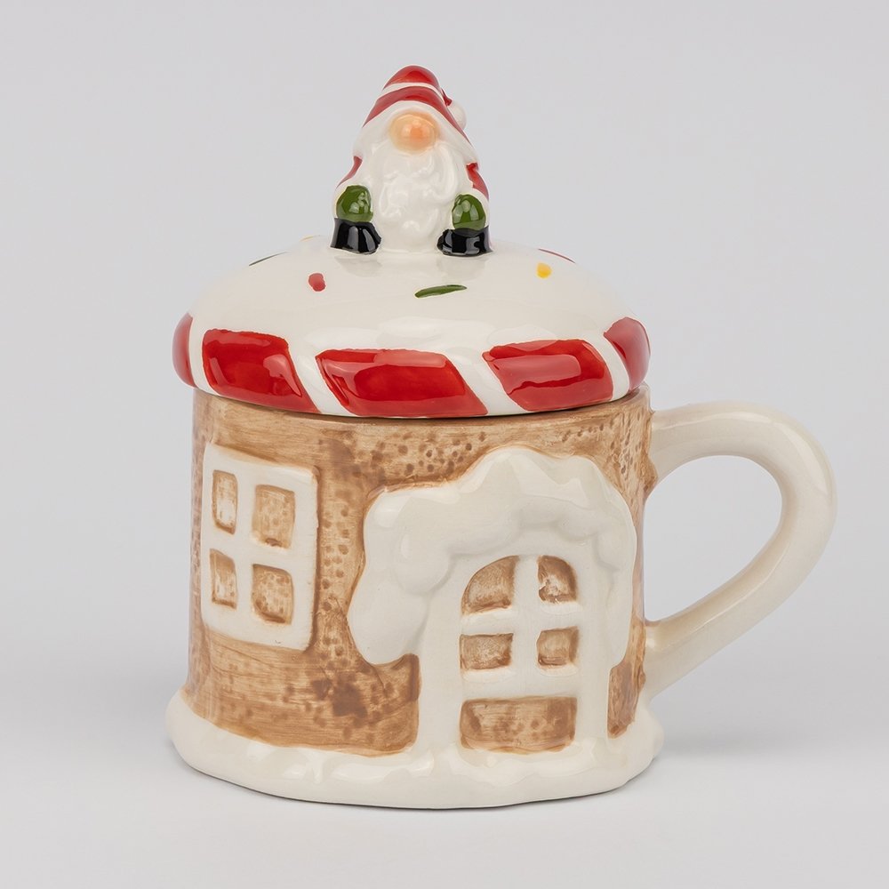 Кружка «Пряничный домик» — стильный и уютный вариант для зимних вечеров с крышкой в комплекте. Форма кружки напоминает маленький домик, украшенный снежными окнами и дверью, а крышка выполнена в виде крыши с гномом. Такой дизайн создаёт атмосферу уюта и праздника, но остаётся лаконичным и аккуратным.