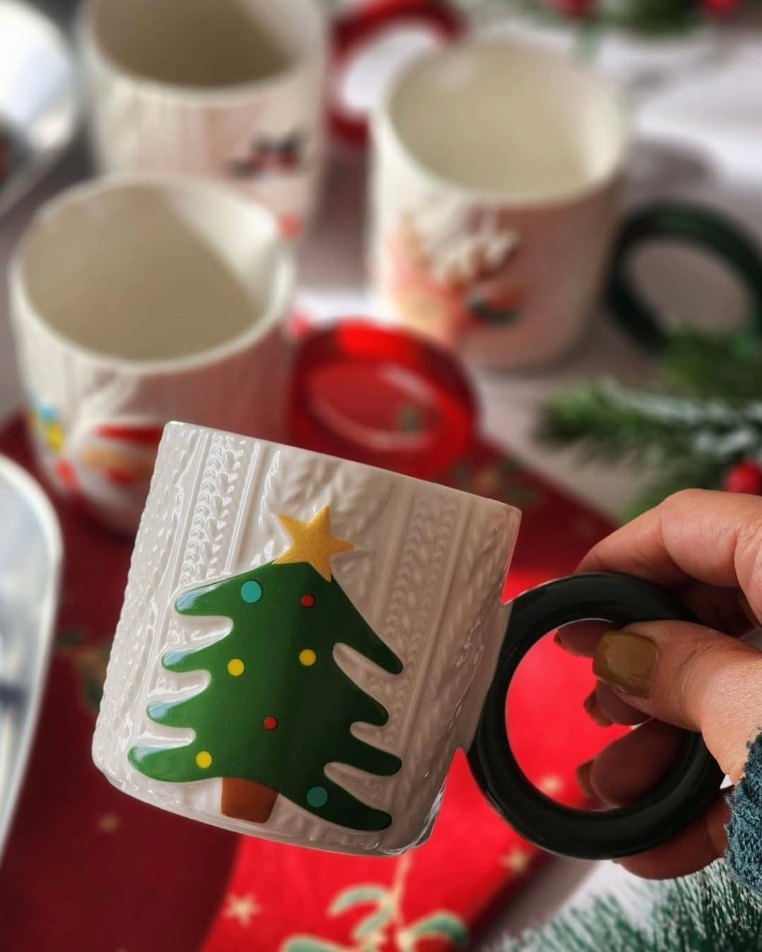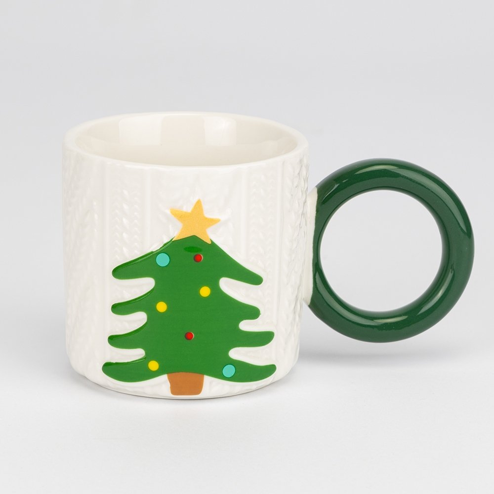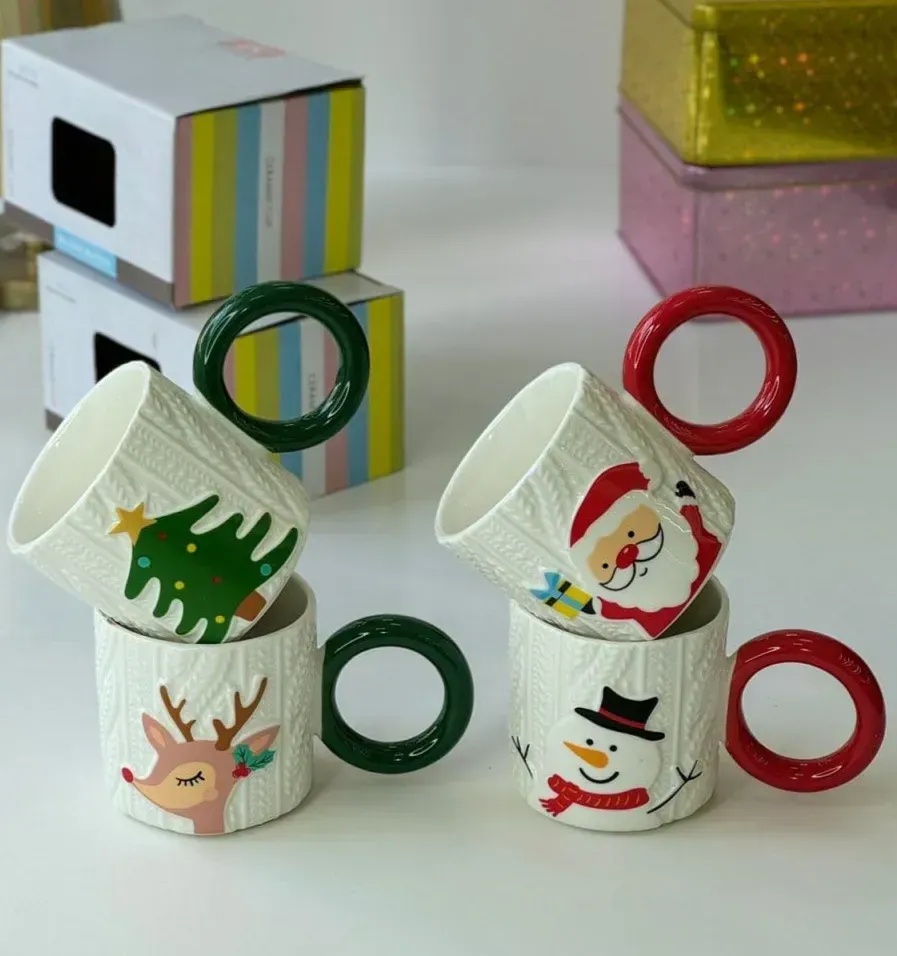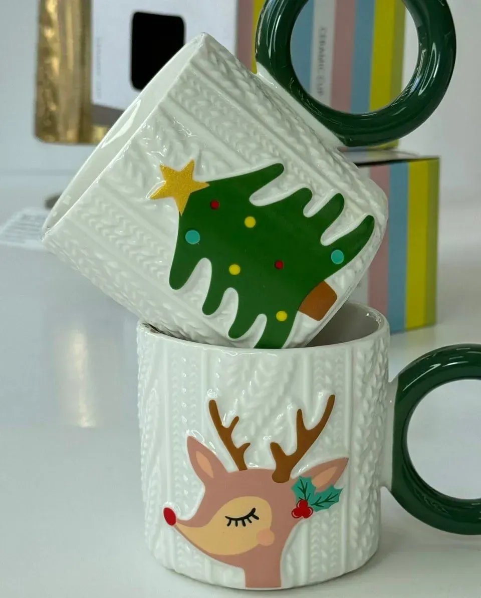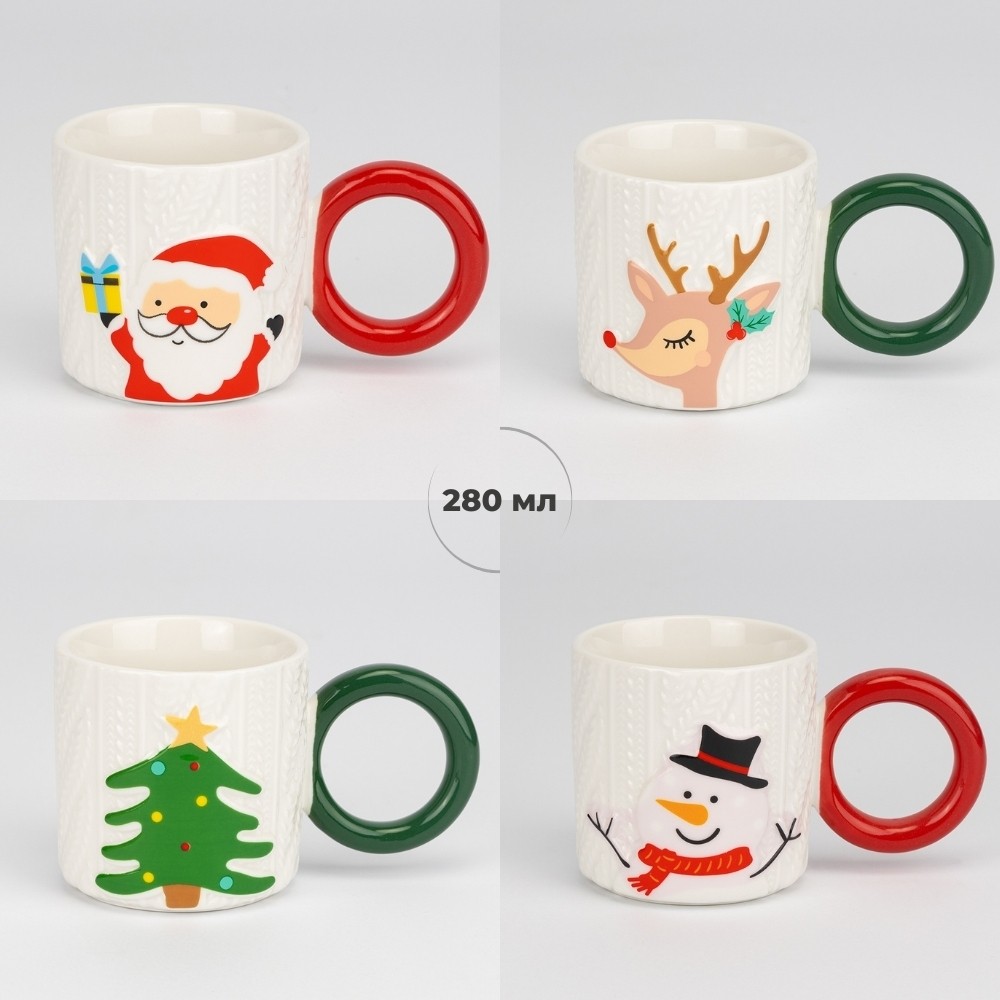 Білі керамічні горнятка з колекції Knit Joy Mugs поєднують об’ємний «в’язаный» рельєф корпусу та яскраву кільцеву ручку глянцевого червоного або зеленого кольору. На лицьовій стороні — великі святкові персонажі: Санта, оленя, ялинка, сніговик. Об’єм 280 мл дарує ідеальну порцію для ранкової кави, ароматного чаю чи густого какао — щодня з ноткою зимового свята.