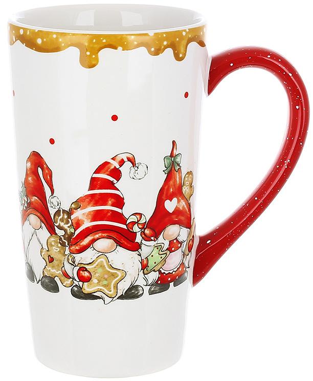 Керамическая посуда с сочным, ярким дизайном. Гномики в ярких красных чепчиках с пряниками в руках.