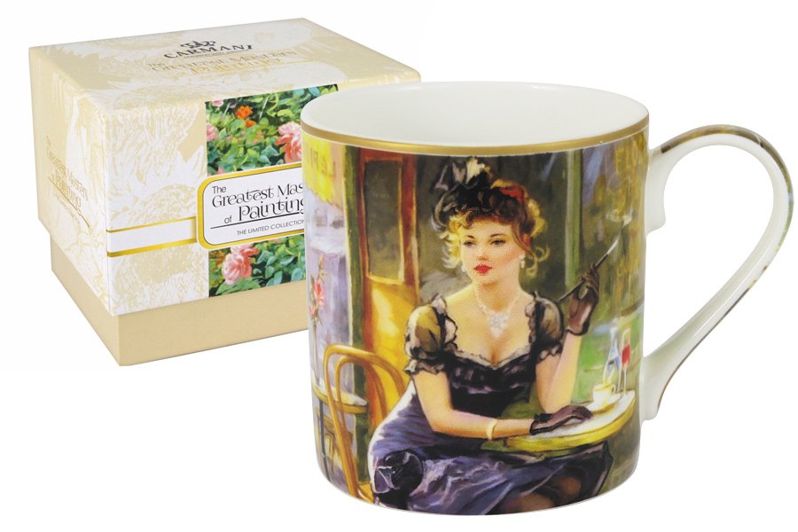 Фарфоровая кружка от австралийской марки стильного дизайна, на кружке изображена элегантная дама за столиком в яркий весенний или летний день репродукция картины Пьера-Огюста Ренуара "Дама за столиком". ТМ Carmani уделяет особое внимание качеству своих товаров и отдает дань уважения традициям гончарства разработанными годами.