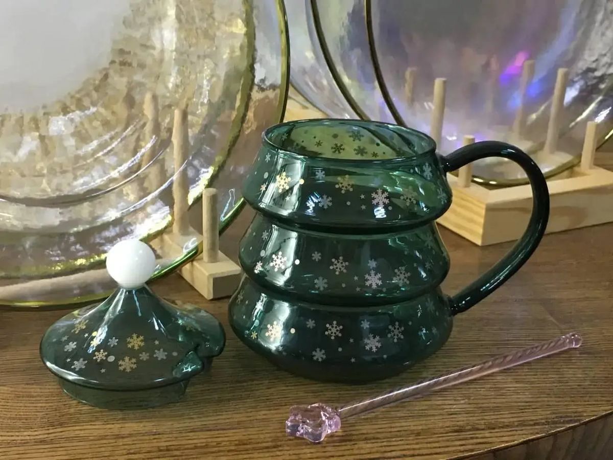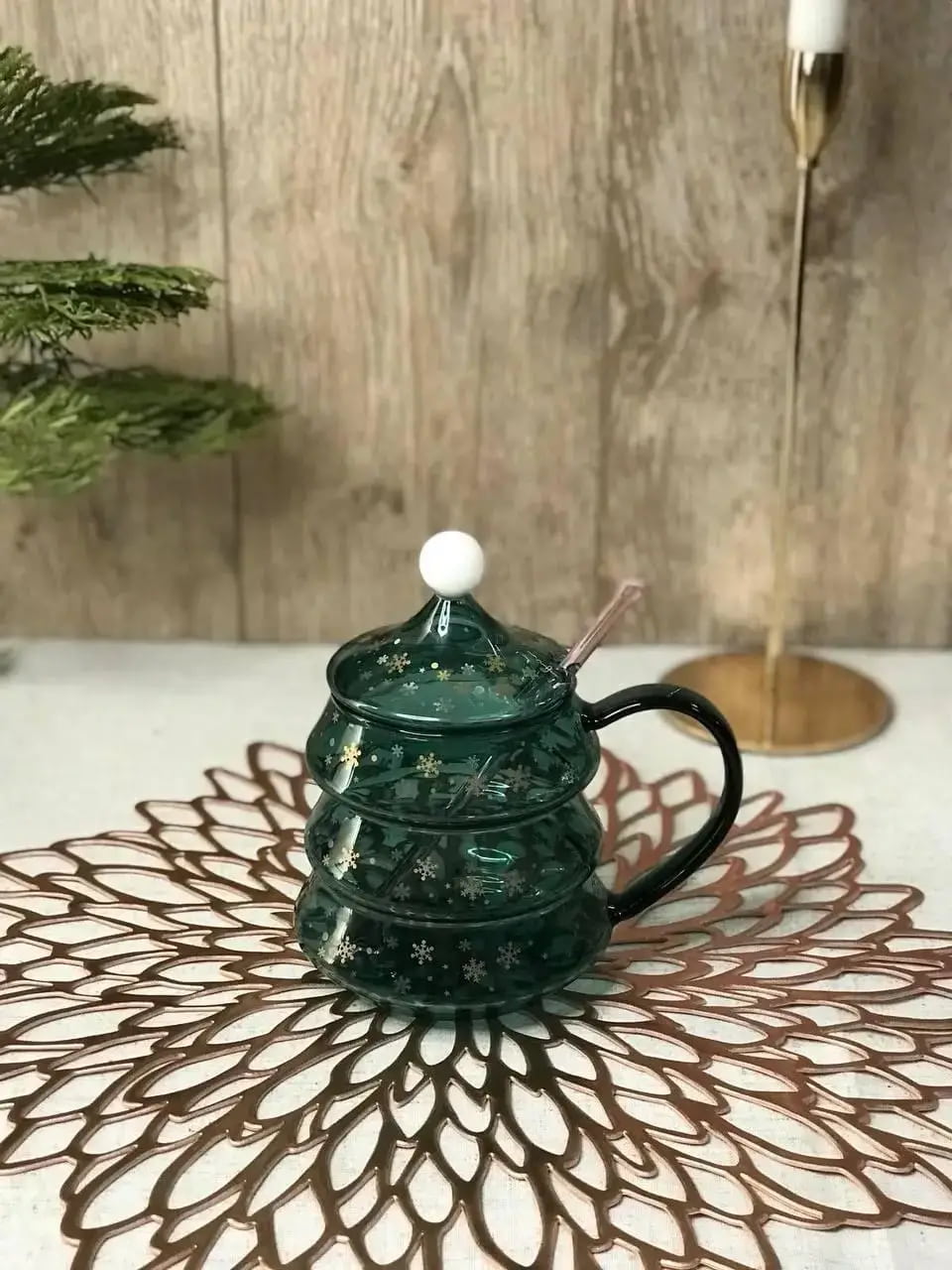 Кружка с крышкой и ложкой стеклянная Елка 550 мл