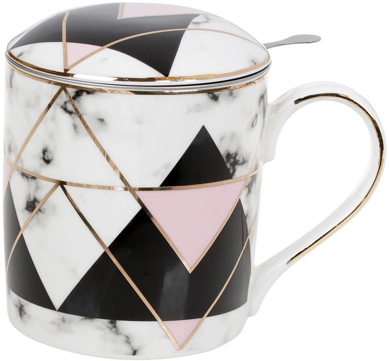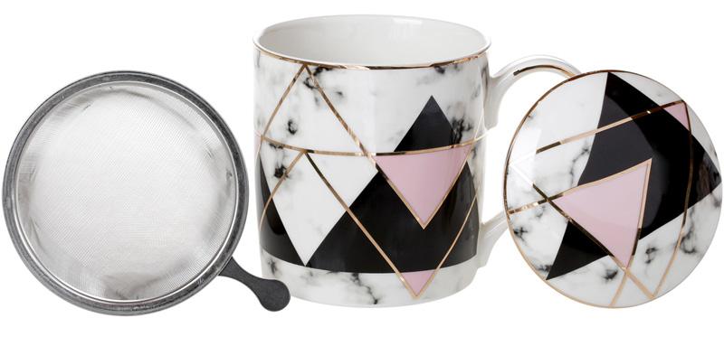 Об'єм 380мл - цей кухоль призначений для заварювання чаю та ароматних трав. Якісно виконана, стійка деколь із геометричним декором у чорно-рожевому кольорі та золотими елементами. Фон - чорний мармур.