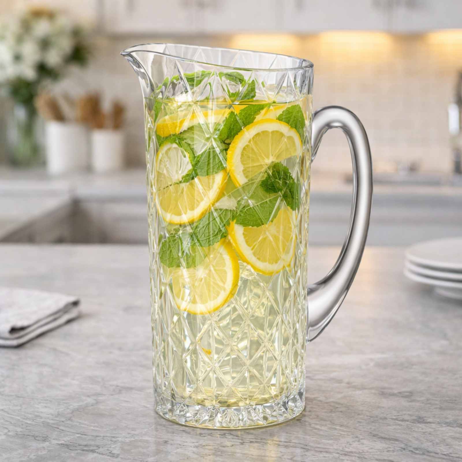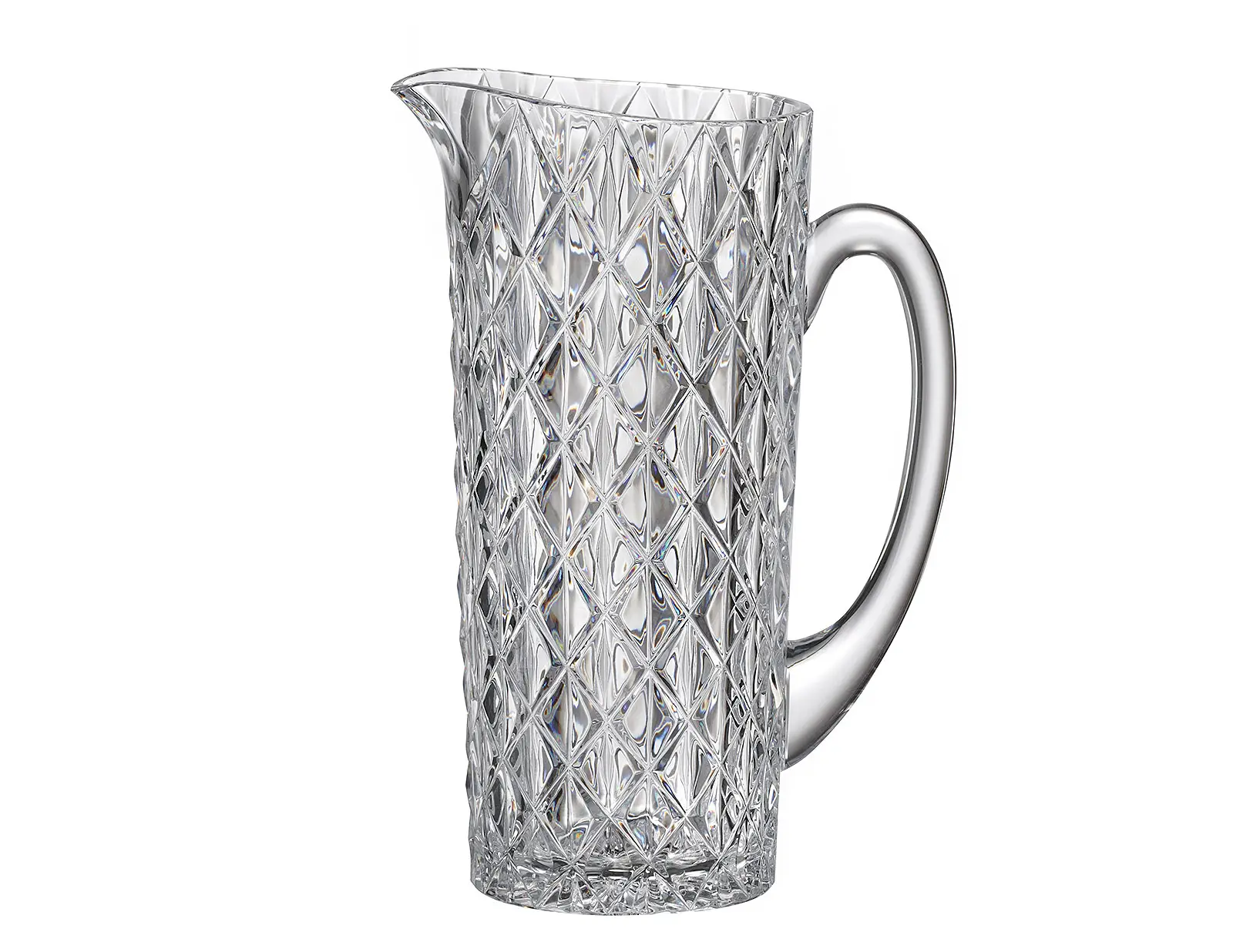 Кувшин из экохрусталя прозрачный Memphis 1,15 л привлекает внимание выразительным ромбовидным рельефом, который полностью покрывает поверхность и создаёт эффектную игру света. Чёткие грани подчёркивают глубину узора и чистоту материала, благодаря чему кувшин выглядит объёмным и визуально насыщенным. Аккуратный носик обеспечивает плавное и контролируемое наливание, сохраняя эстетичный вид сервировки.