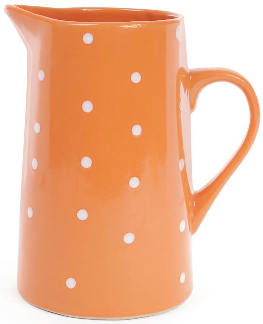 Кувшин керамический Белый горошек для воды, компота, молока, лимонада, вина и других безалкогольных и слабоалкогольных напитков, Объем 1000мл (1л), Красивая и яркая посуда для напитков, Классический керамический кувшин ровной формы с носиком для аккуратного разлива и удобной ручкой, Цвет: оранжевый в мелкий белый горошек,