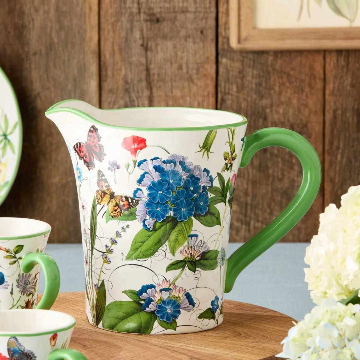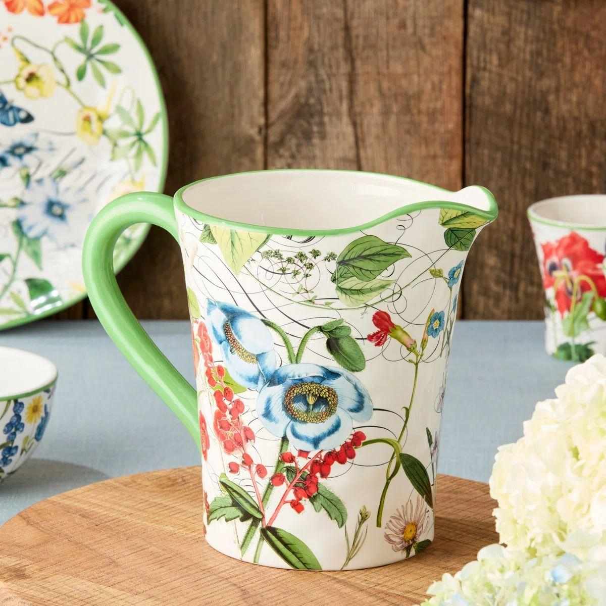 Этот керамический кувшин с ярким цветочным узором моментально добавляет свежести и красок в вашу кухню и делает подачу напитков особенно привлекательной. Объём 2,8 литра позволяет удобно подавать воду, лимонад, морсы или компоты для большой компании. Сочные цветы, зелёный кант и лёгкие бабочки создают ощущение лёгкости и летнего настроения за любым столом. Посуду можно мыть в посудомоечной машине; не рекомендуется использовать средства для очищения с абразивными частицами. Прочная керамика прекрасно сохраняет температуру напитков и надолго удерживает яркость рисунка. Выбирая этот кувшин, вы приносите в дом атмосферу уюта, красоты и приятных ежедневных моментов.