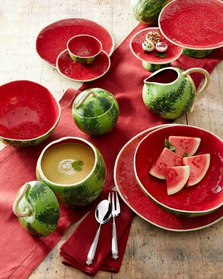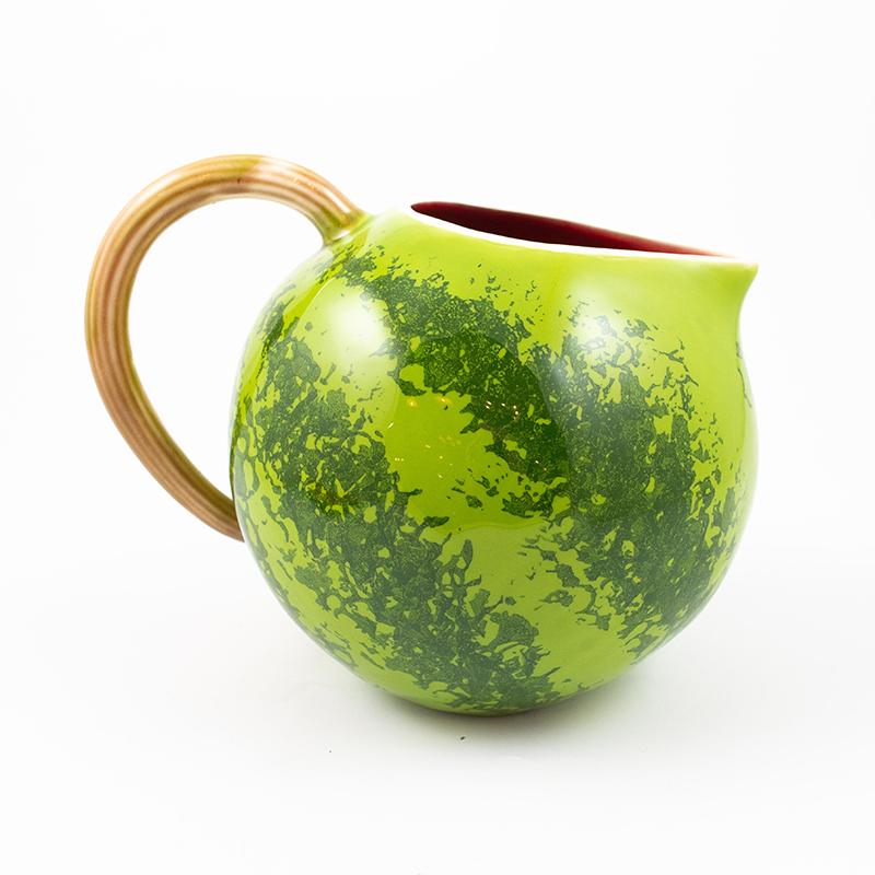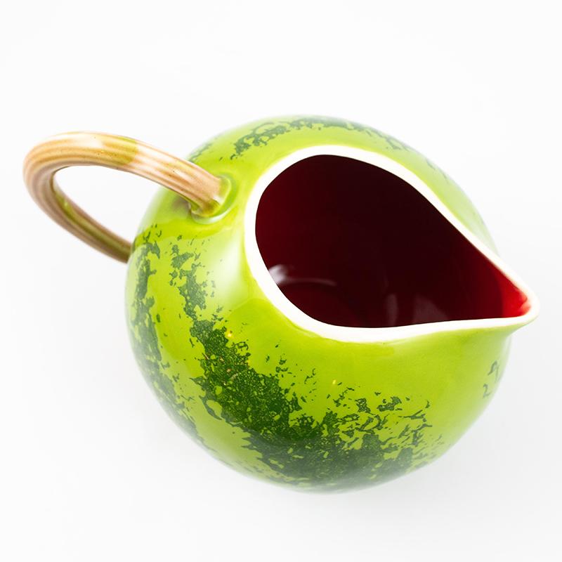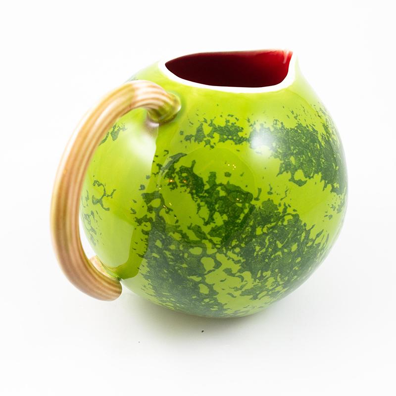 Этот круглый большой кувшин выглядит очень реалистично и похож на настоящий спелый арбуз. Снаружи он выкрашен в характерные полоски разных зеленых оттенков, внутри сияет алым, а ручка кувшина стилизована под тонкий арбузный хвостик.