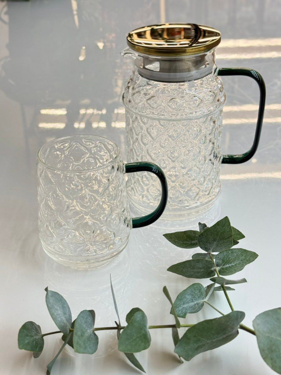 Графин Ricardo — это больше, чем просто сосуд для напитков. Это воспоминание о летних застольях на веранде, о домашнем уюте и заботе. Его плотное стекло с декоративной рельефной текстурой словно создано, чтобы подчеркнуть атмосферу щедрости и душевного тепла. А массивная ручка цвета темного изумруда делает подачу напитка особенно удобной и стильной.