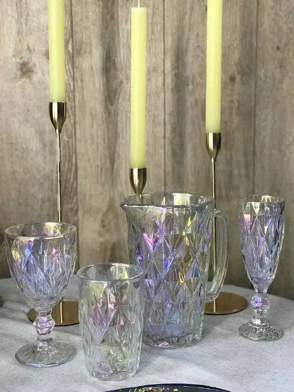 Набор из 6 бокалов по 340 мл — прочные, устойчивые, с шикарным бликом. Каждый бокал словно расцветает при попадании света, наполняя стол цветовыми переливами.