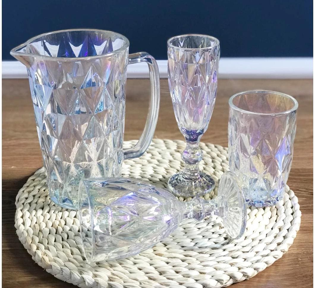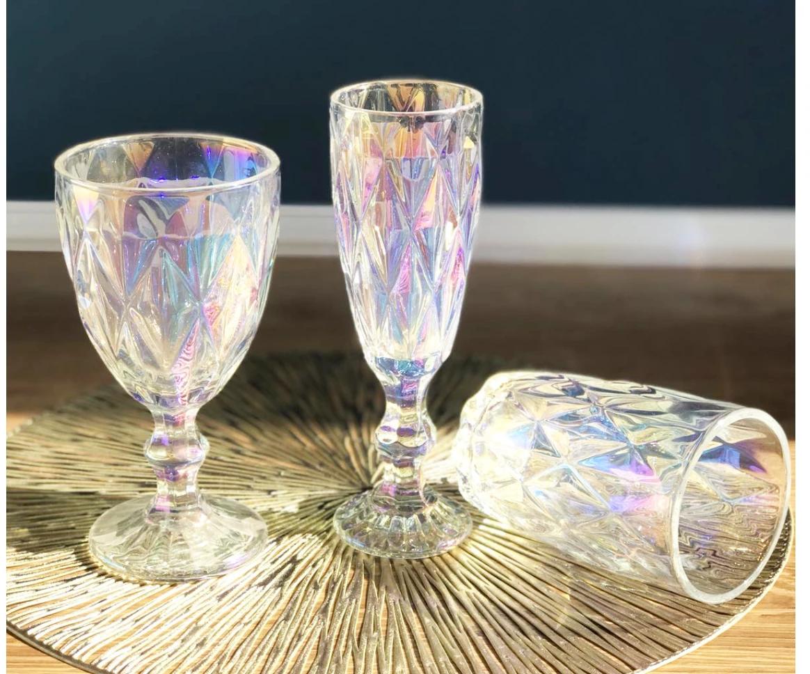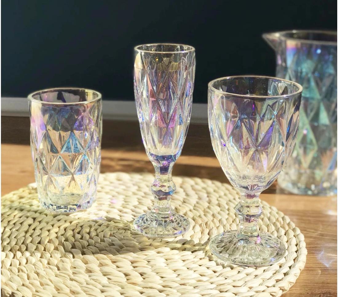 Набор из 6 бокалов по 340 мл — прочные, устойчивые, с шикарным бликом. Каждый бокал словно расцветает при попадании света, наполняя стол цветовыми переливами.