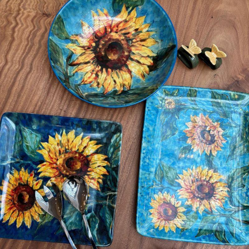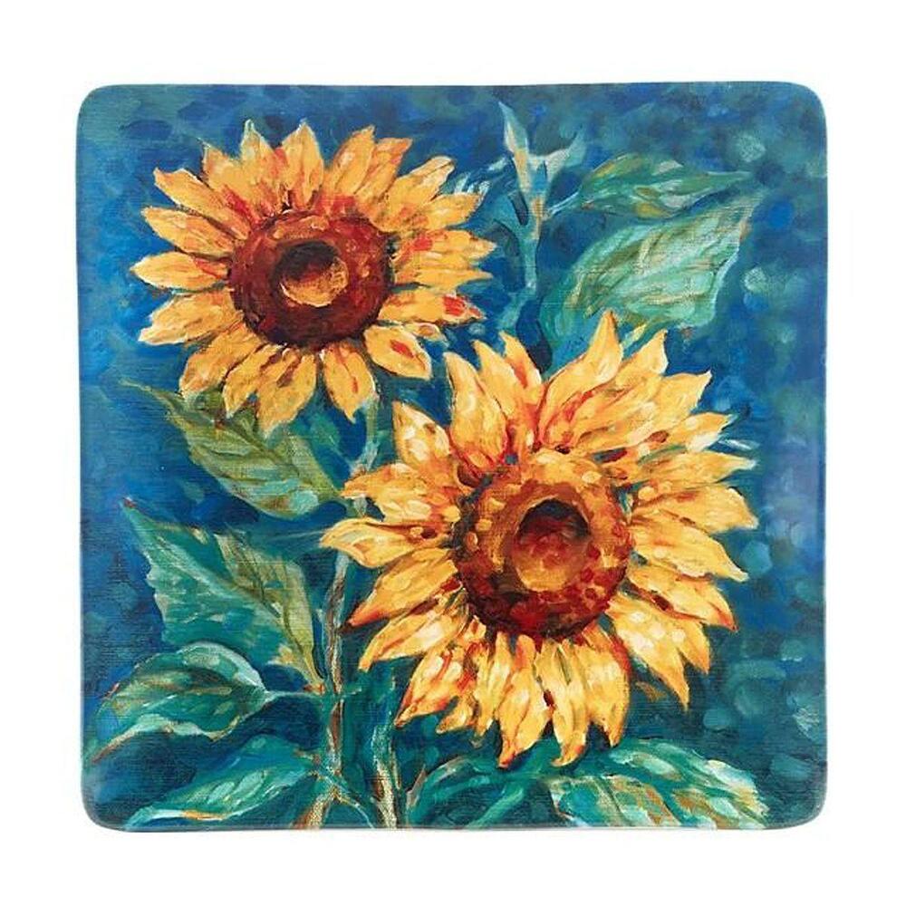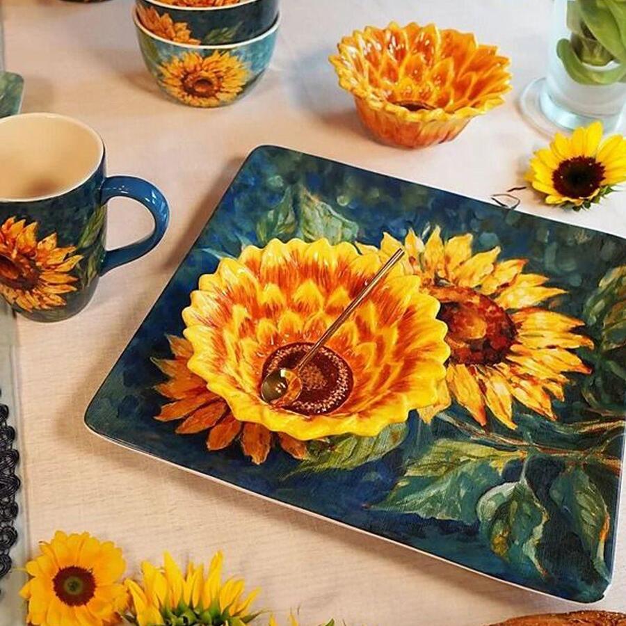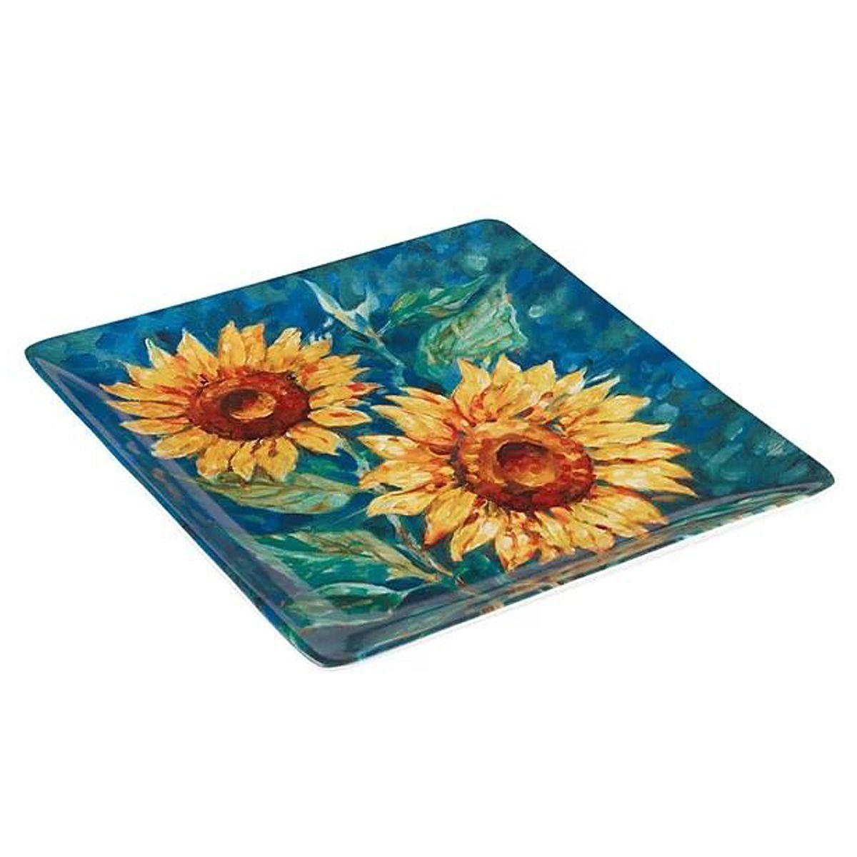 Квадратное керамическое блюдо с цветами на голубом фоне "Золотистые Подсолнухи" от Certified International – это стильный элемент сервировки, сочетающий практичность и изысканную эстетику. Благодаря насыщенному синему фону и ярким желтым подсолнухам, блюдо привлекает внимание и придает столу особый шик. Его размер идеально подходит для подачи основных блюд, закусок, фруктов или десертов.