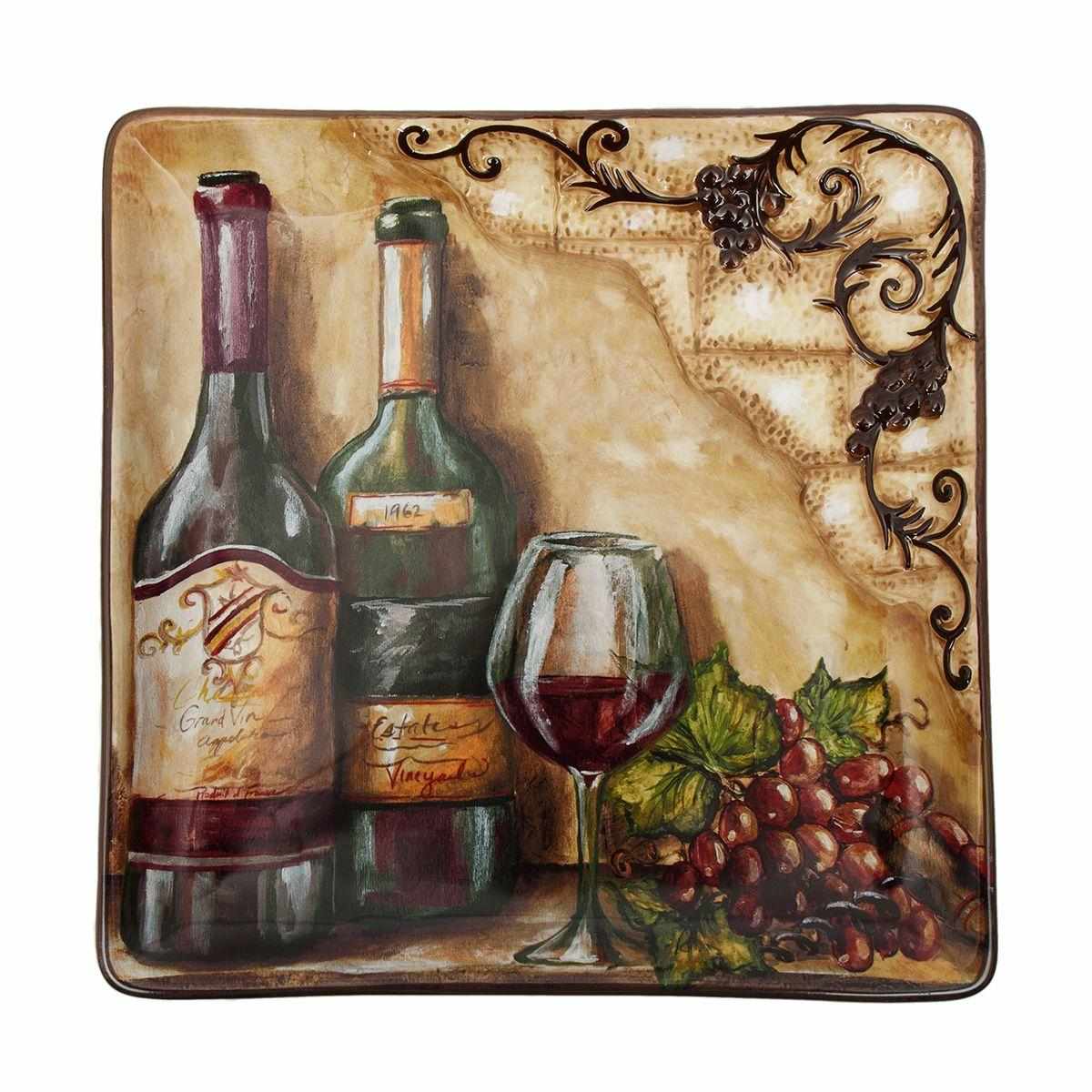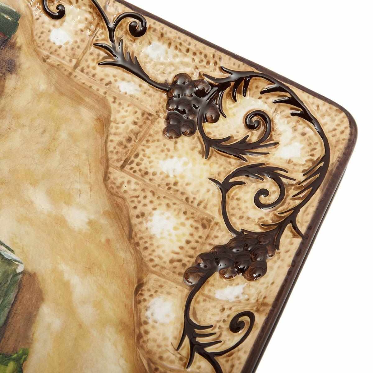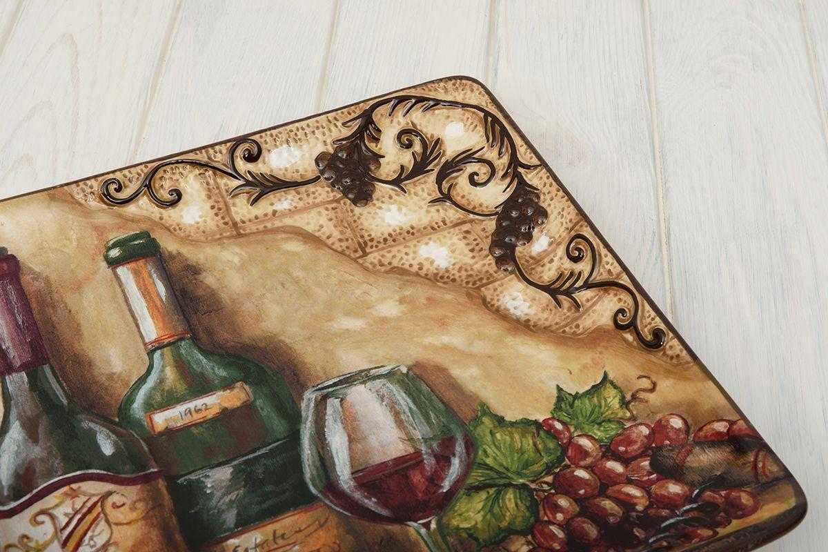 Фон стилізовано під стіну старовинного італійського будинку, а у верхньому куті тарілок видно рельєфний візерунок, що нагадує цегляну кладку та виноградну лозу — ці декоративні елементи промальовані вручну. Основний мотив із пляшками витриманого вина, наповненим келихом та гронами стиглого винограду виглядає насичено та реалістично завдяки друку високої чіткості. Тарілки чудово поєднуються з яскравими текстильними доріжками й скатертинами, наприклад, «Різнобарвна мозаїка» від Villa Grazia. Можна мити в посудомийній машині та використовувати в мікрохвильовій печі лише для розігріву. Не рекомендується застосовувати засоби з абразивними частинками.