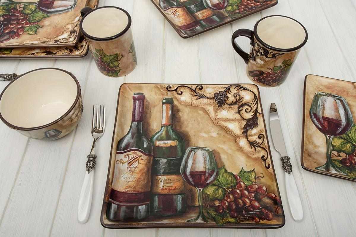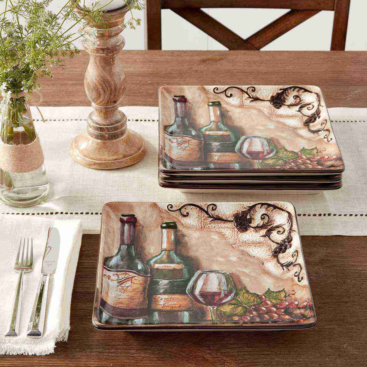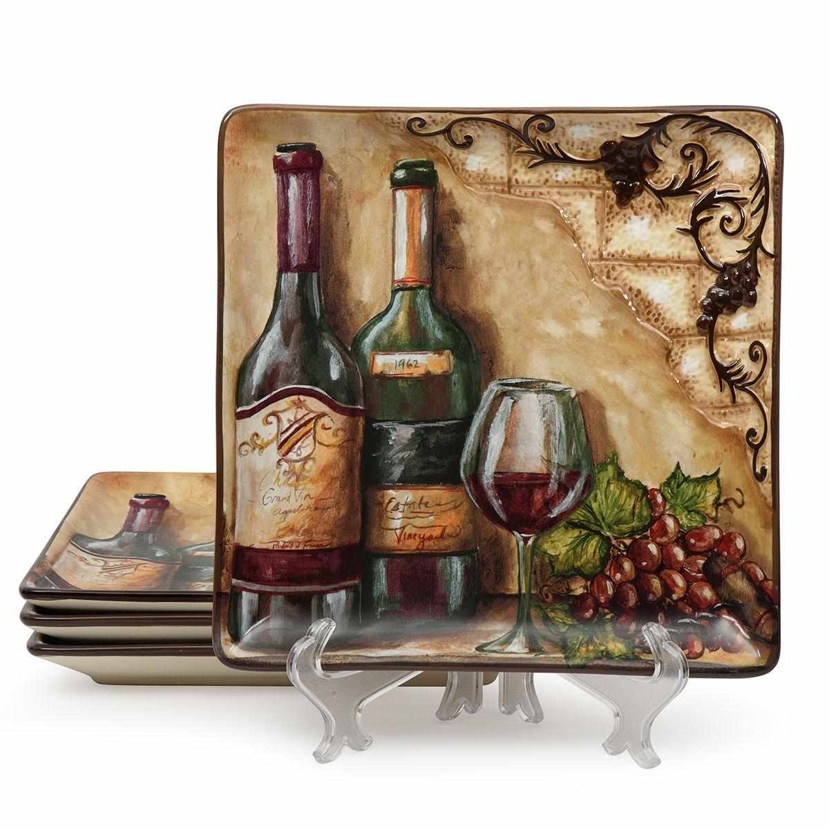Фон стилізовано під стіну старовинного італійського будинку, а у верхньому куті тарілок видно рельєфний візерунок, що нагадує цегляну кладку та виноградну лозу — ці декоративні елементи промальовані вручну. Основний мотив із пляшками витриманого вина, наповненим келихом та гронами стиглого винограду виглядає насичено та реалістично завдяки друку високої чіткості. Тарілки чудово поєднуються з яскравими текстильними доріжками й скатертинами, наприклад, «Різнобарвна мозаїка» від Villa Grazia. Можна мити в посудомийній машині та використовувати в мікрохвильовій печі лише для розігріву. Не рекомендується застосовувати засоби з абразивними частинками.