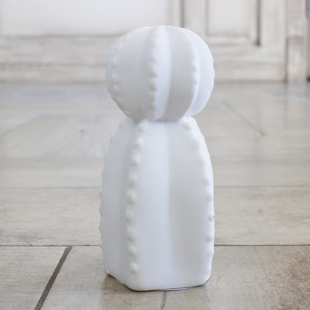 Небольшой белый ночник в виде кактуса — стильное и практичное решение для украшения дома. Имеет три варианта, высотой 13см, изготовлен из керамики. Маленький размер займет немного места на столике, полке или тумбочке, но кроме как функция светильнике — это еще и интересный декор для дома, который добавит уюта и света комнате. Идеальный подарок подруге или коллеге на 8мое марта или Новый Год. Также это светильник можно использовать в детской, так как свет мягкий и приглушенный.