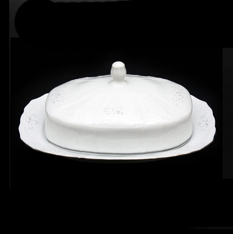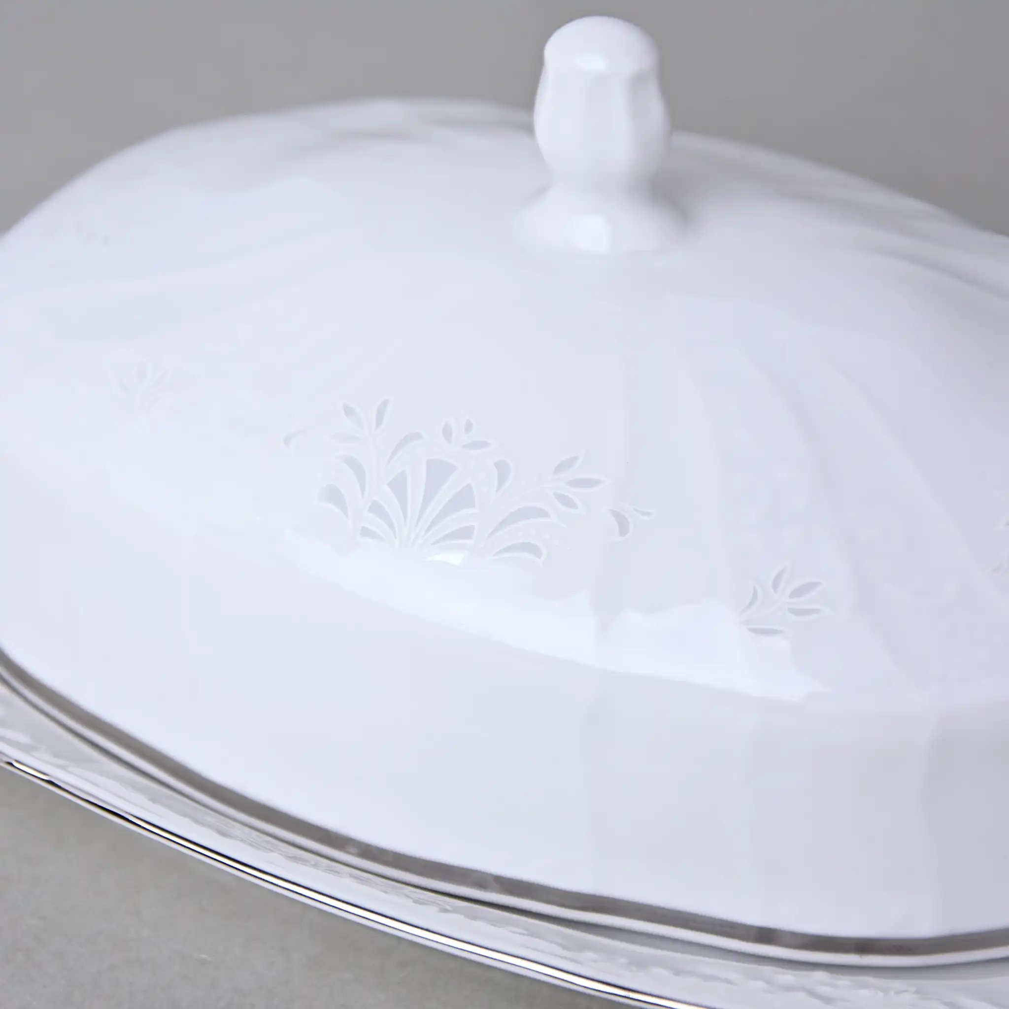 Тонкая платиновая кайма идёт по краю блюда, добавляя изделию деликатности. Эта деталь ненавязчива, но важна — она создаёт визуальный акцент, который связывает маслёнку с остальной посудой коллекции "Невеста". Узоры на крышке ненавязчиво играют в свете, уместны как при дневном освещении, так и при вечернем.