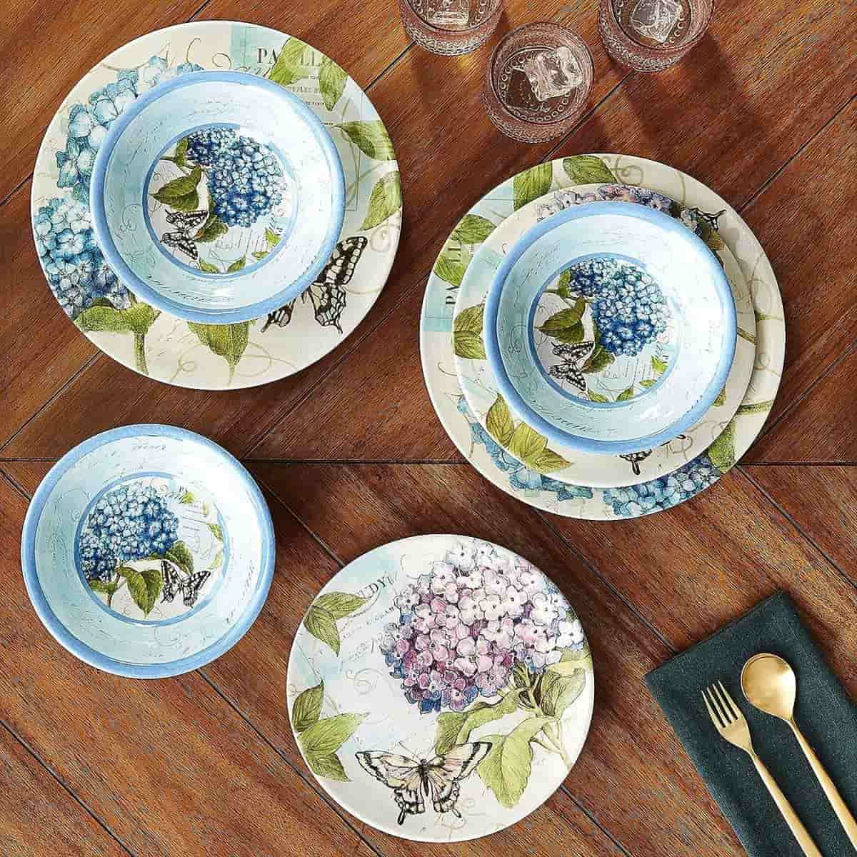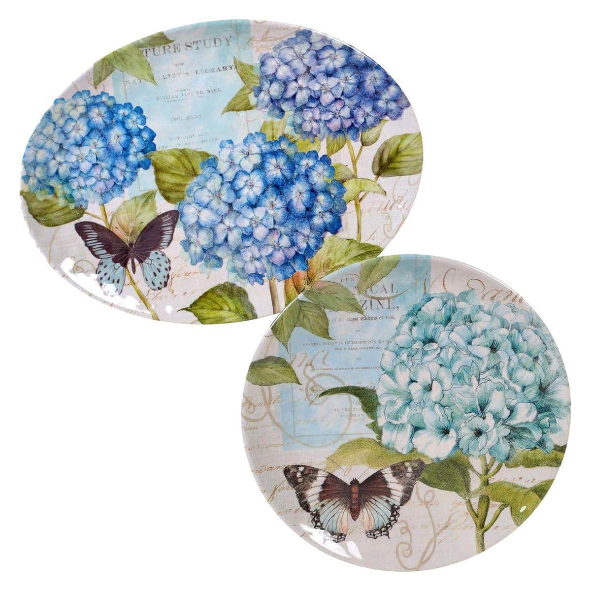 Меламіновий набір «Сад гортензій» Certified International складається з двох блюд для подачі із зображенням гортензій та метеликів. У комплект входить велике овальне блюдо довжиною 46 см і діаметром 34 см, а також кругле блюдо діаметром 36 см, загальна маса набору становить приблизно 1330 г. Посуд виготовлений з ударостійкого меламіну без шкідливих домішок, безпека матеріалу підтверджена сертифікатами. Ніжні гортензії та метелики виконані за унікальним дизайном відомої американської художниці Сюзан Вінгет. Блюда придатні для частого миття в посудомийній машині за температури не вище +70 °C, проте їх не можна використовувати в духовці чи мікрохвильовій печі та очищувати абразивними засобами. Набір ідеально підходить для обідів як на відкритому повітрі, так і в приміщенні; країна бренду — США, а виробництво розташоване на заводах Certified International у КНР.