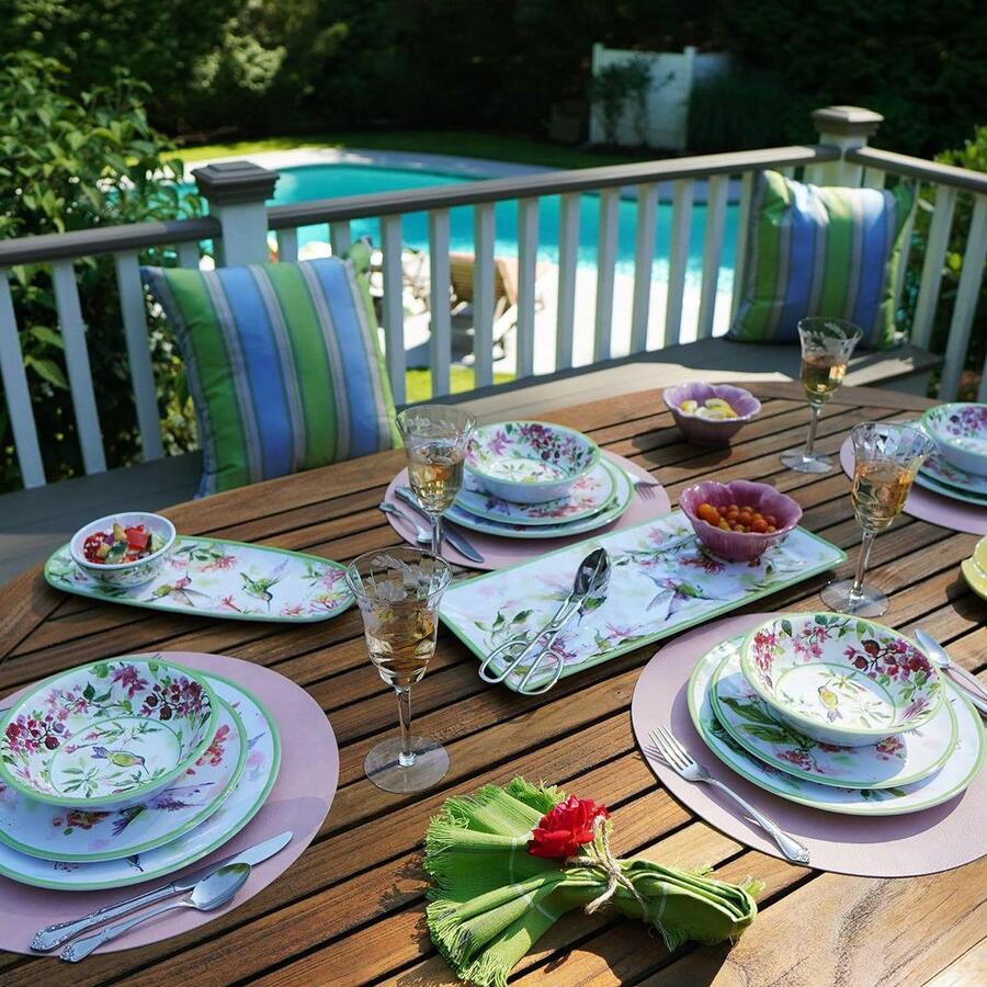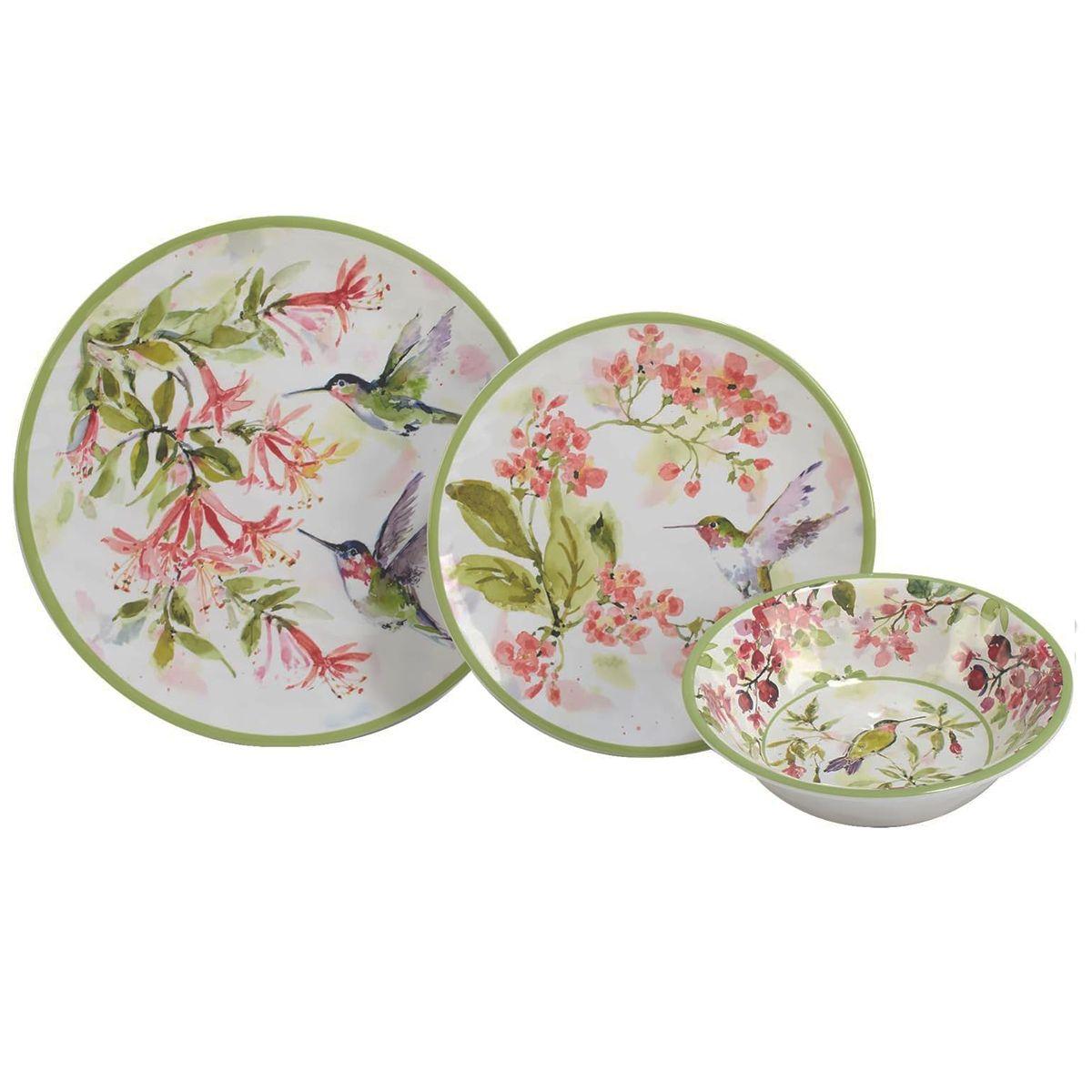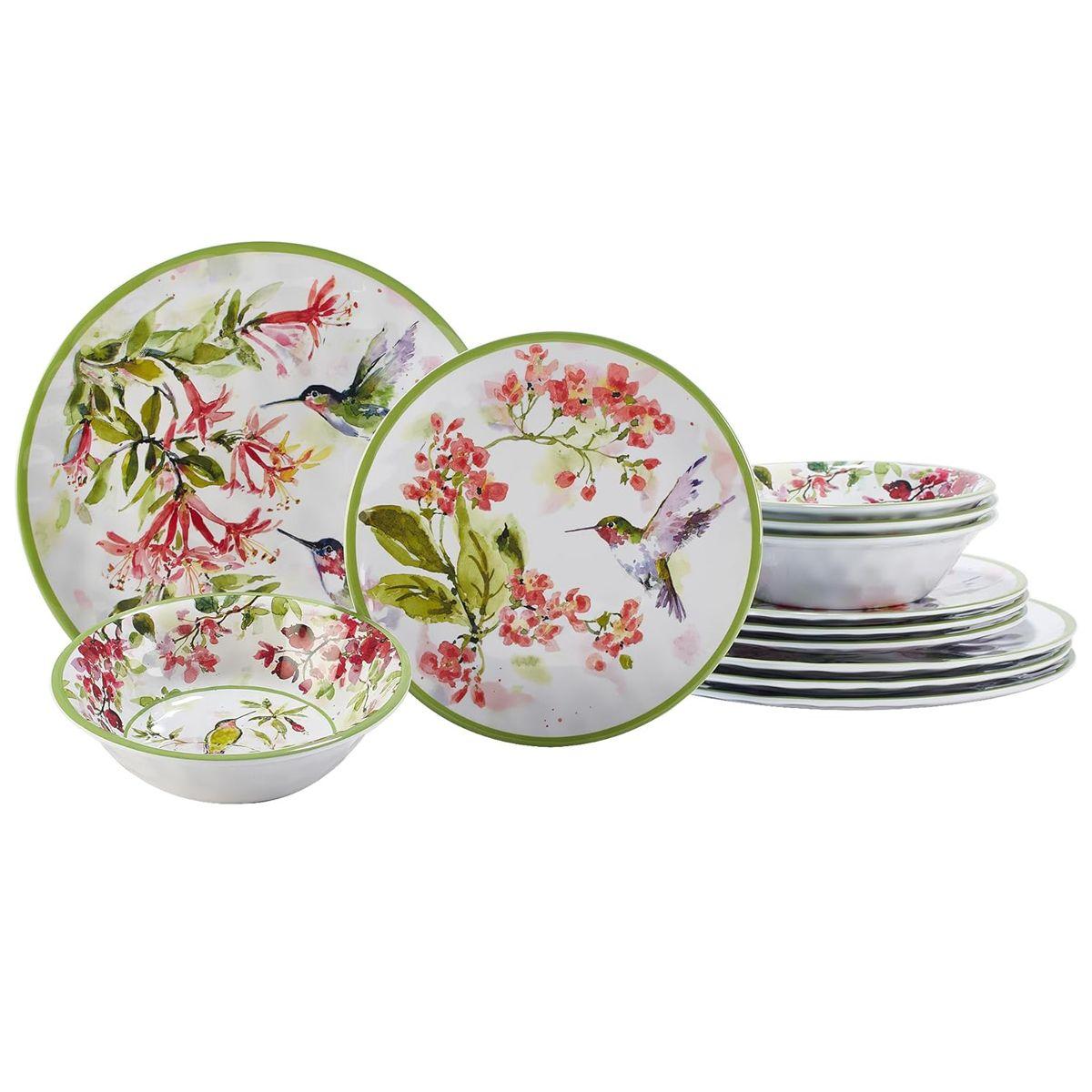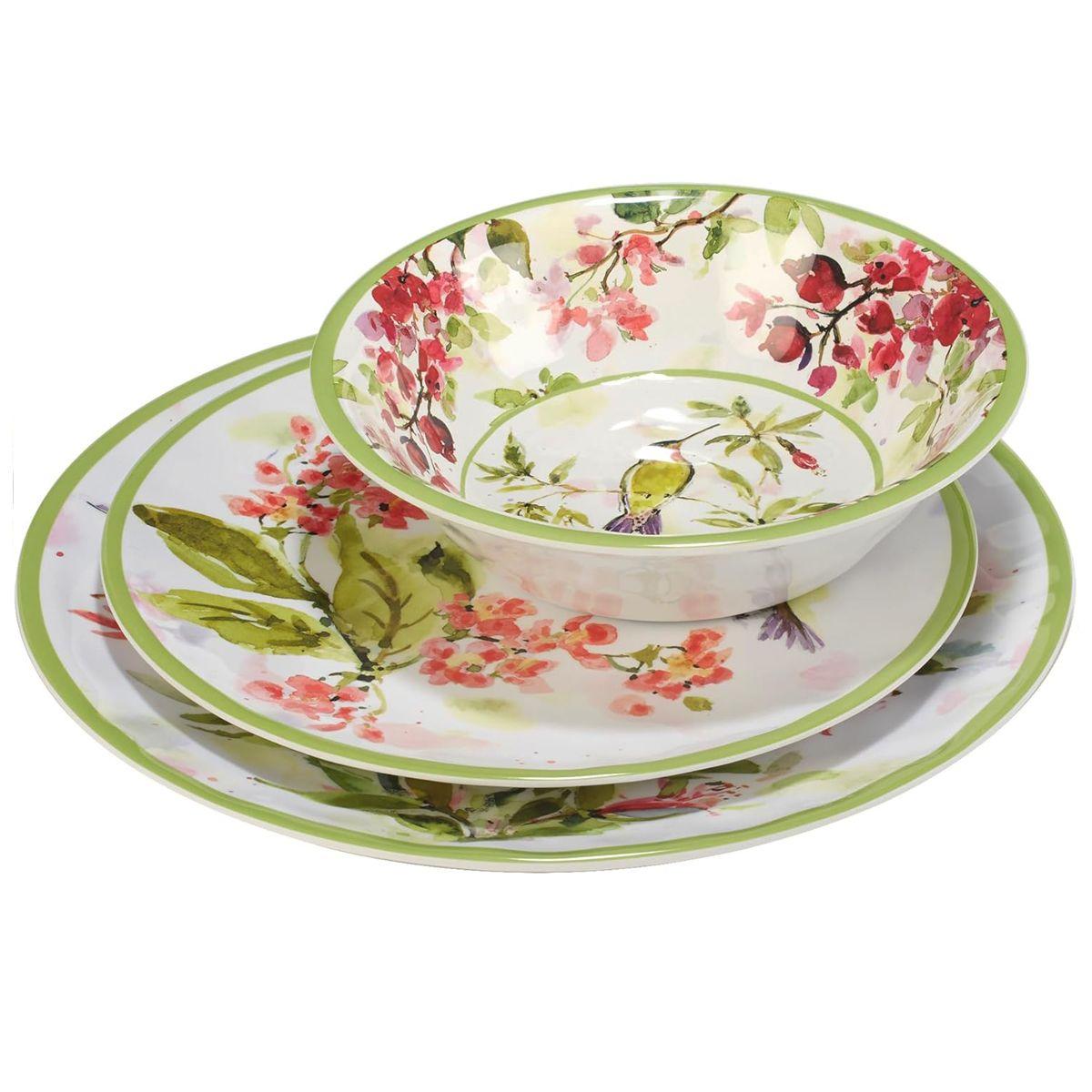 Меламіновий сервіз на 12 предметів із зеленою окантовкою "Колібрі" від Certified International – це стильне та практичне рішення для сервірування столу. Витончений дизайн із зображенням колібрі та квіткових мотивів на білому фоні з ніжною зеленою окантовкою надає легкості та весняного настрою. Завдяки матеріалу меламін, сервіз відрізняється високою міцністю та легкістю, що робить його ідеальним вибором для щоденного використання, пікніків чи відпочинку на природі.