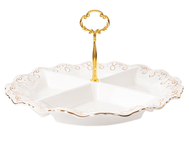 Эта утончённая фарфоровая менажница диаметром 30,5 см создана для тех, кто ценит стильную сервировку и безупречное качество. Белоснежная поверхность с тонким золотым декором и изящной ручкой выглядит по-настоящему нарядно, превращая каждую подачу блюд в маленькое торжество. Менажница эффектно смотрится как на праздничном застолье, так и на повседневном семейном ужине.