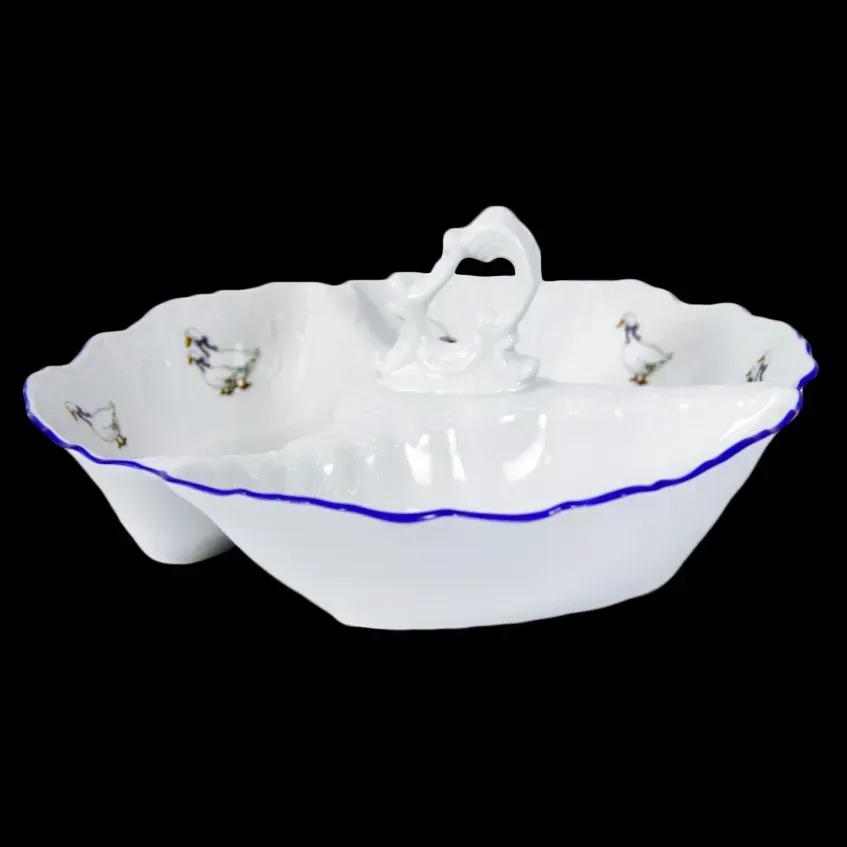 Изделие выполнено из качественного чешского фарфора и украшено нежным рельефным узором и узнаваемым рисунком гусей. Этот декор давно полюбился поклонникам классической эстетики и спокойного, душевного стиля. Менажница будет гармонировать с любым другим элементом сервировки, подчёркивая ваш вкус к деталям и организованности.