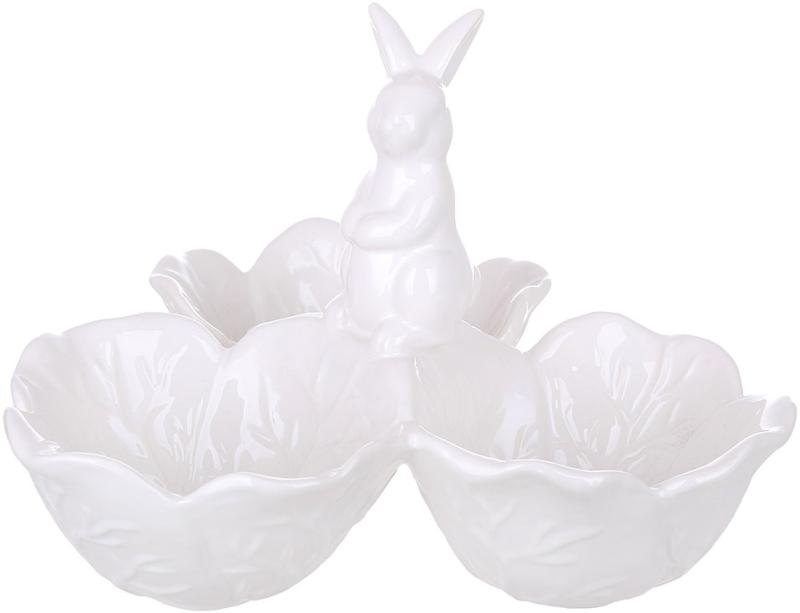 Эта изысканная менажница объединяет в себе нежность весеннего настроения и практичность фарфора. Три лепестковые чаши, собранные вокруг фигурки милого белого зайчика, будто рождены из цветущей капусты.