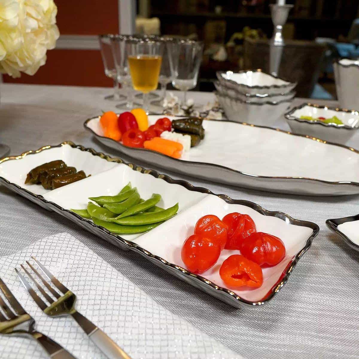 Ця елегантна менажниця на 3 секції стане родзинкою вашого сервірування і допоможе красиво подати закуски, соуси або десерти. Її подовжена форма і хвилястий край зі срібною обробкою виглядають стильно і підкреслюють акуратність подачі. Кераміка преміальної якості гармонійно поєднується з будь-яким інтер'єром і підходить як для повсякденного використання, так і для святкового столу. Кожна з трьох секцій дозволяє розділити страви і зберегти їх смак і текстуру. Виріб легко мити і зручно зберігати завдяки продуманим розмірам. Ця менажниця стане відмінним вибором для тих, хто хоче зробити сервірування більш ефектним і акуратним.