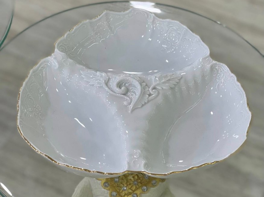 Вигнута форма секцій створена не лише задля краси, а й для зручності: у кожному відділенні можна подати різні страви, зберігаючи їхній смак і аромат. Велика менажниця ідеальна для святкового столу чи рясної подачі, мала — для затишної родинної вечері чи ранкового сніданку.