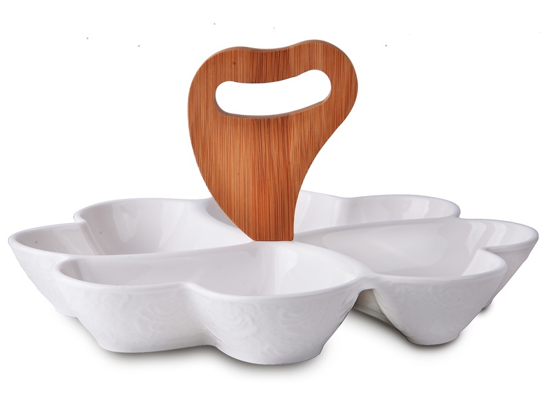 Ця оригінальна менажниця — стильне та зручне рішення для сервірування частувань. Білосніжні фарфорові секції елегантно розташовані навколо центральної бамбукової ручки з ергономічним вирізом, що дає змогу легко переносити виріб навіть у наповненому вигляді. Природна текстура бамбука гармонійно поєднується з чистотою фарфору, створюючи сучасний і затишний вигляд сервірування.