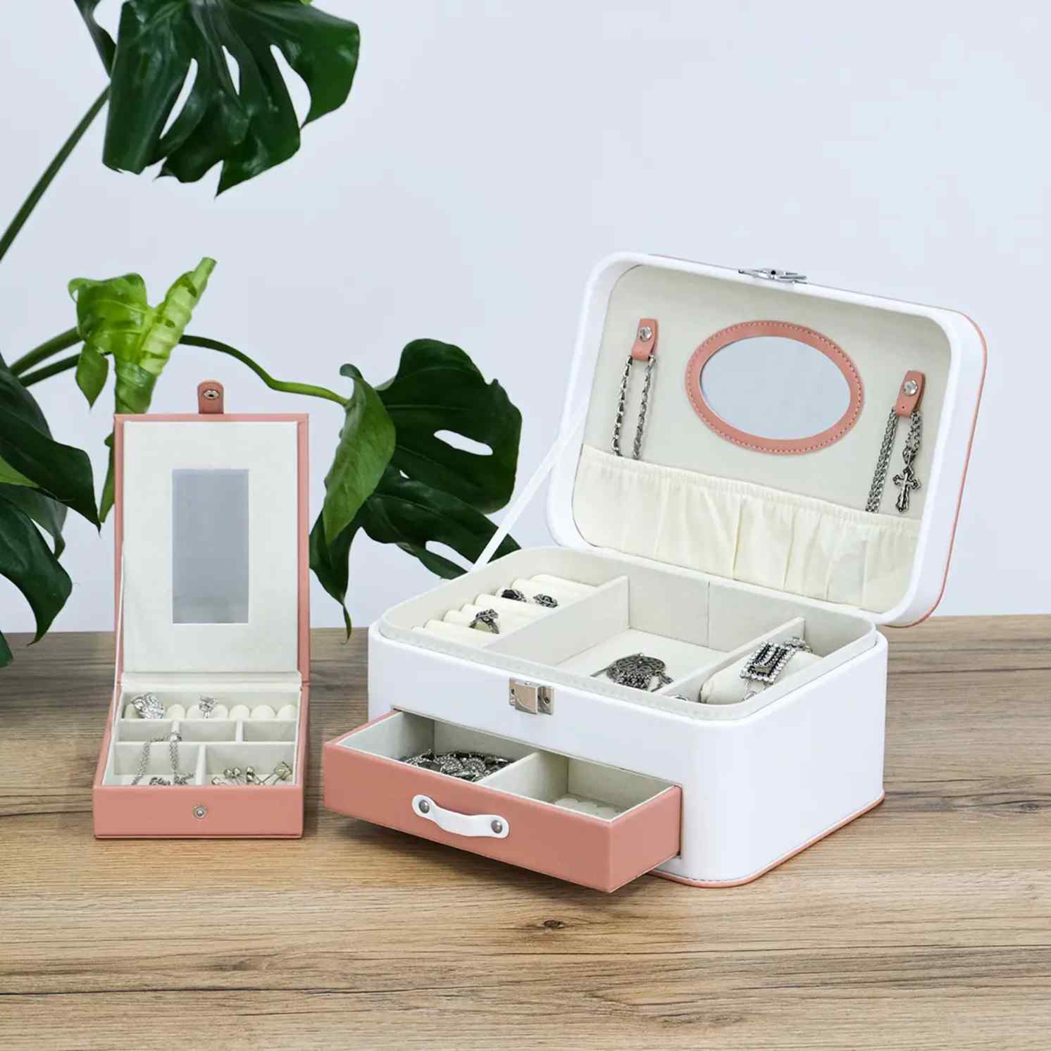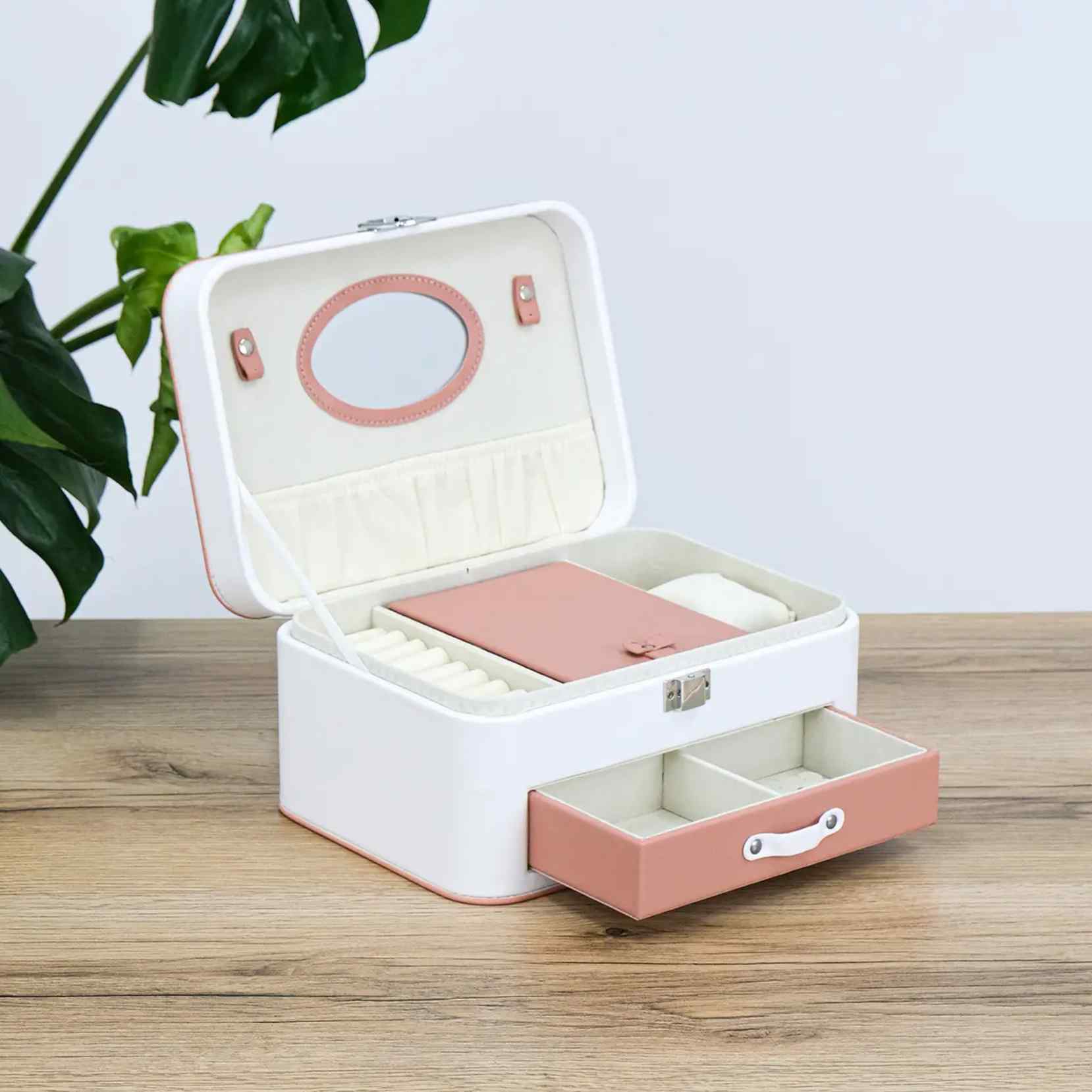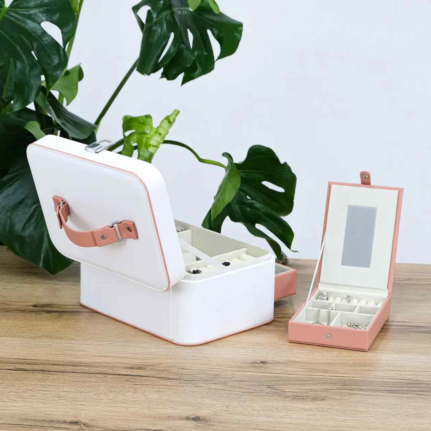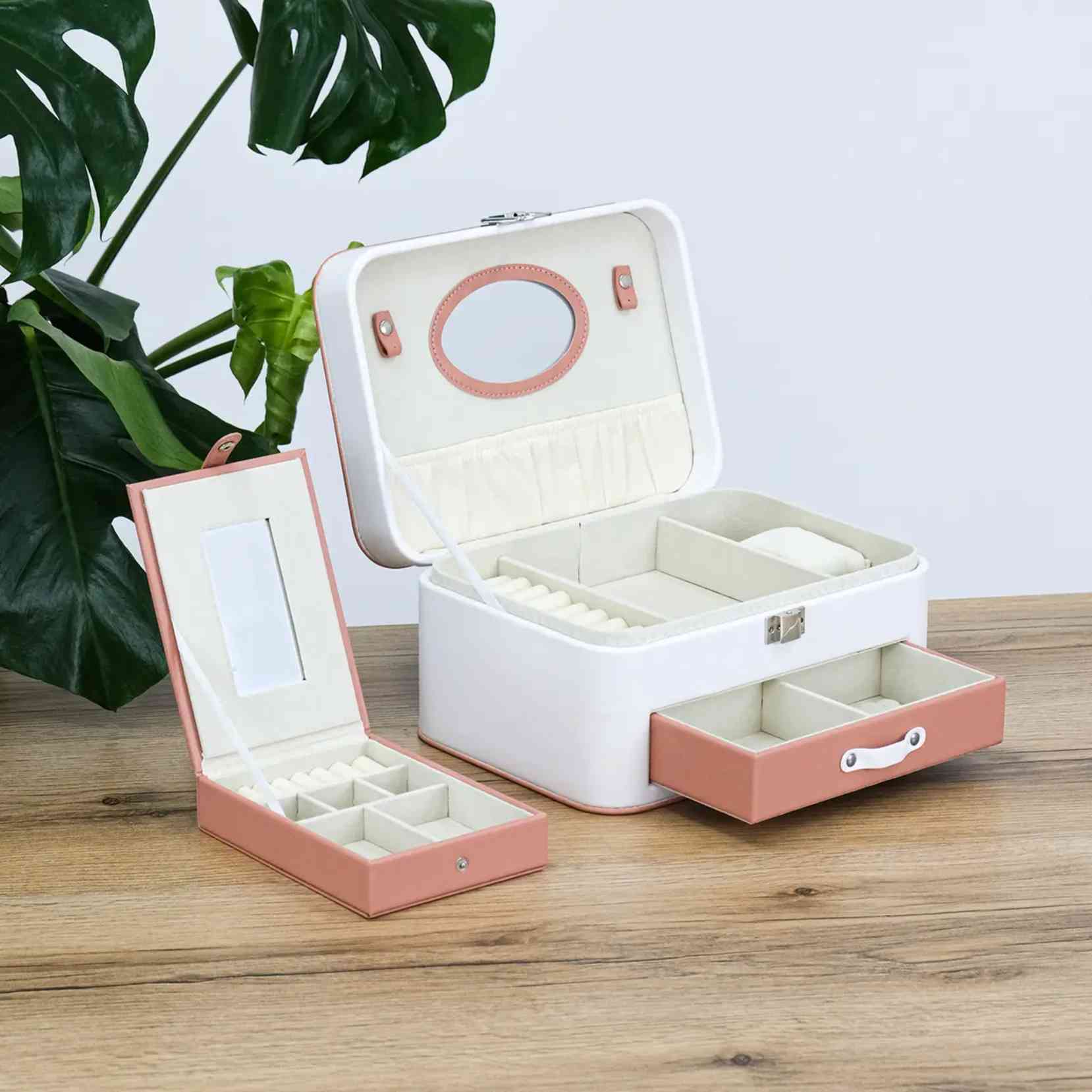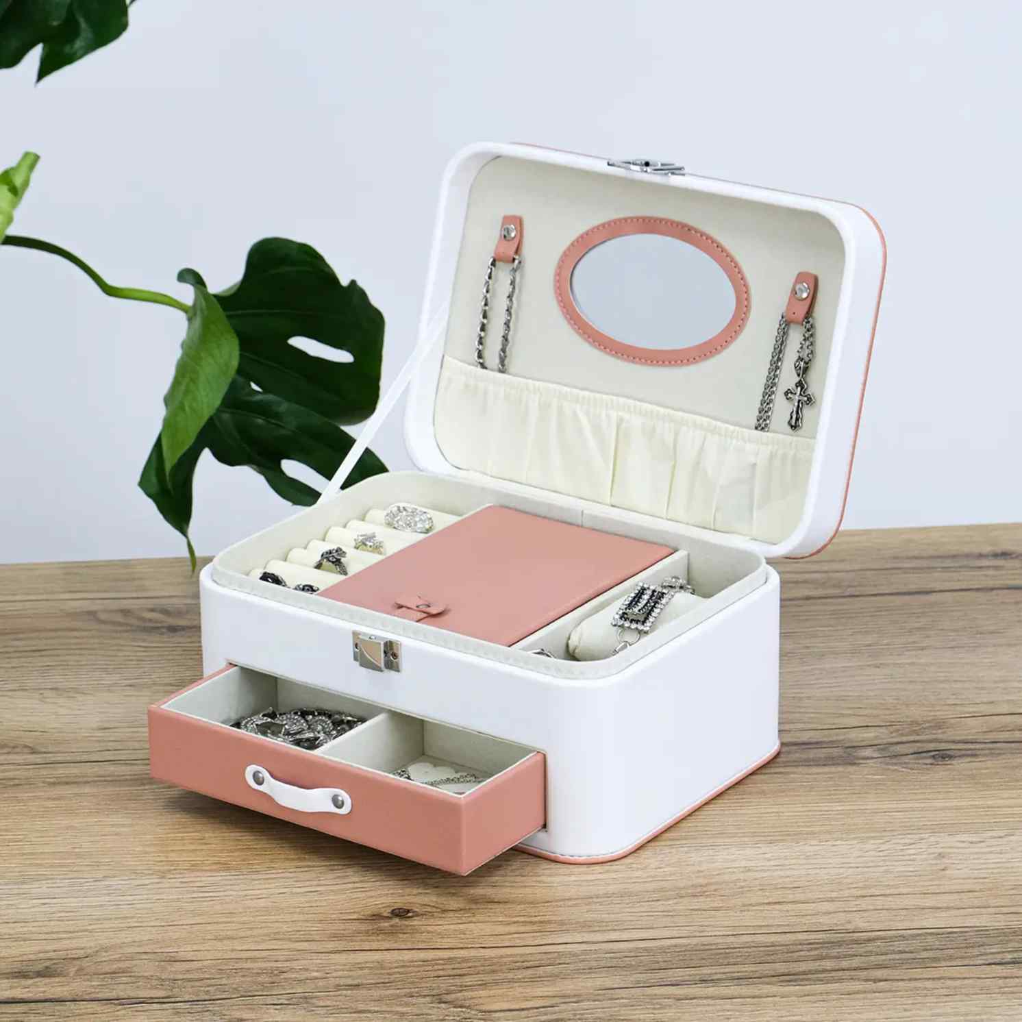 Внутреннее пространство организовано максимально удобно: предусмотрены отделения для колец, серёжек, браслетов, цепочек и часов. Встроенное зеркало позволяет быстро подобрать аксессуары, а выдвижной нижний ящик добавляет дополнительное место для хранения. Отдельный компактный дорожный кейс делает эту модель особенно удобной — вы можете взять с собой всё необходимое, сохранив порядок и аккуратность.