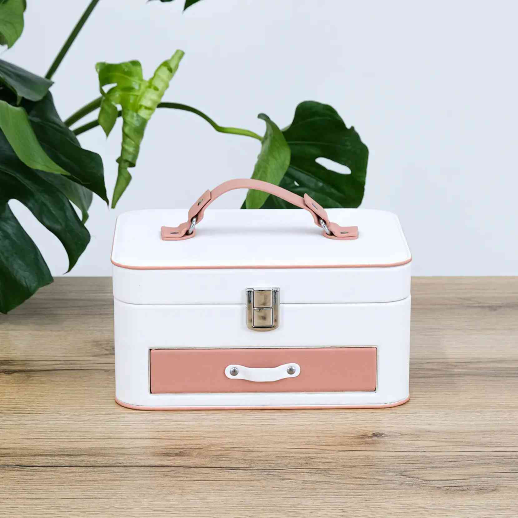 Эта модель станет не только удобным местом для хранения украшений, но и стильным акцентом в интерьере или практичным решением для поездок. Выполненная из качественной экокожи белого цвета с нежно-розовыми вставками, шкатулка выглядит легко, современно и при этом эффектно.