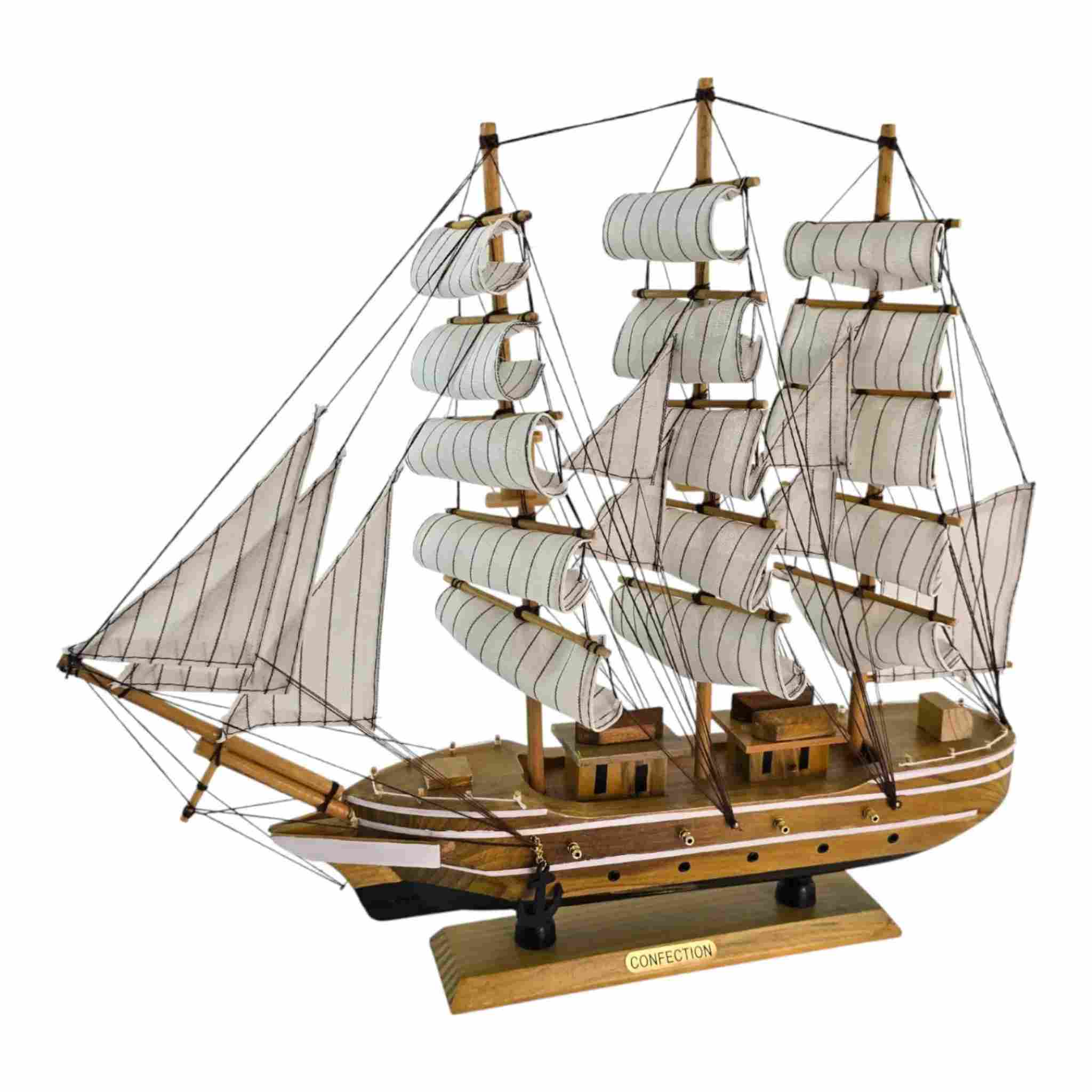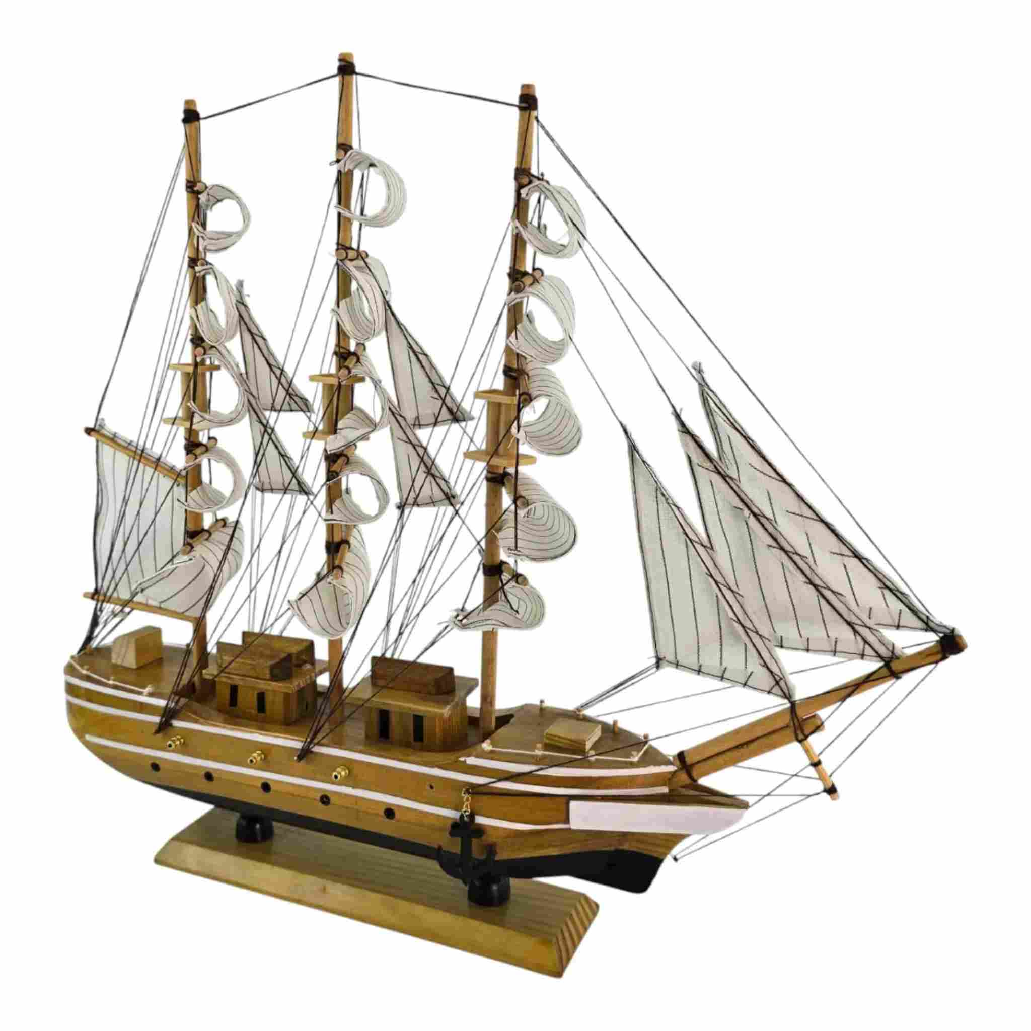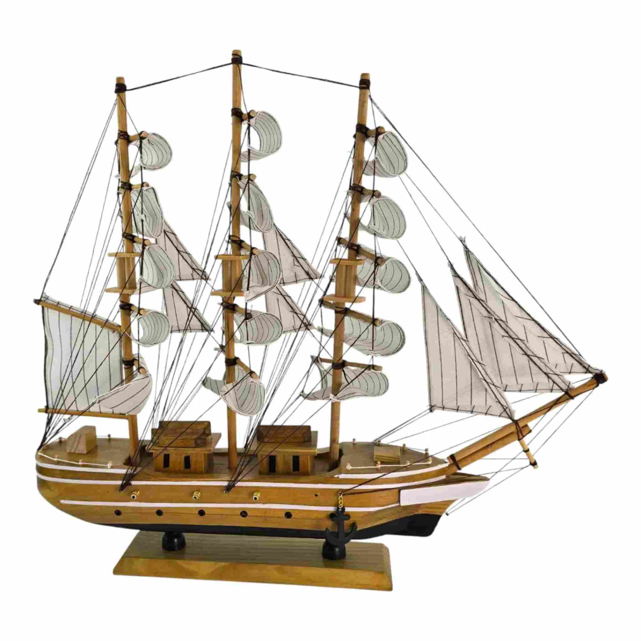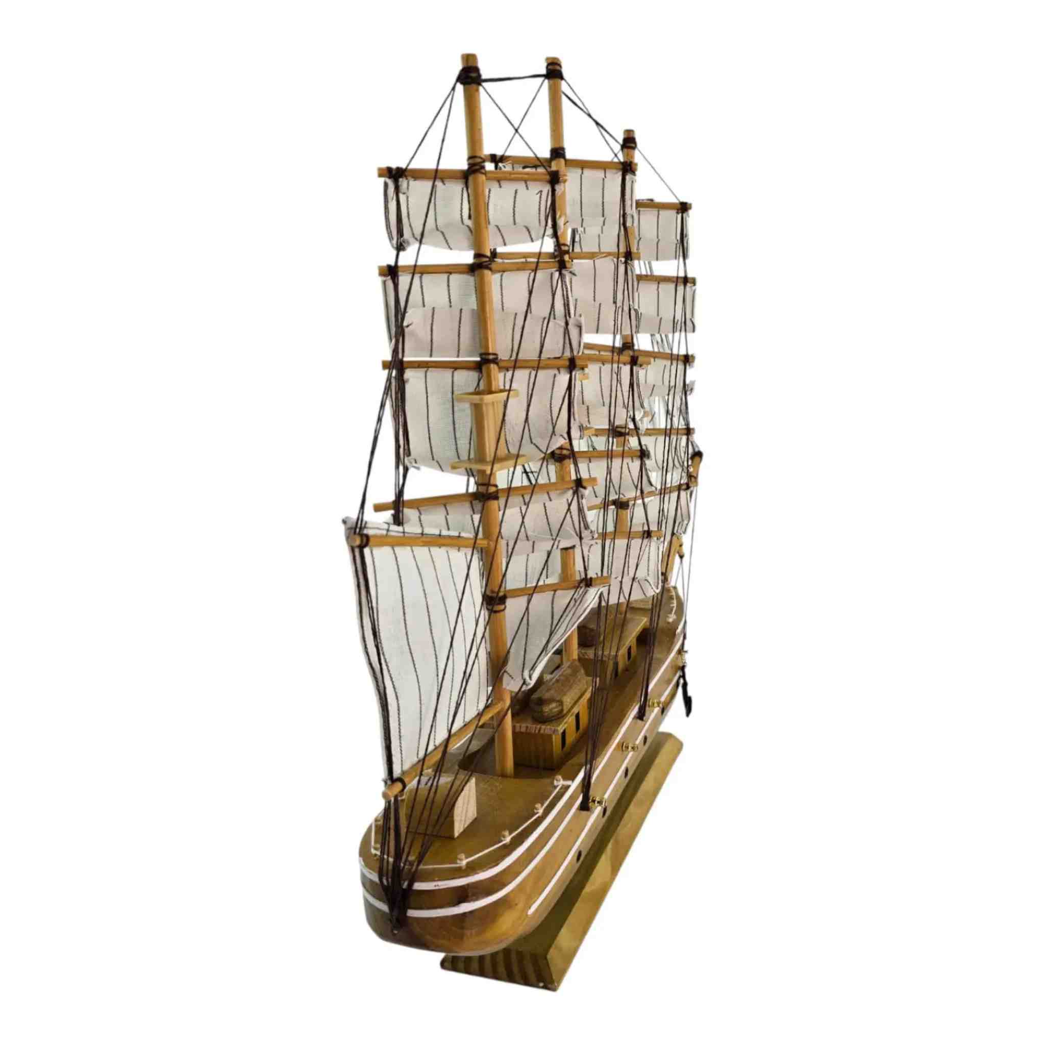 Модель выполнена из дерева и дополнена тканевыми парусами, аккуратно натянутыми снастями и устойчивой подставкой. Благодаря продуманной конструкции её удобно разместить на полке, комоде или рабочем столе, добавив интерьеру глубину и характер.