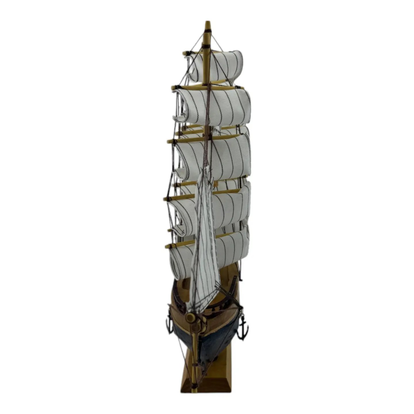 Аккуратные паруса и тщательно проработанные элементы мачт создают ощущение движения и лёгкости, словно корабль готов отправиться в дальнее плавание. Модель дополнена деревянной подставкой, которая обеспечивает устойчивость и удобство размещения.