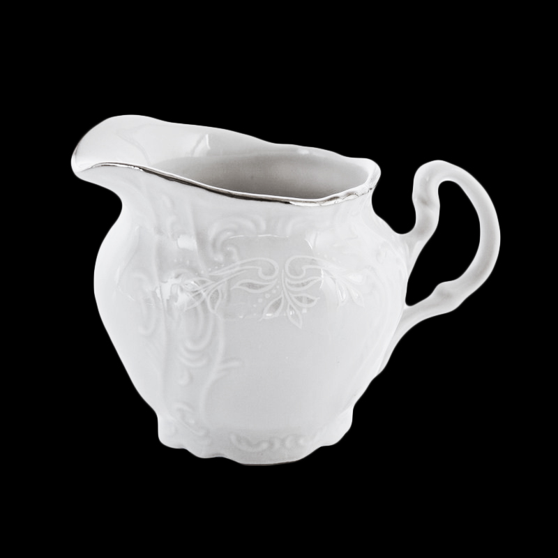 Каждый из этих изысканных фарфоровых молочников серии Bernadotte — это не просто посуда, а полноценный элемент эстетики и уюта за столом. Белоснежный фарфор, украшенный платиновой каёмкой и тонким рельефным узором, создаёт впечатление старинной изысканности, но при этом легко вписывается в современный интерьер. Это идеальный спутник к чашке кофе или чая, подчёркивающий ваш вкус и внимание к деталям.