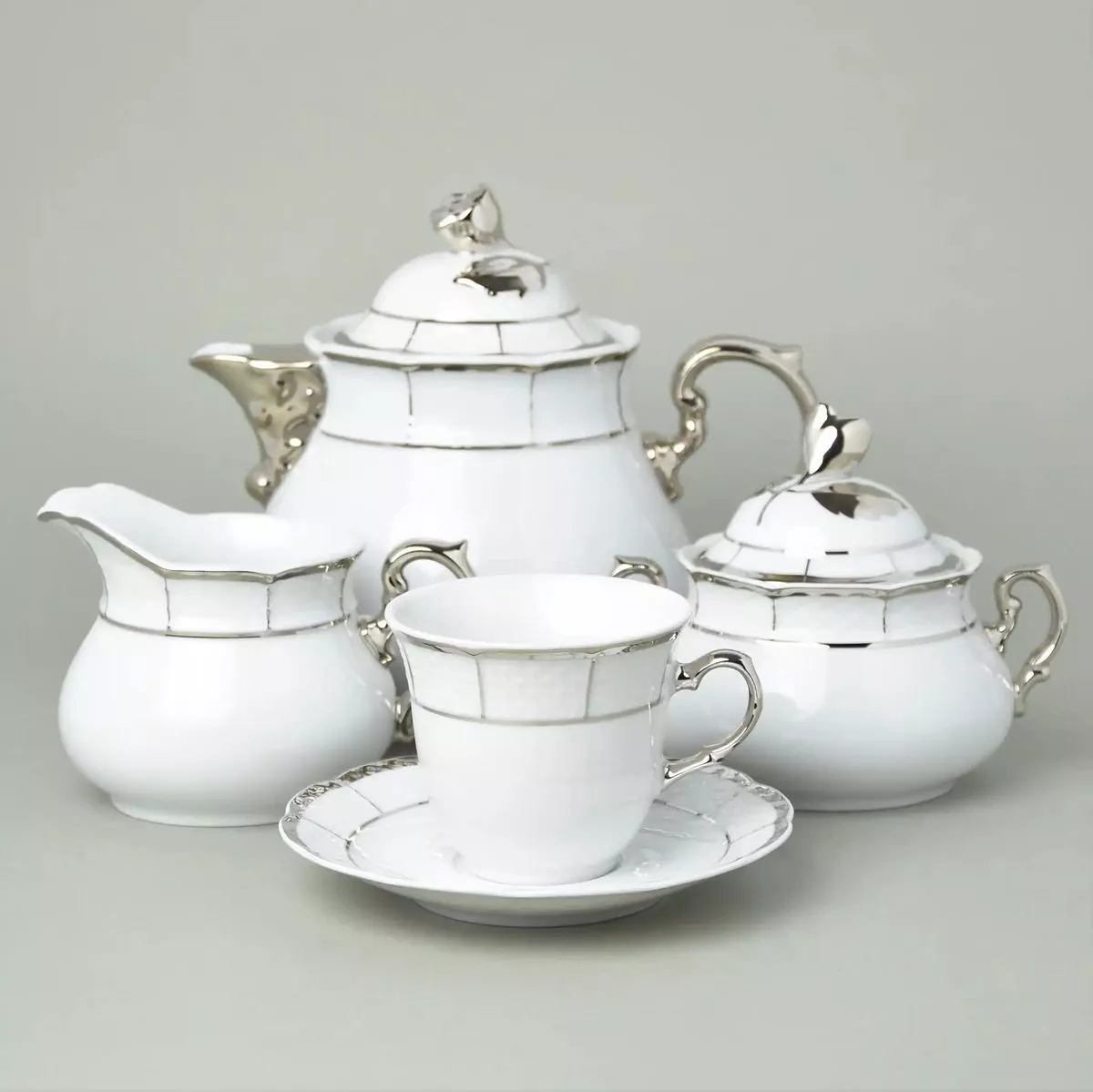 Изящная платиновая каёмка вдоль кромки подчеркивает безупречную белизну фарфора и утончённость исполнения. В отражении этих серебристых линий можно увидеть свет свечи или утреннего солнца. Вся композиция говорит о вкусе, заботе о деталях и любви к красоте.