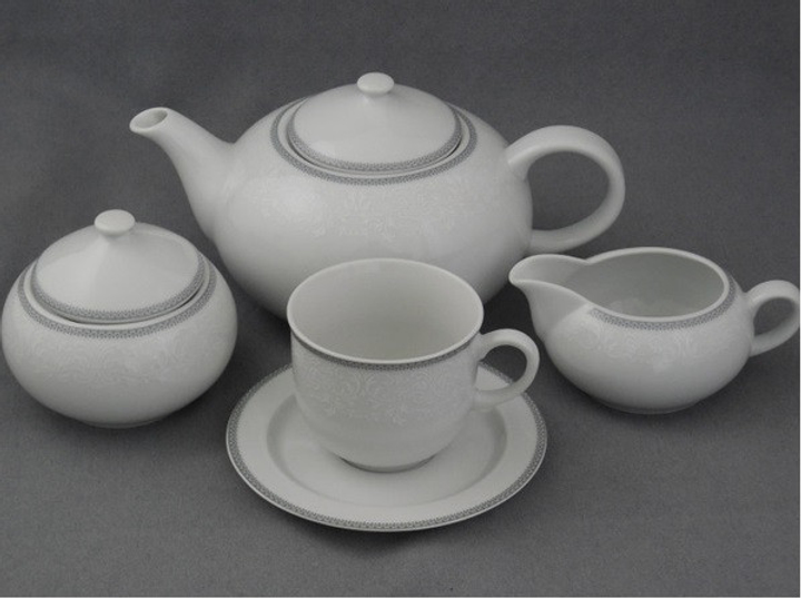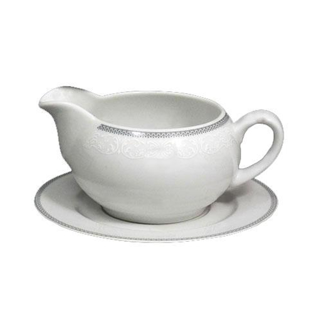 Белоснежный фарфор декорирован тонким рельефным узором и аккуратной серой каймой, которая обрамляет верхний край. Такой дизайн выглядит сдержанно, но изысканно — идеален для ценителей классики с лёгким современным акцентом. Он хорошо сочетается с остальными предметами коллекции и легко вписывается в любой сервировочный комплект.