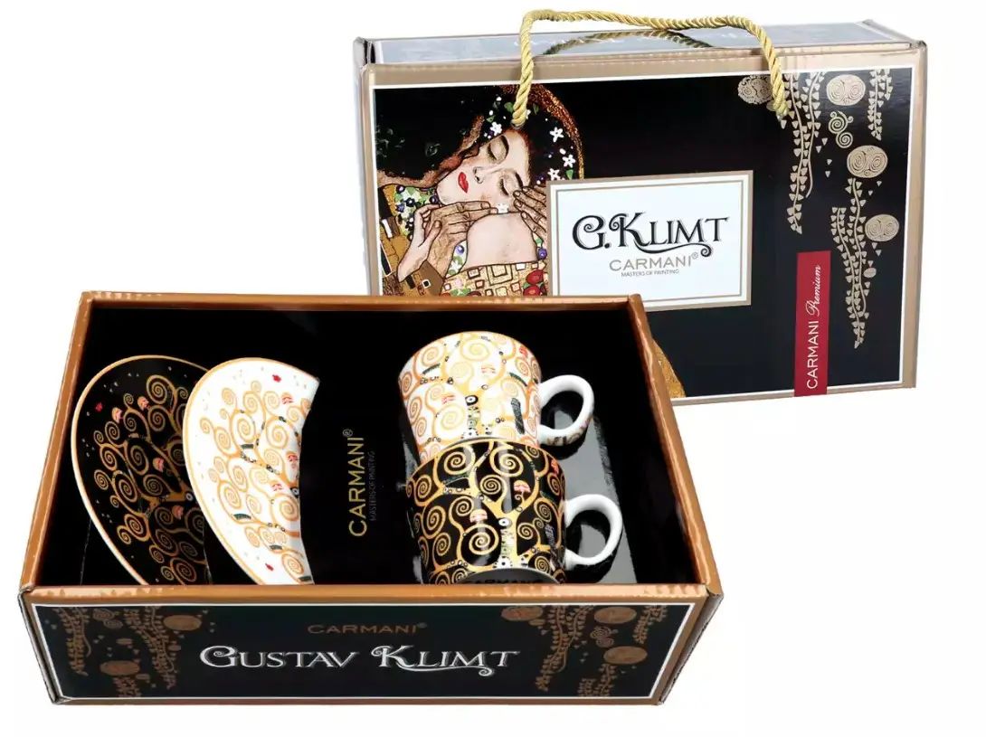 Подарунковий набір Carmani за мотивами робіт Густава Клімта «Дерево життя» — це вишукане поєднання мистецтва та щоденного ритуалу. До набору входять дві порцелянові чашки об’ємом 100 мл і два блюдця діаметром 13 см, оформлені у характерній для Клімта орнаментальній манері із золотистими акцентами та плавними лініями.