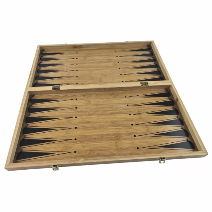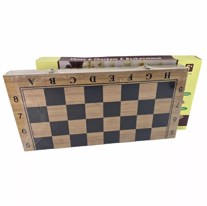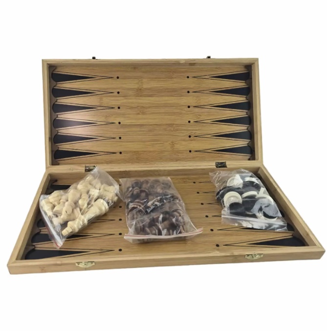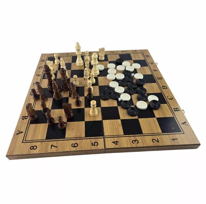 Набір 3 в 1 поєднує шахи, шашки та нарди в одному універсальному комплекті. Дошка виготовлена з бамбука та у розкладеному вигляді має розмір 47,5 × 47,5 см, що забезпечує зручний ігровий простір для всіх трьох ігор.