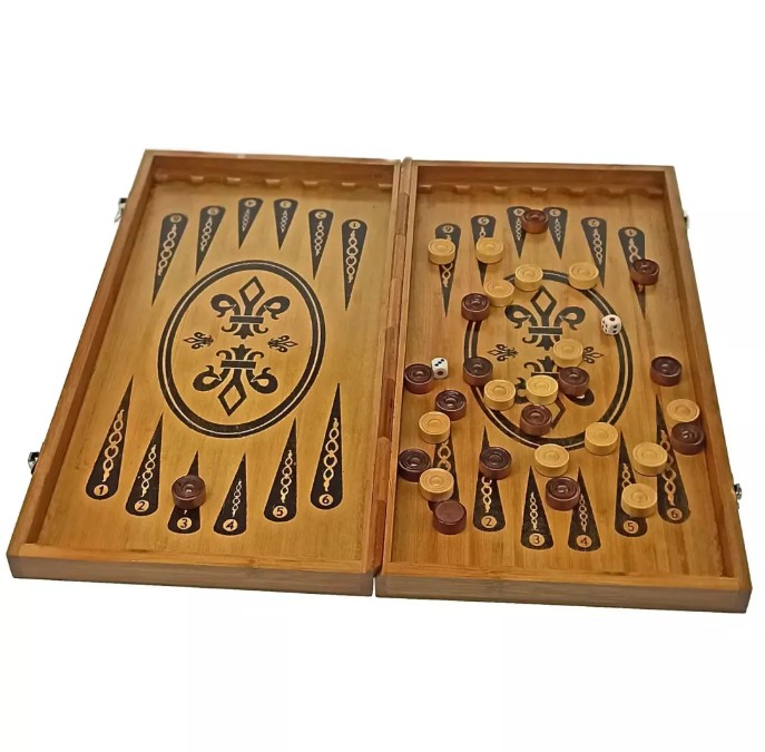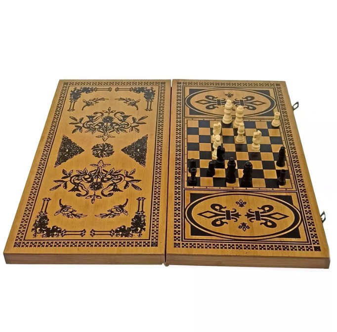 Настільний набір у східному стилі призначений для гри в шахи, нарди та шашки. В одному комплекті поєднано три класичні ігри, що робить його зручним для різноманітного дозвілля.