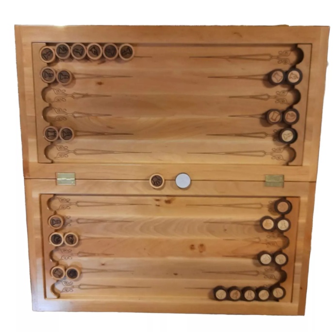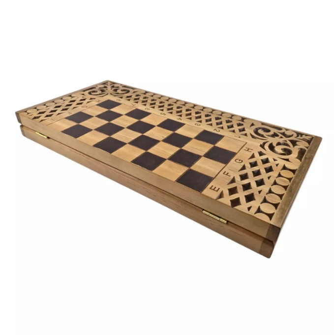 Дошка виготовлена з масиву дерева та оздоблена різьбленням по краях, що надає їй виразного вигляду. Розмір ігрового поля становить 56 × 56 см, у складеному вигляді — 56 × 28 × 4,5 см. У розкладеному вигляді поверхня зручна для повноцінної гри, а у складеному — компактна для зберігання.