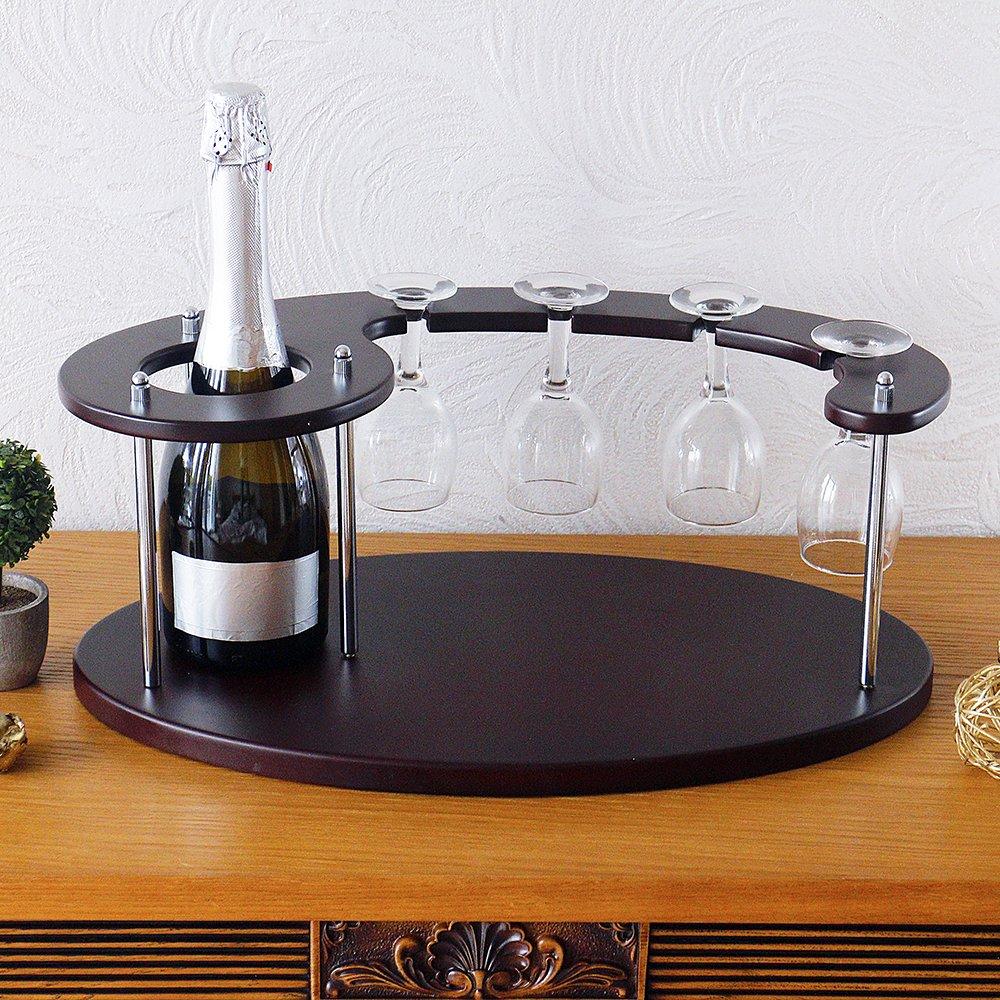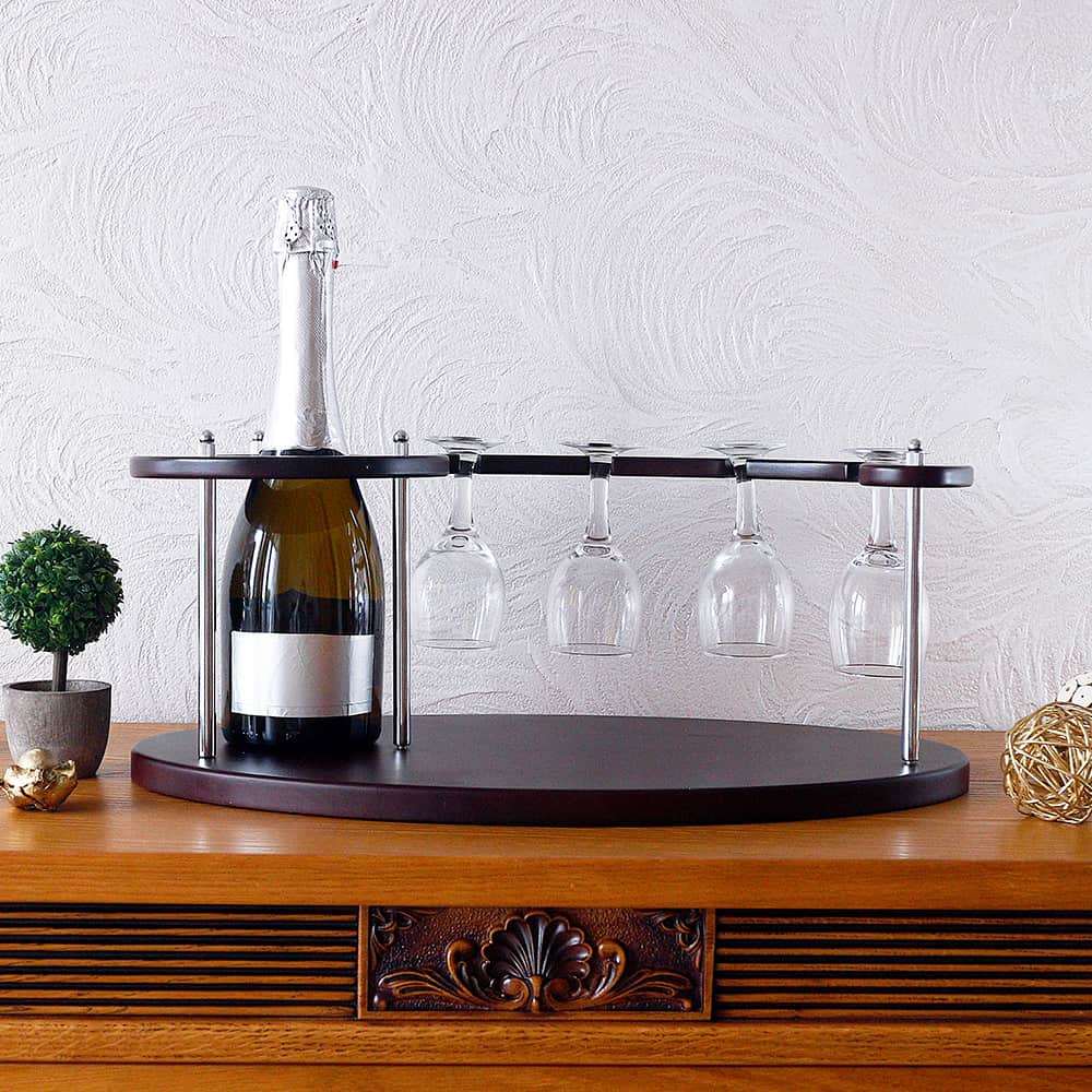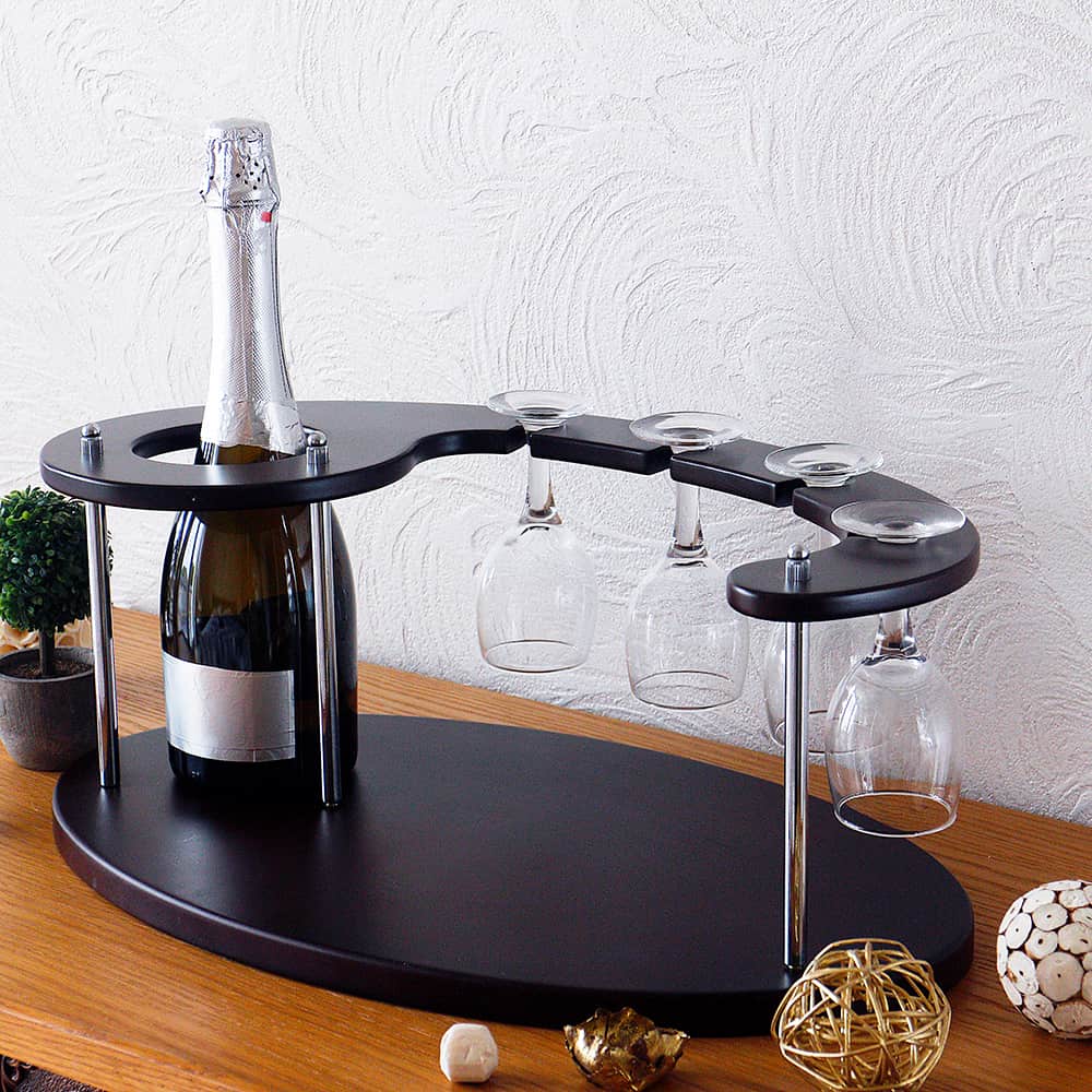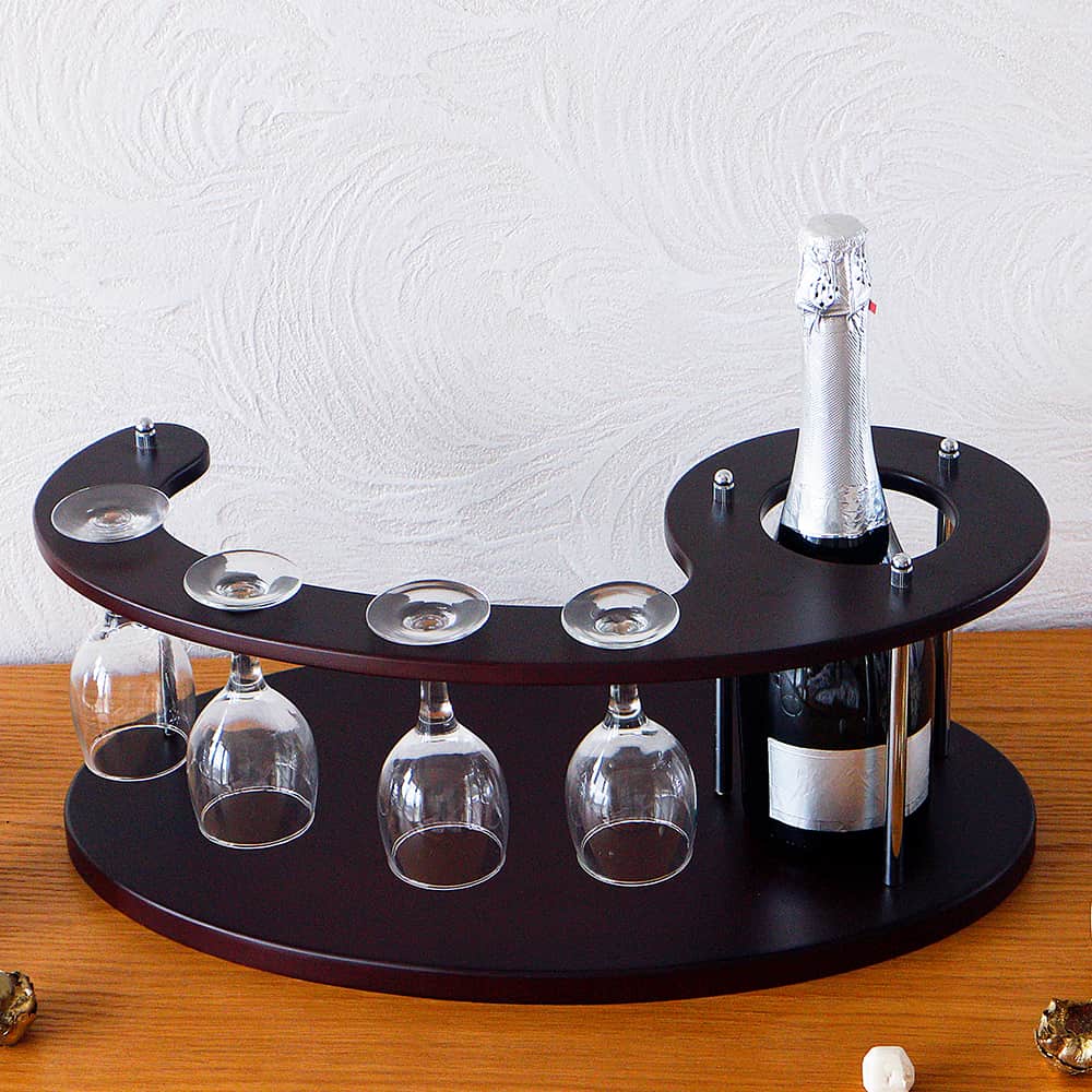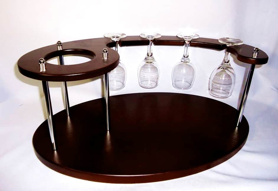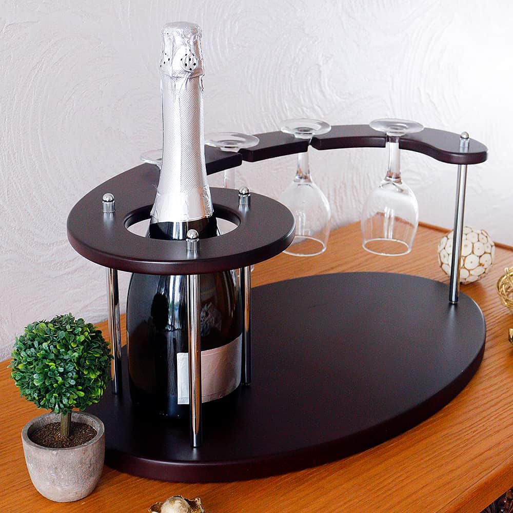 Цей дерев’яний подіум більше нагадує сценічне оформлення, ніж звичайну підставку для скляного посуду. Водночас такий міні-бар повністю виконує свої функції. Вільна поверхня зручно підходить для розміщення вази з фруктами або страви з різноманітними закусками до напоїв.