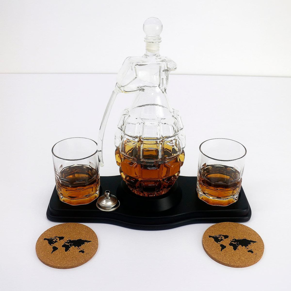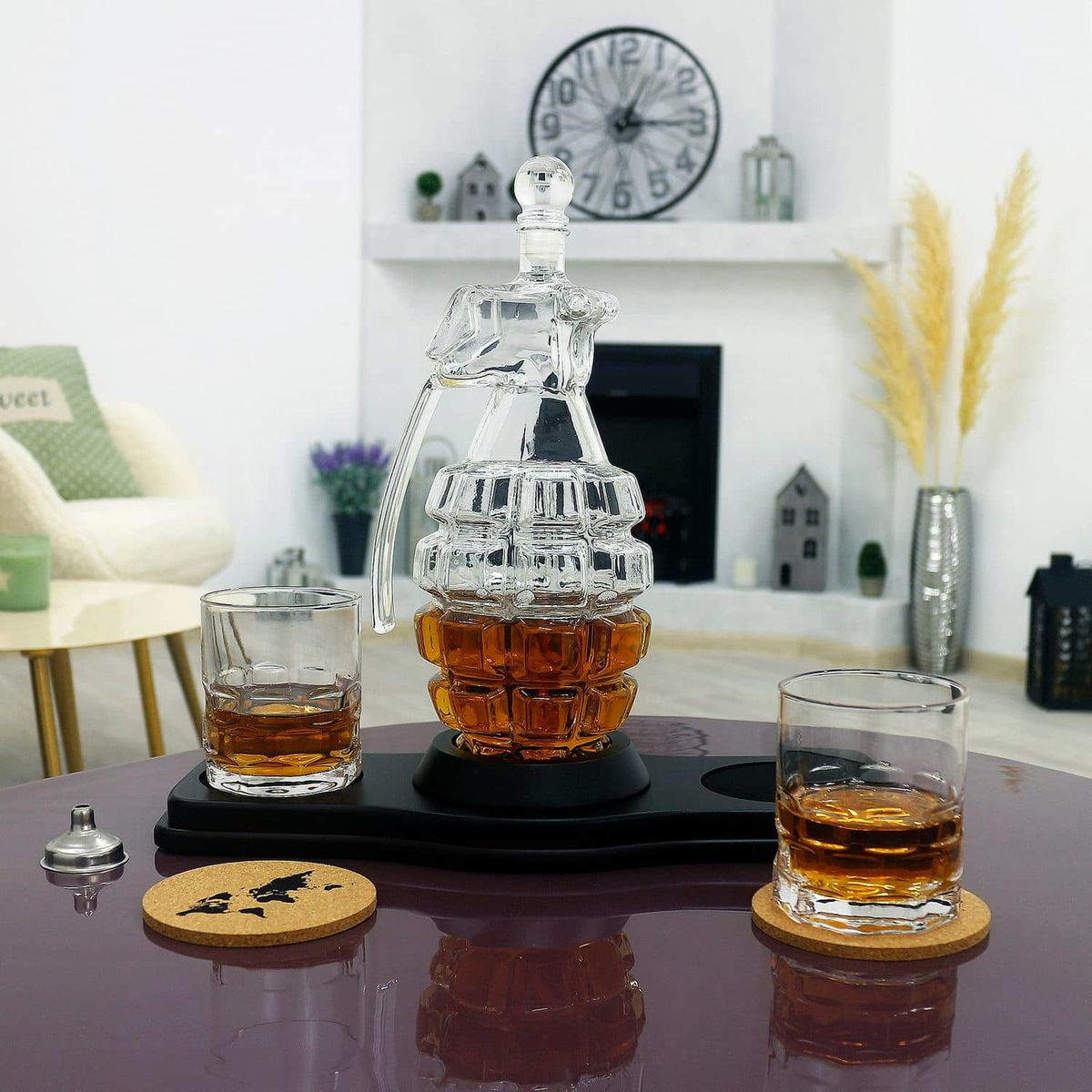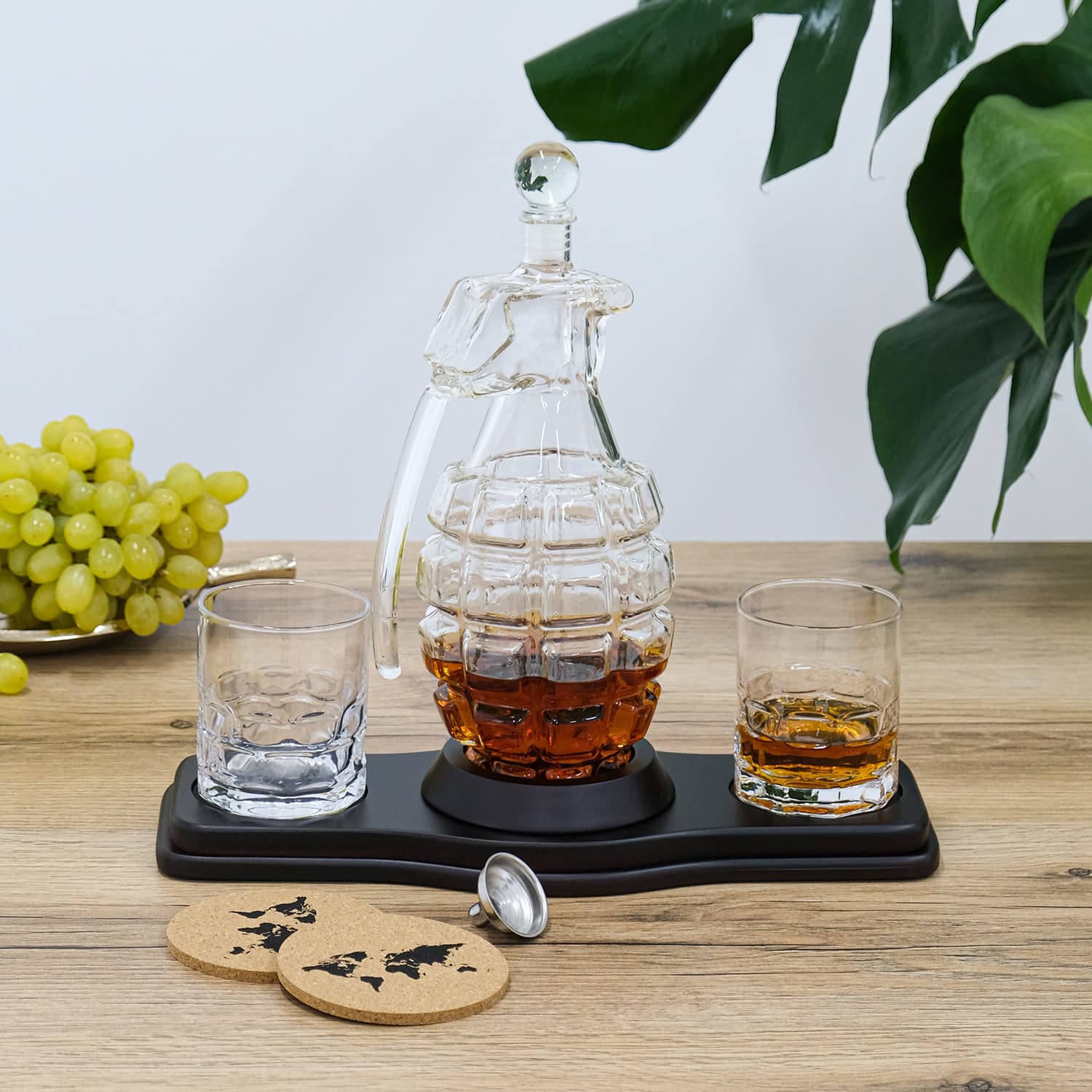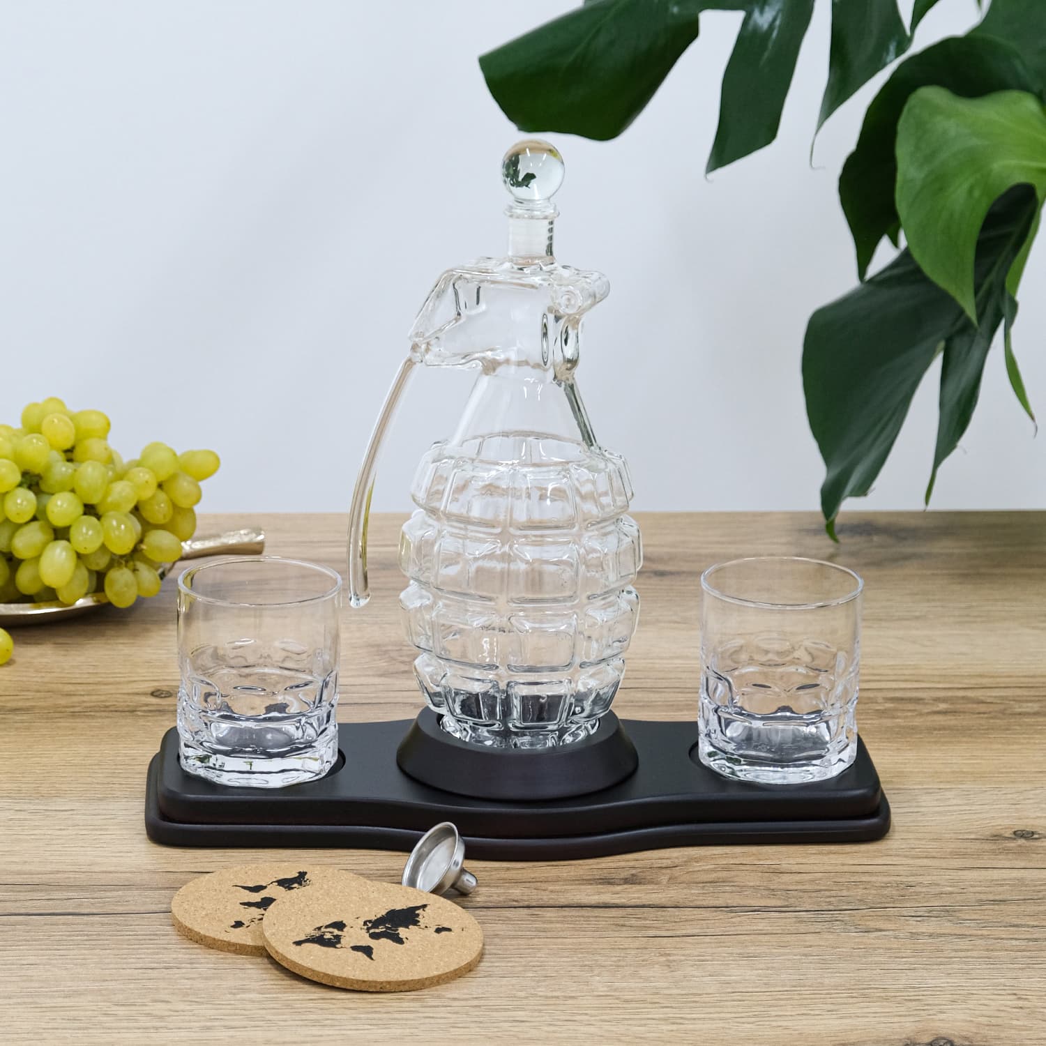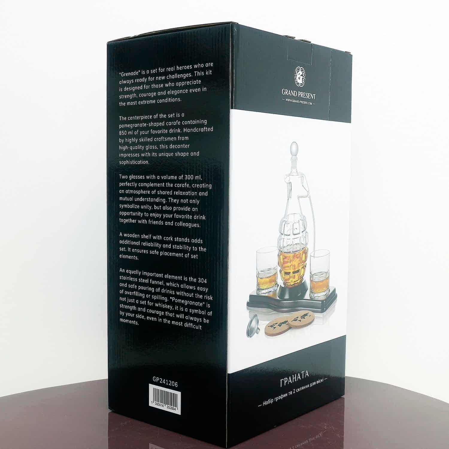 - Скляний декантер (850 мл) - елегантний графін у формі гранати, що символізує силу, рішучість та готовність до дій. Він стане центральною прикрасою будь-якого бару, привертаючи увагу своєю унікальністю.