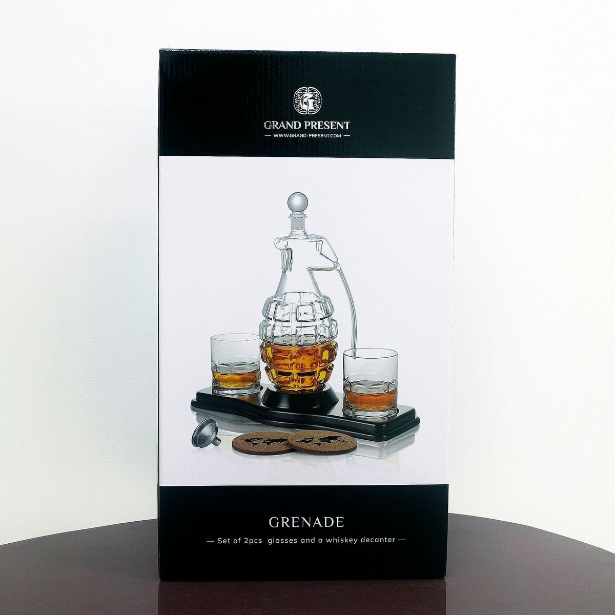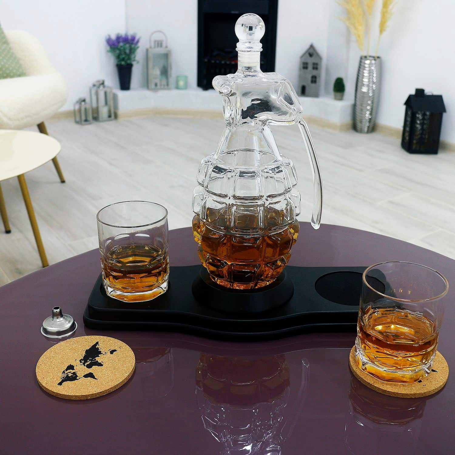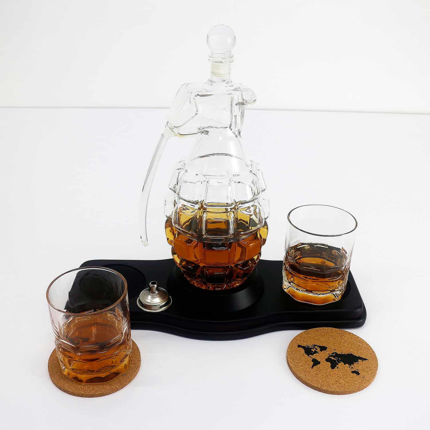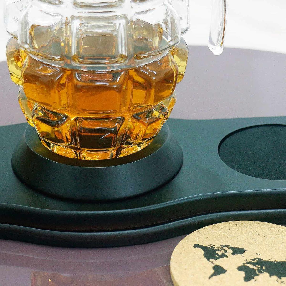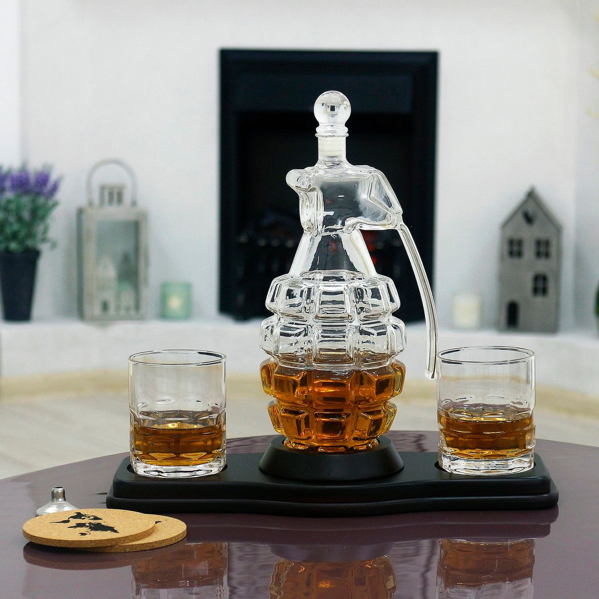 - Скляний декантер (850 мл) - елегантний графін у формі гранати, що символізує силу, рішучість та готовність до дій. Він стане центральною прикрасою будь-якого бару, привертаючи увагу своєю унікальністю.