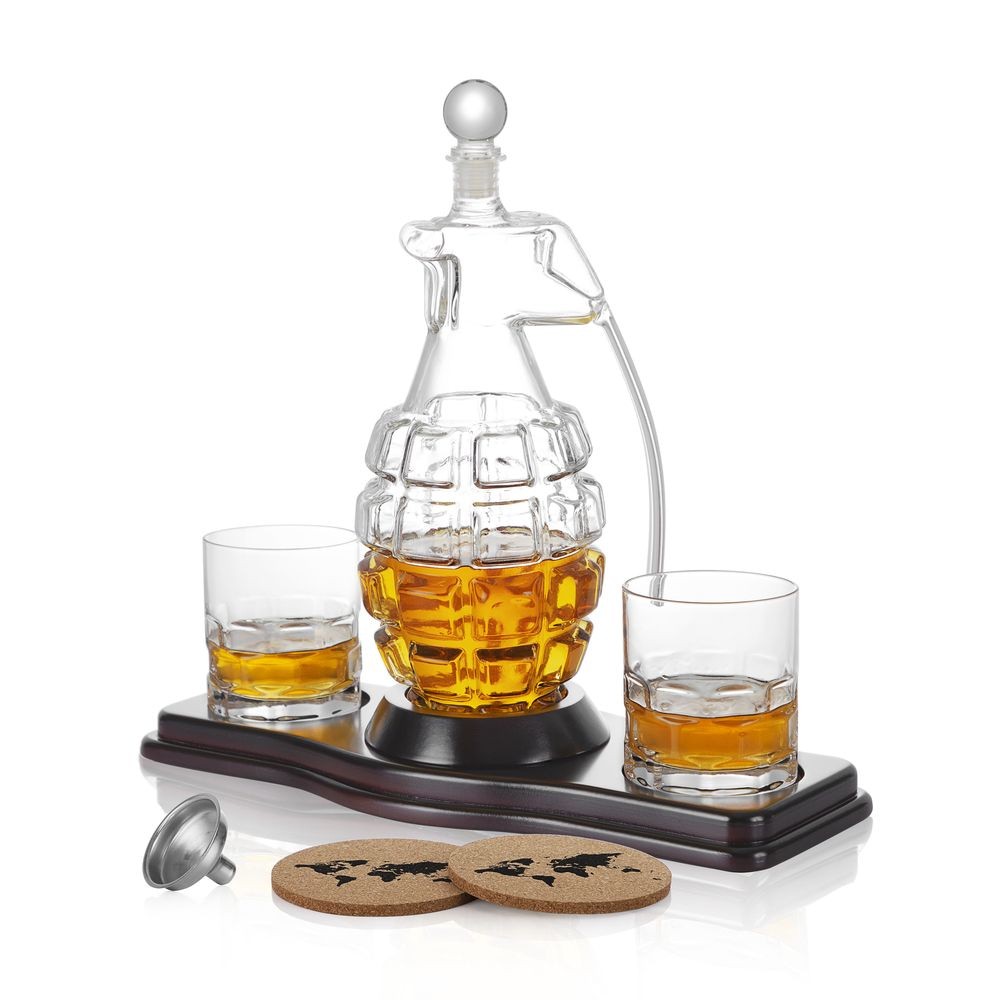 Графін у формі гранати несе в собі глибокий символізм, особливо для військових і колекціонерів. Граната втілює силу, рішучість та готовність до дій, що робить цей набір чудовим подарунком для тих, хто цінує ці якості. Він також може бути символом пошани та пам’яті про тих, хто служив чи служить у збройних силах, підкреслюючи їхню мужність і самовідданість.