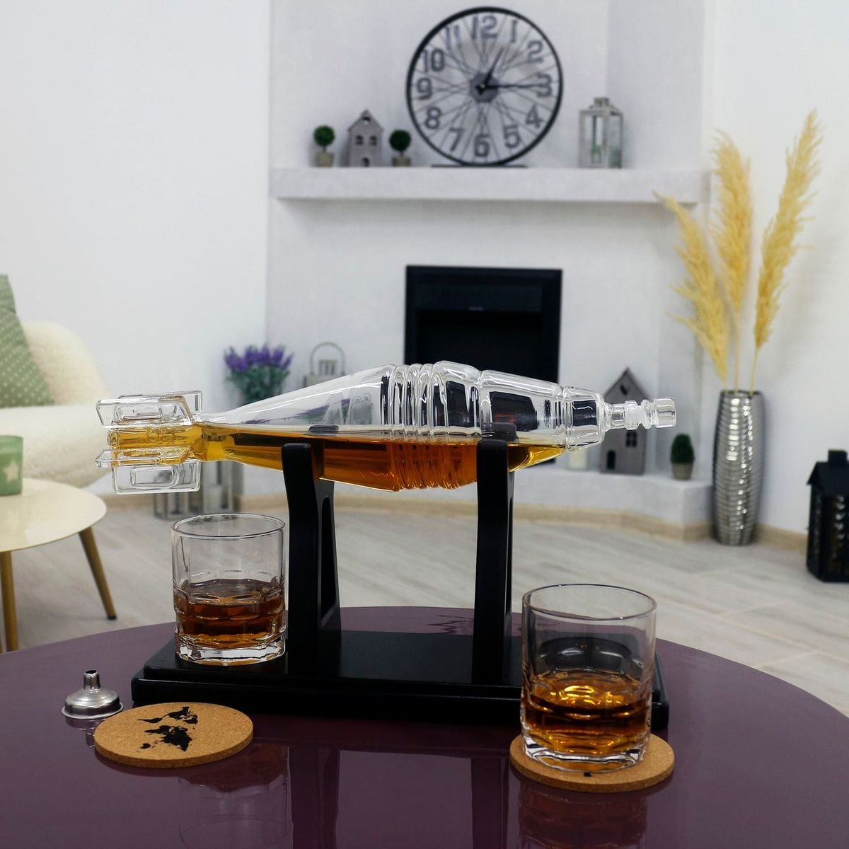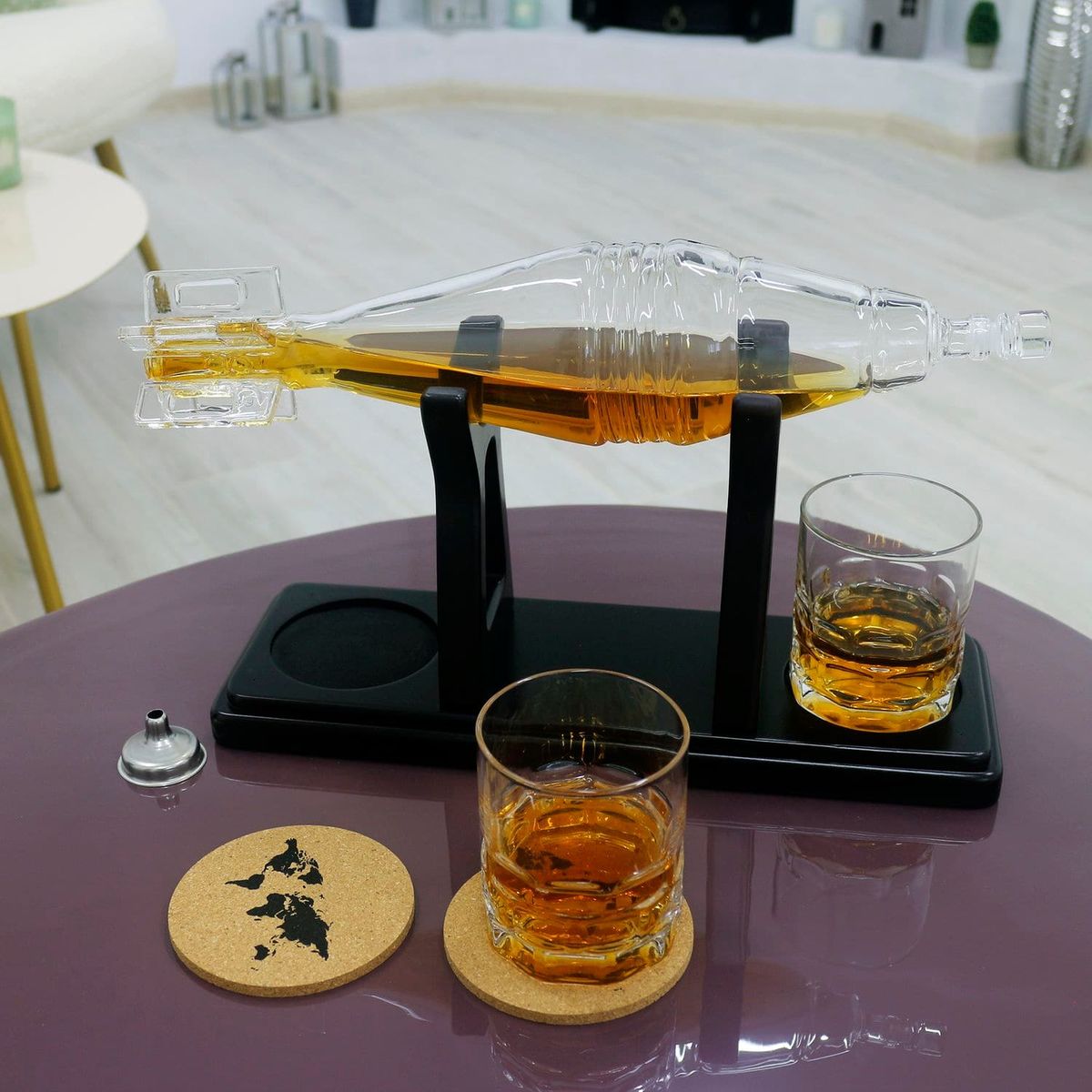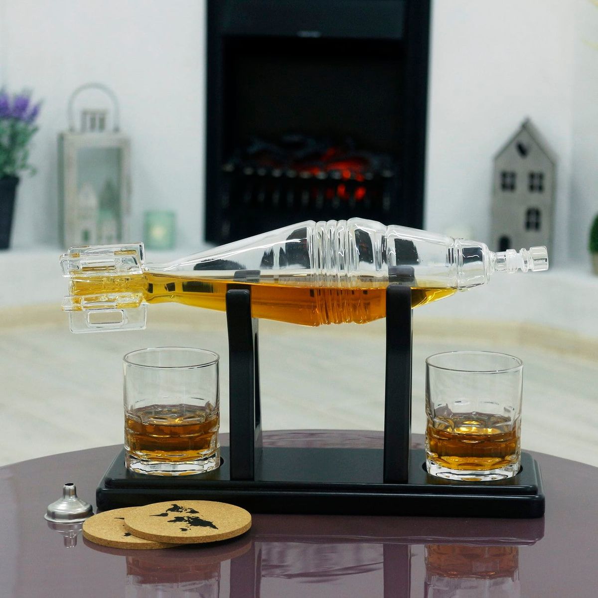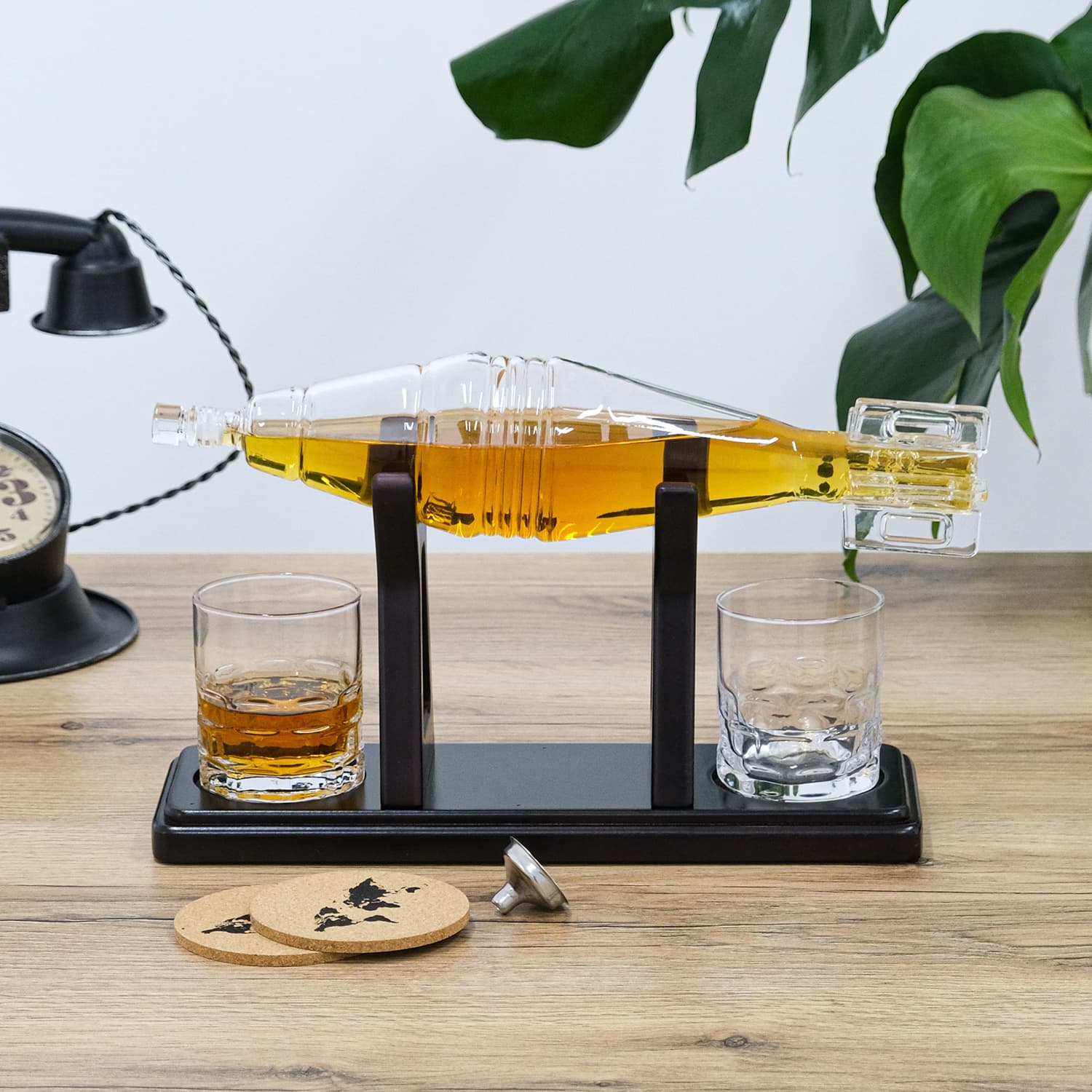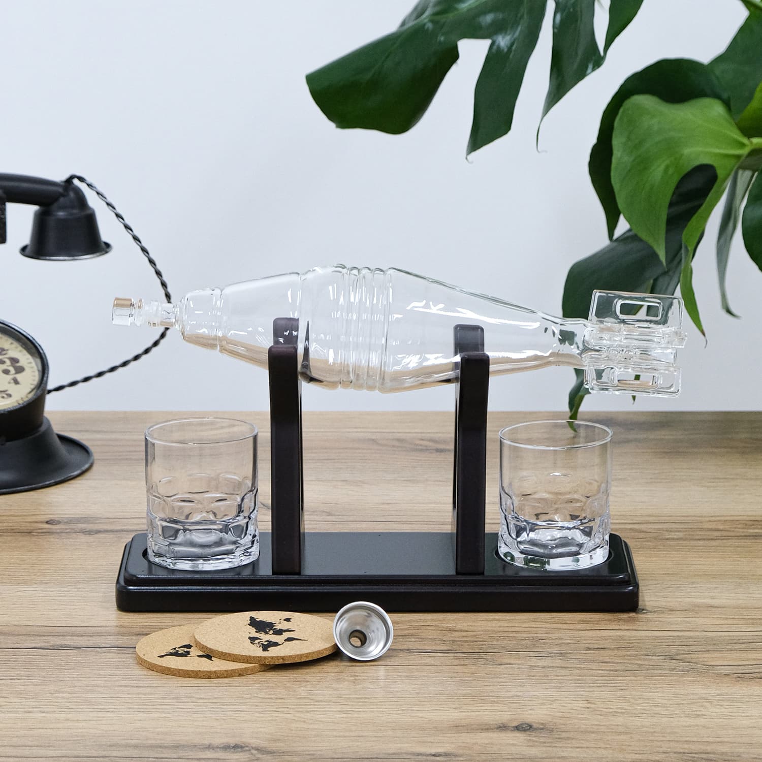 Подставка из темного дерева придает элегантность набору и обеспечивает удобное хранение. Воронка из нержавеющей стали: Облегчает процесс аккуратного разлива напитков.Пробочные подставки предохраняют поверхности от следов напитков и придают комплекту изящества.