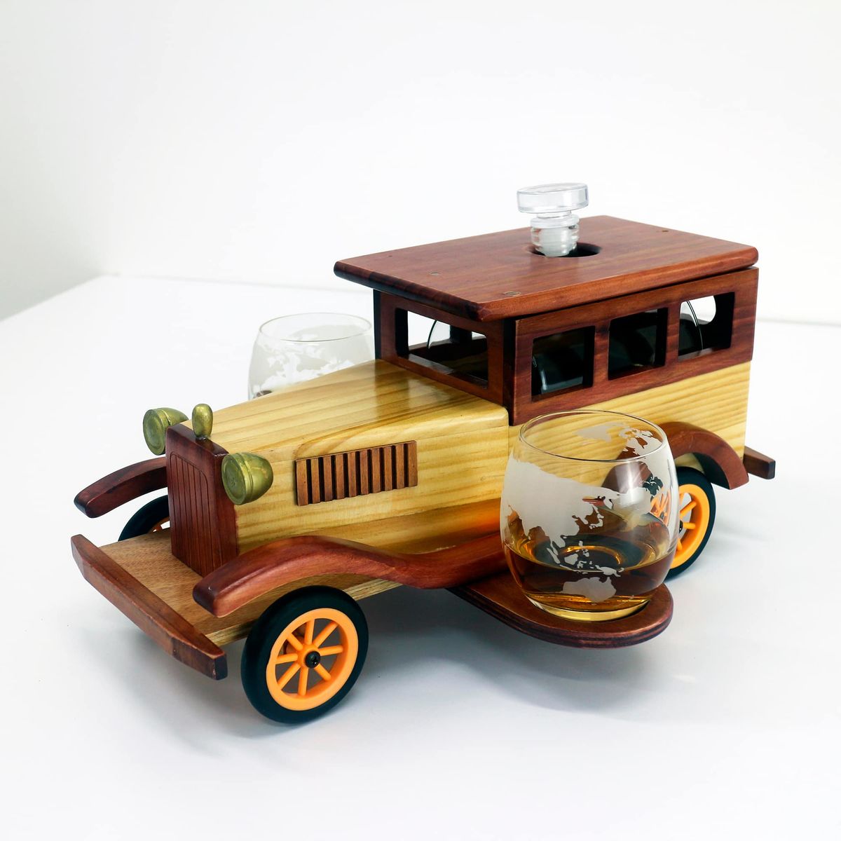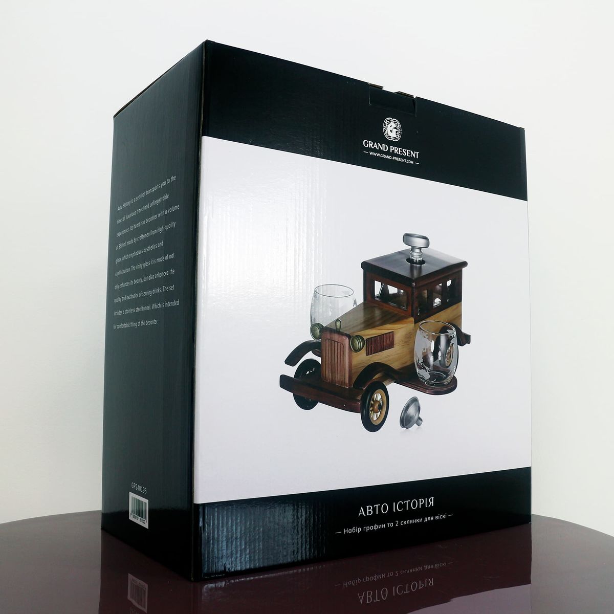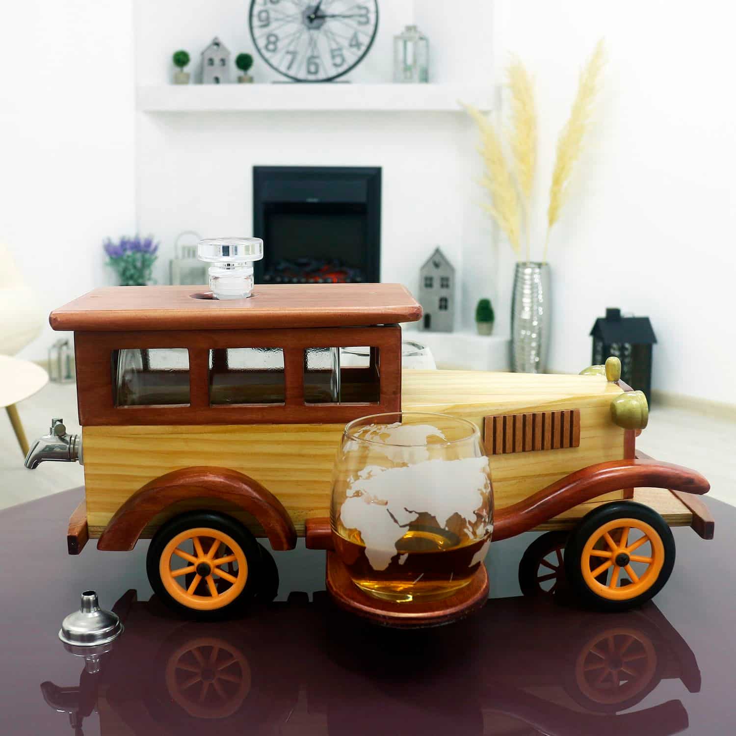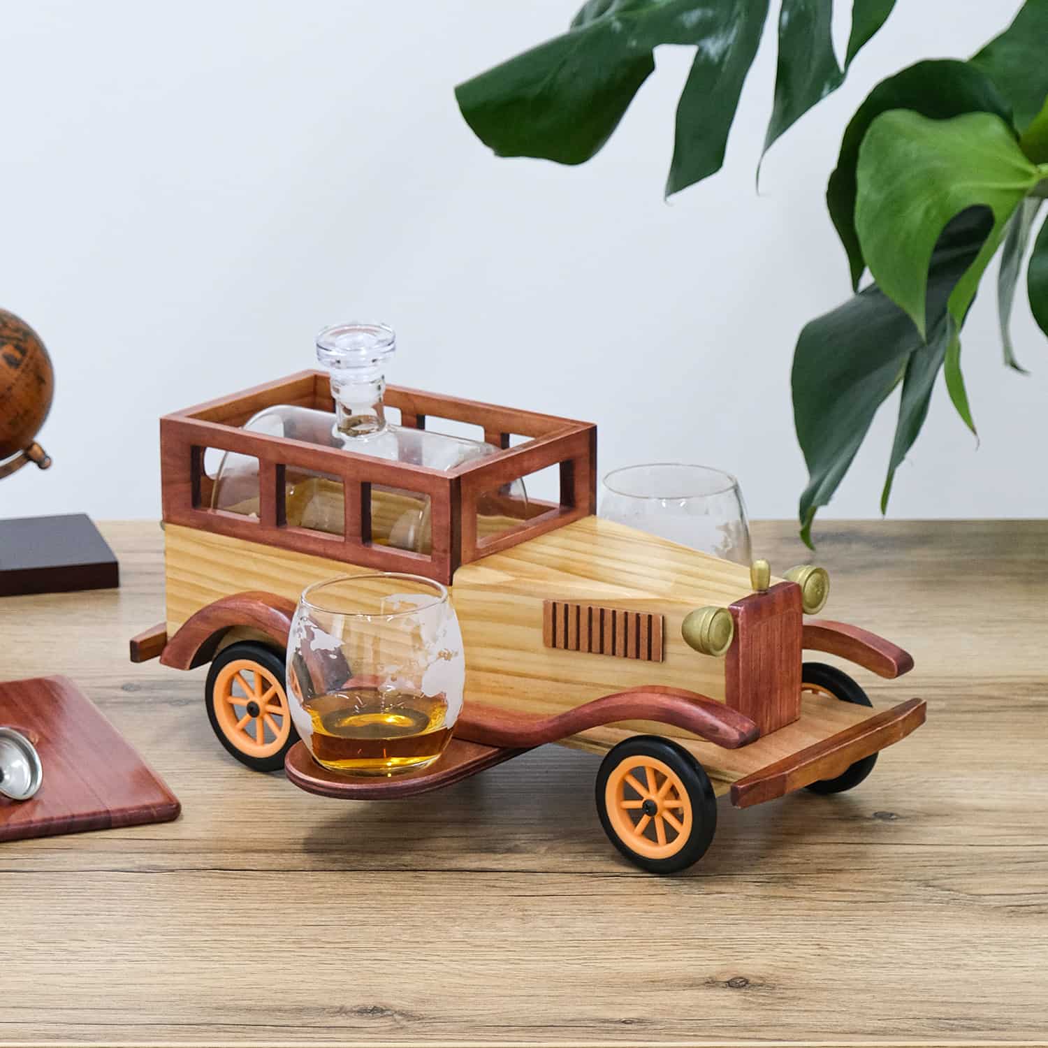У комплект входить скляний графин об’ємом 850 мл, дві склянки для віскі та лійка з нержавіючої сталі, що робить його не лише ефектним, а й практичним у використанні. Головний акцент — основа у вигляді ретроавтомобіля з натурального дерева теплого коричневого відтінку, яка надає набору унікальності та перетворює його на яскравий елемент інтер’єру.