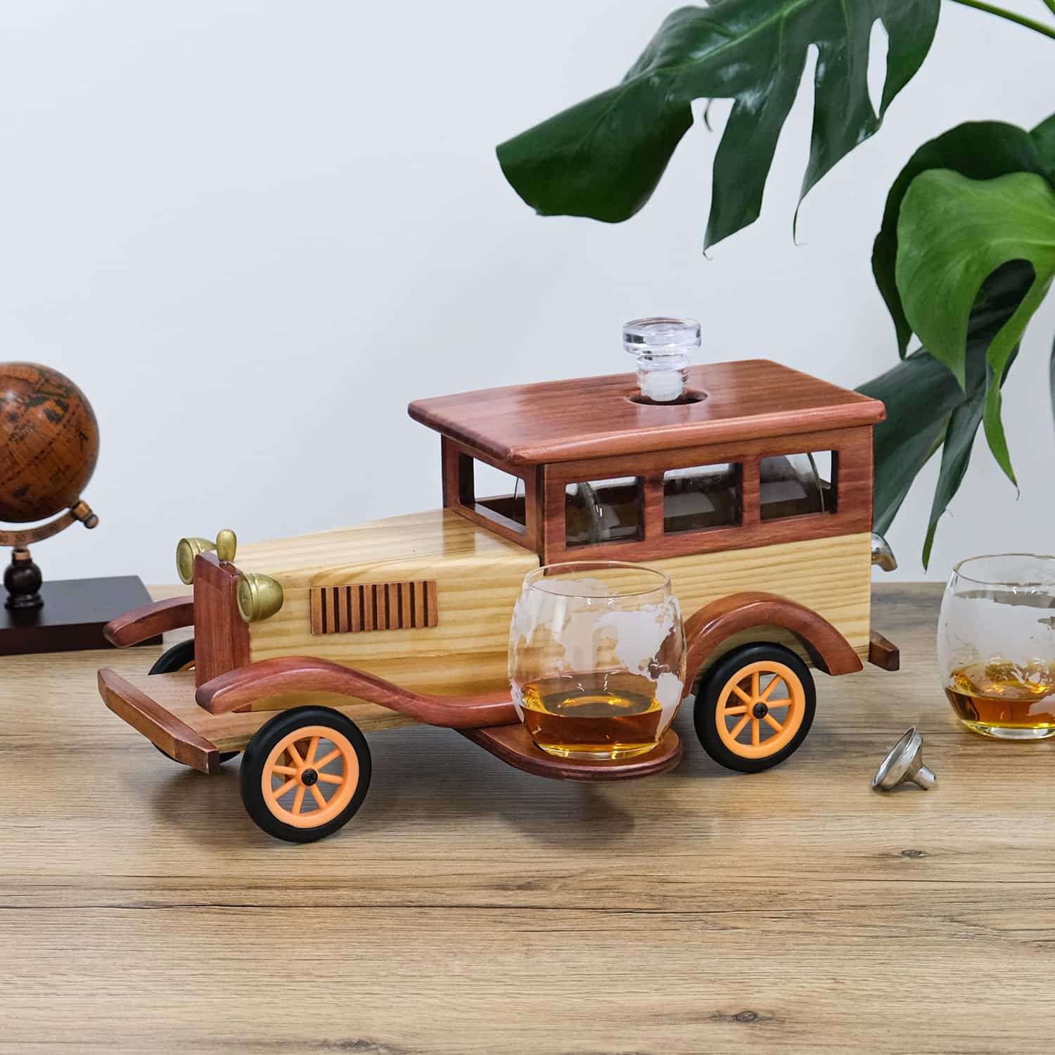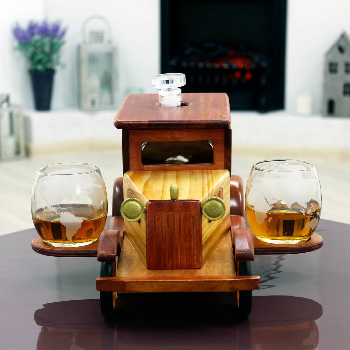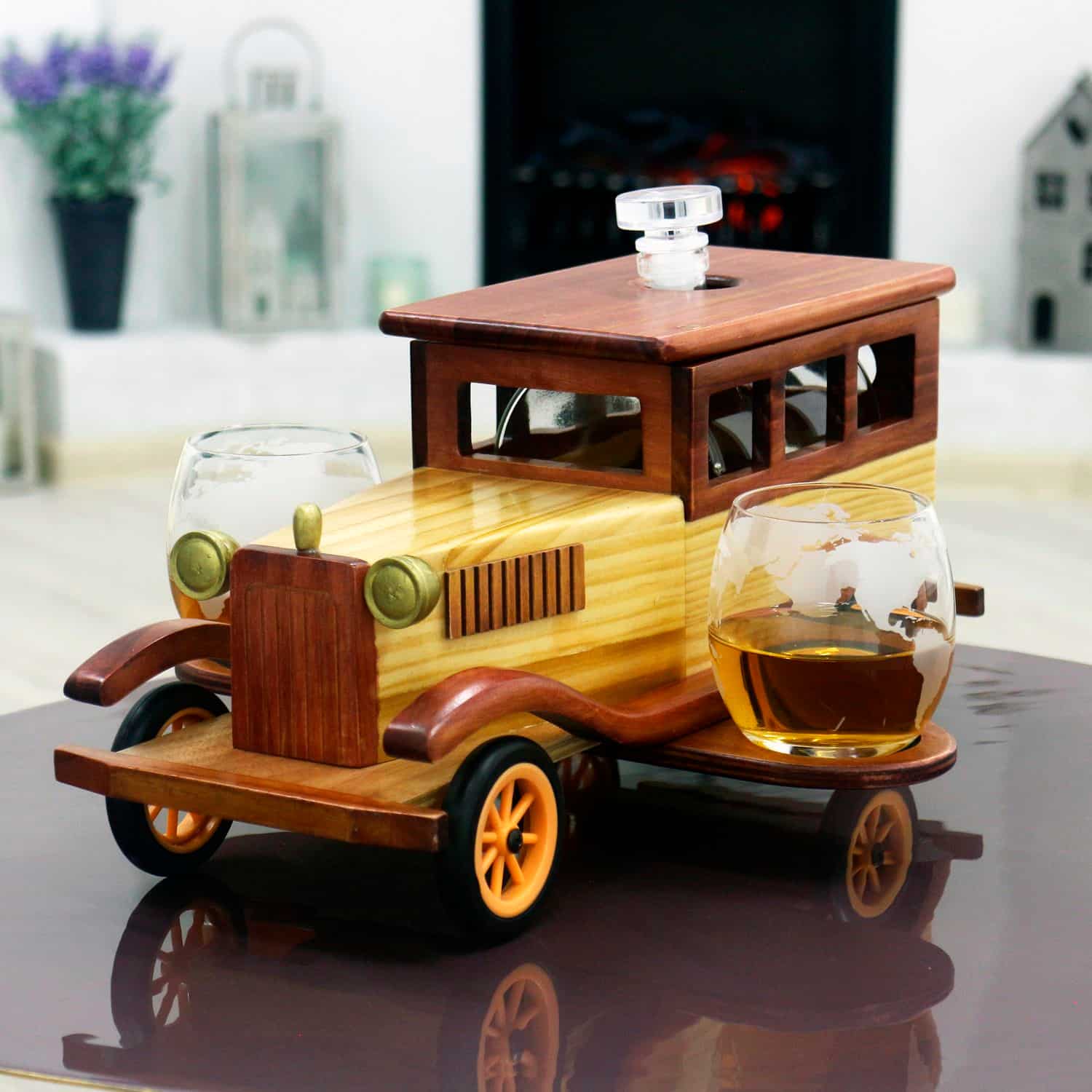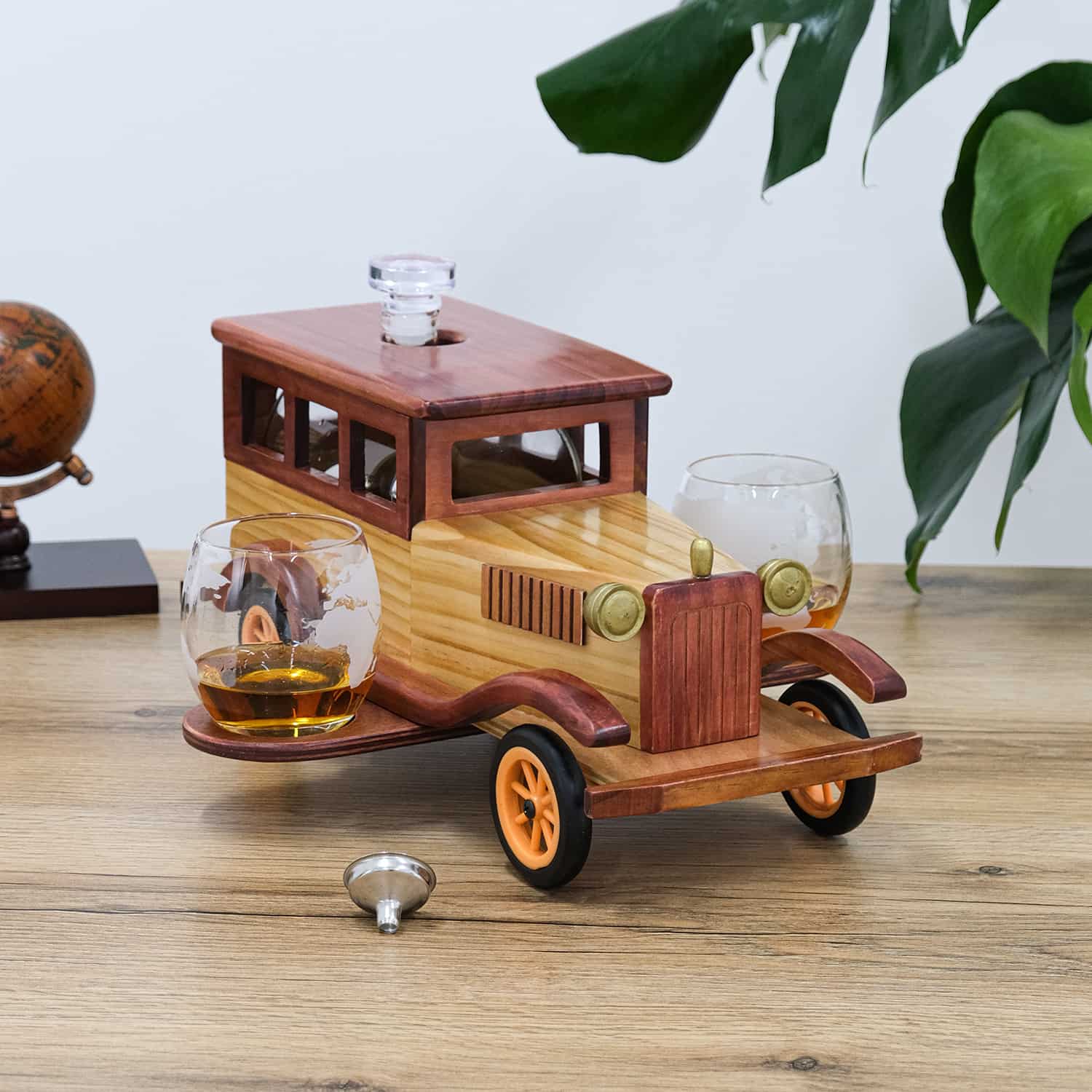 У комплект входить скляний графин об’ємом 850 мл, дві склянки для віскі та лійка з нержавіючої сталі, що робить його не лише ефектним, а й практичним у використанні. Головний акцент — основа у вигляді ретроавтомобіля з натурального дерева теплого коричневого відтінку, яка надає набору унікальності та перетворює його на яскравий елемент інтер’єру.