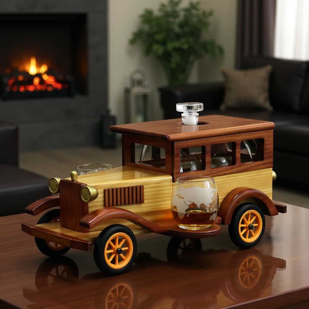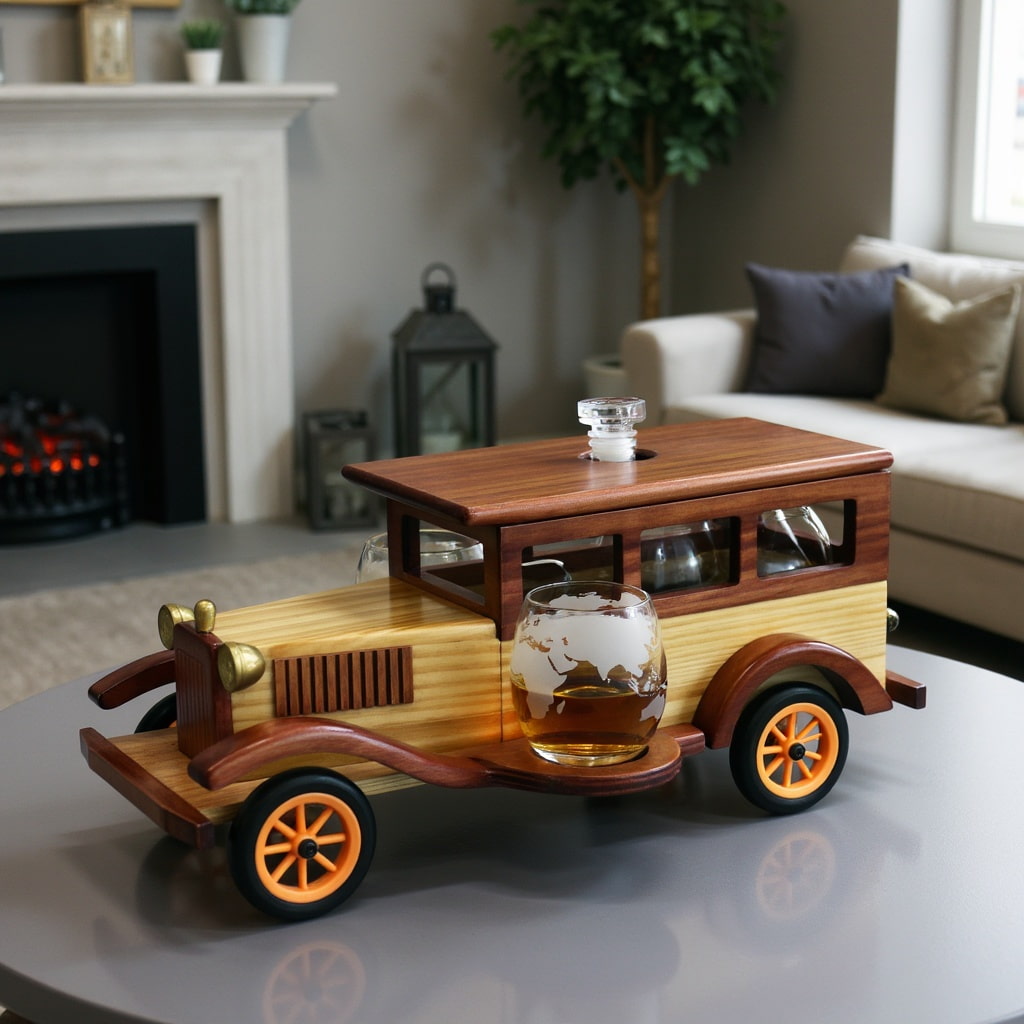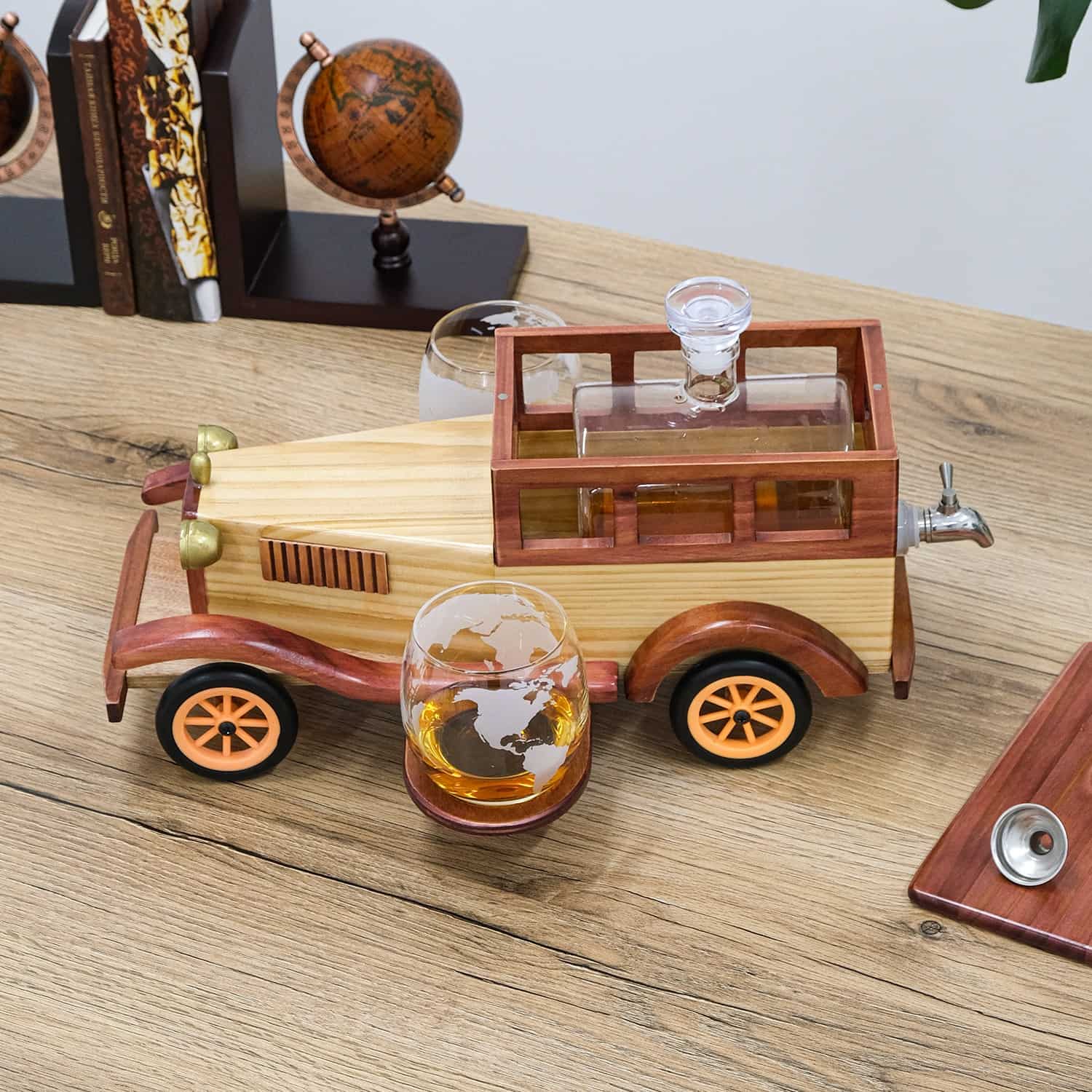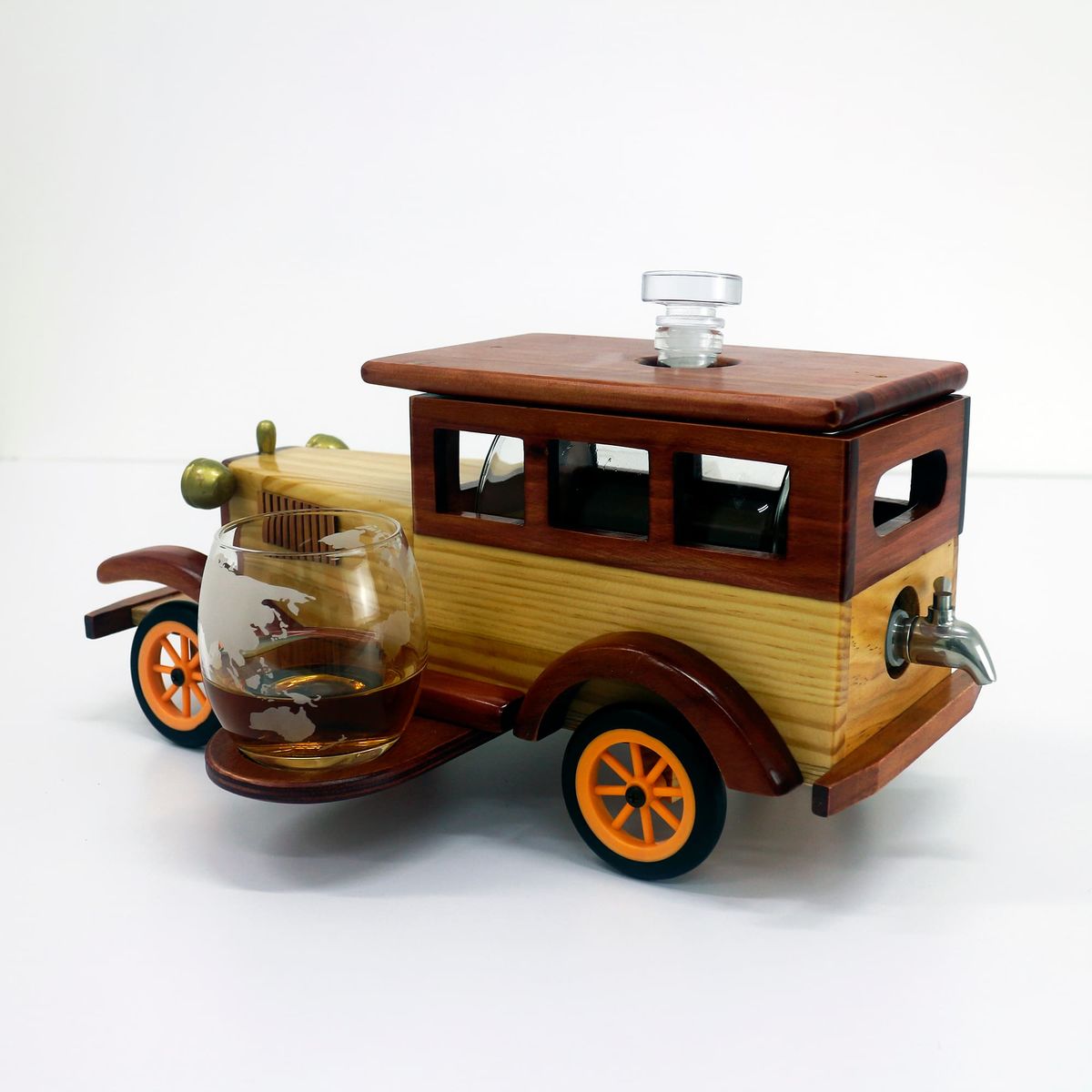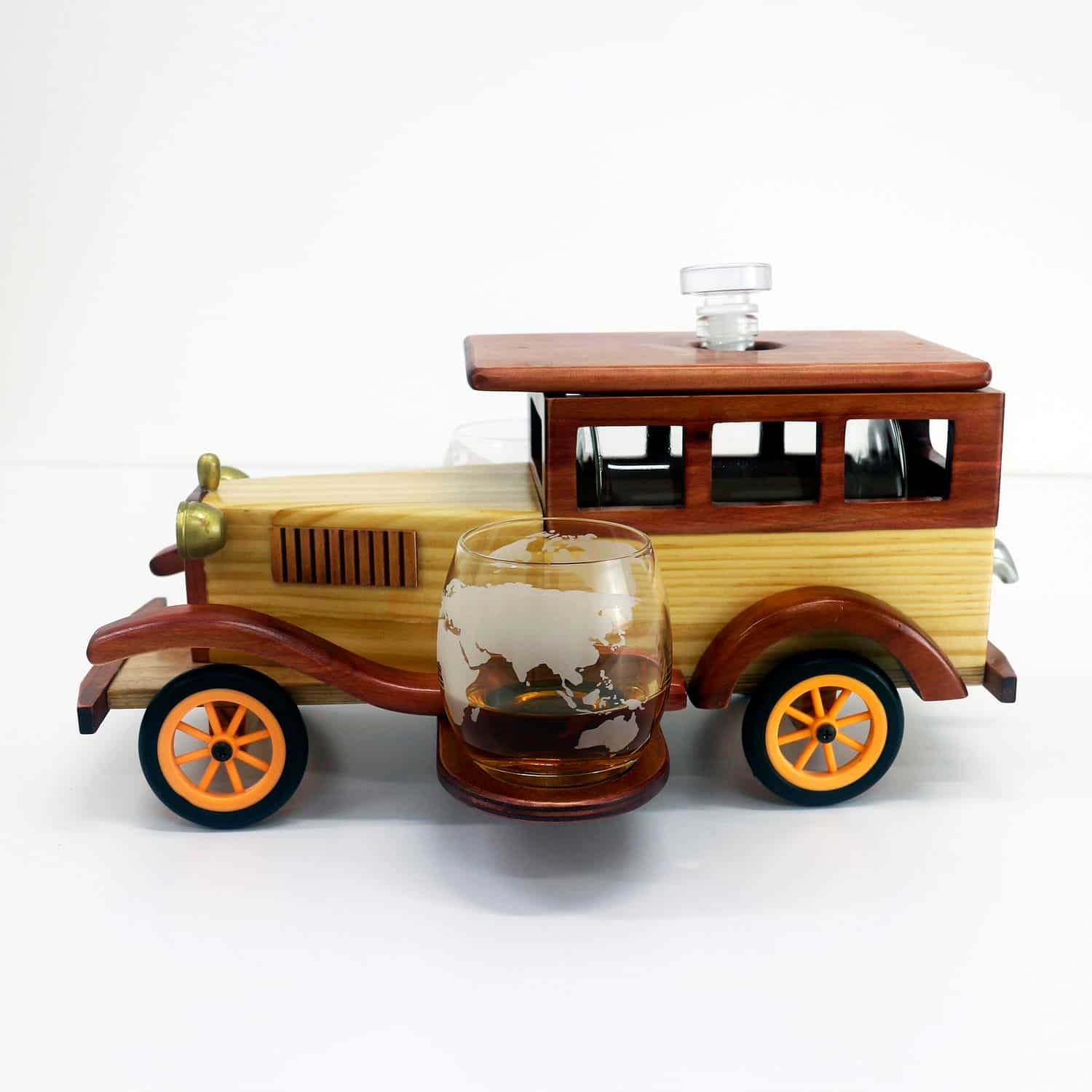 У комплект входить скляний графин об’ємом 850 мл, дві склянки для віскі та лійка з нержавіючої сталі, що робить його не лише ефектним, а й практичним у використанні. Головний акцент — основа у вигляді ретроавтомобіля з натурального дерева теплого коричневого відтінку, яка надає набору унікальності та перетворює його на яскравий елемент інтер’єру.