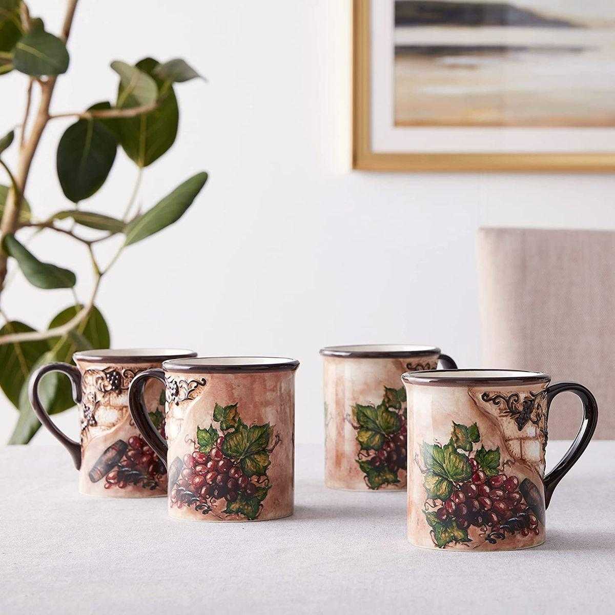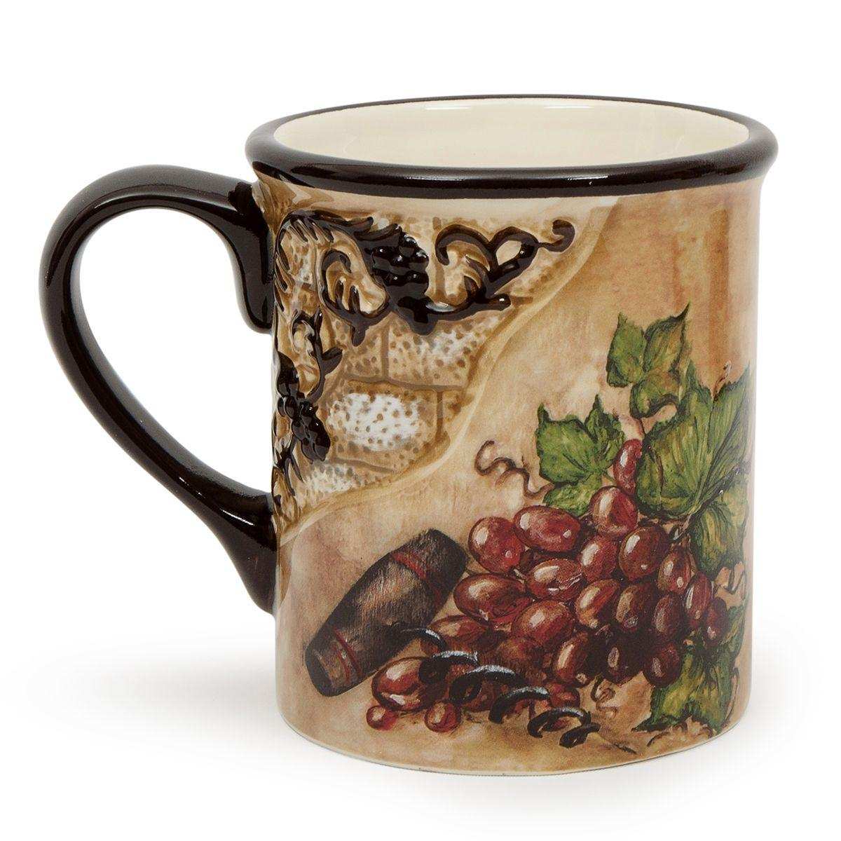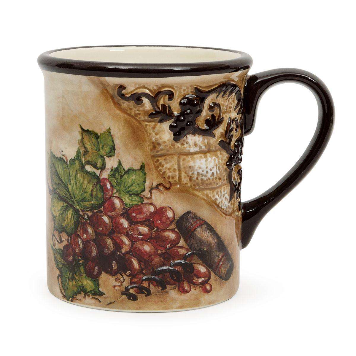 Кружки оформлені натюрмортами зі стиглим виноградом і штопором, розміщеними на тлі стіни давнього будинку зі старою потрісканою штукатуркою. Об’ємний елемент у формі кам’яної кладки доповнений рельєфною гроною винограду темно-коричневого відтінку — саме такого, як колір ручок та обідків виробів із глазурованої кераміки. Кружки прекрасно поєднуються зі столовими доріжками з мереживом, наприклад, Spitze від Villa Grazia.