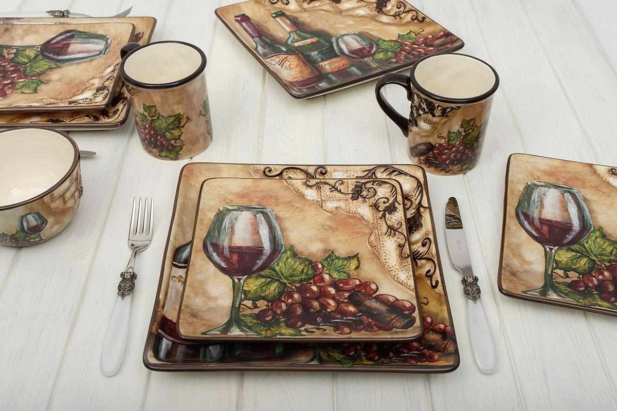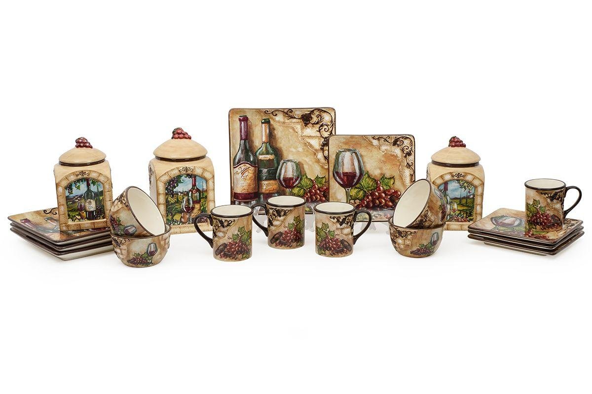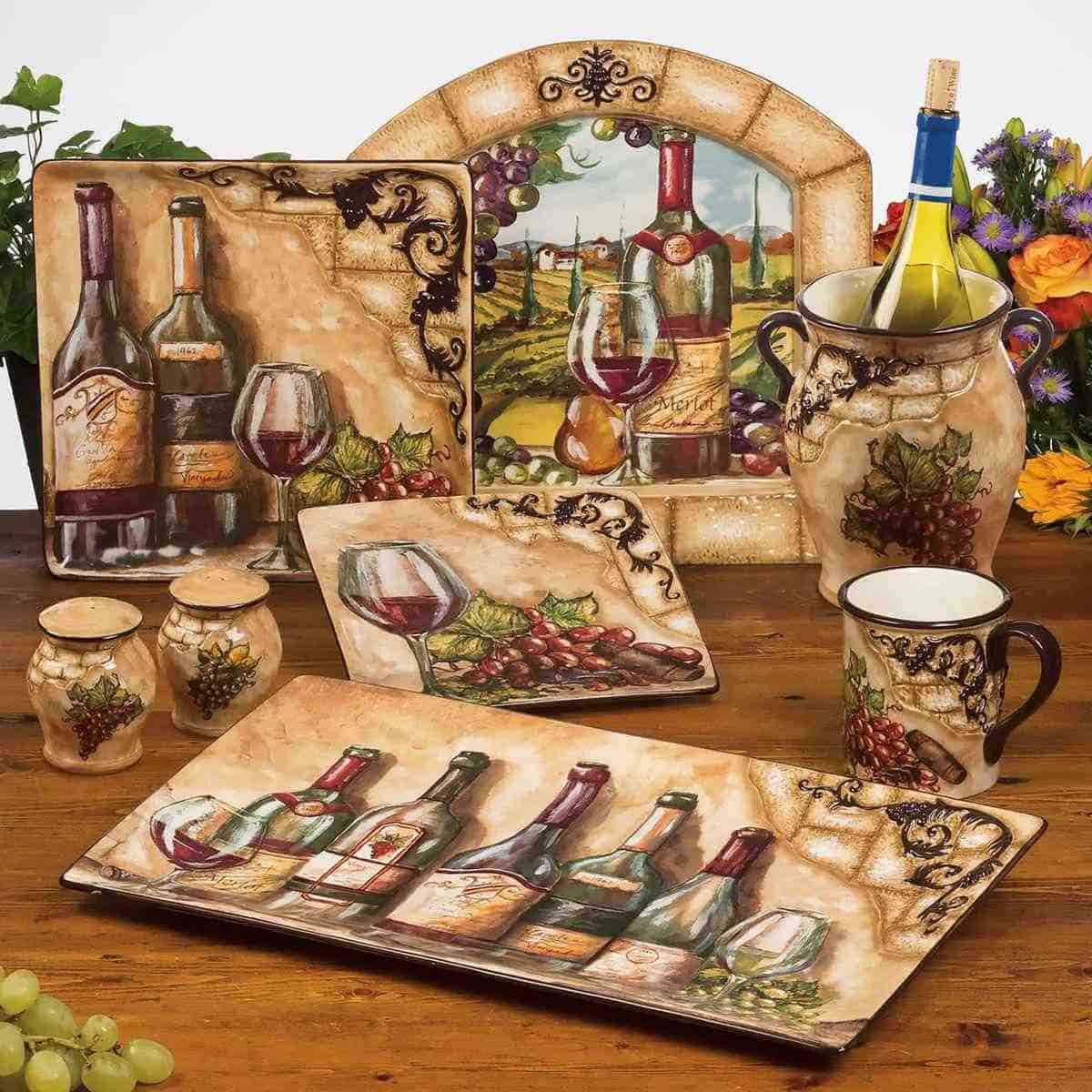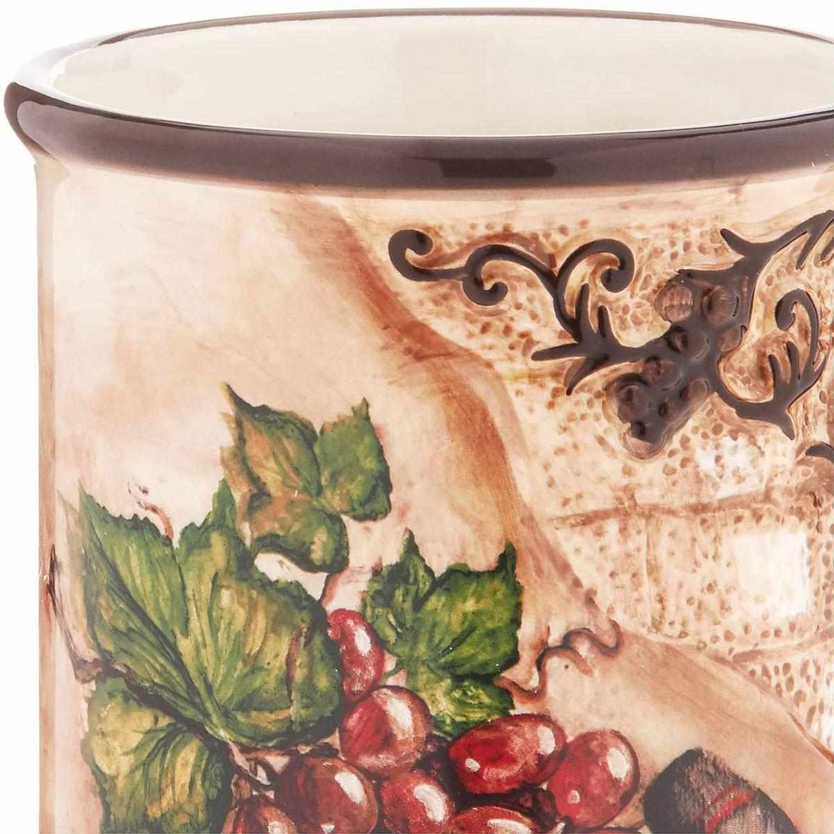 Кружки оформлені натюрмортами зі стиглим виноградом і штопором, розміщеними на тлі стіни давнього будинку зі старою потрісканою штукатуркою. Об’ємний елемент у формі кам’яної кладки доповнений рельєфною гроною винограду темно-коричневого відтінку — саме такого, як колір ручок та обідків виробів із глазурованої кераміки. Кружки прекрасно поєднуються зі столовими доріжками з мереживом, наприклад, Spitze від Villa Grazia.